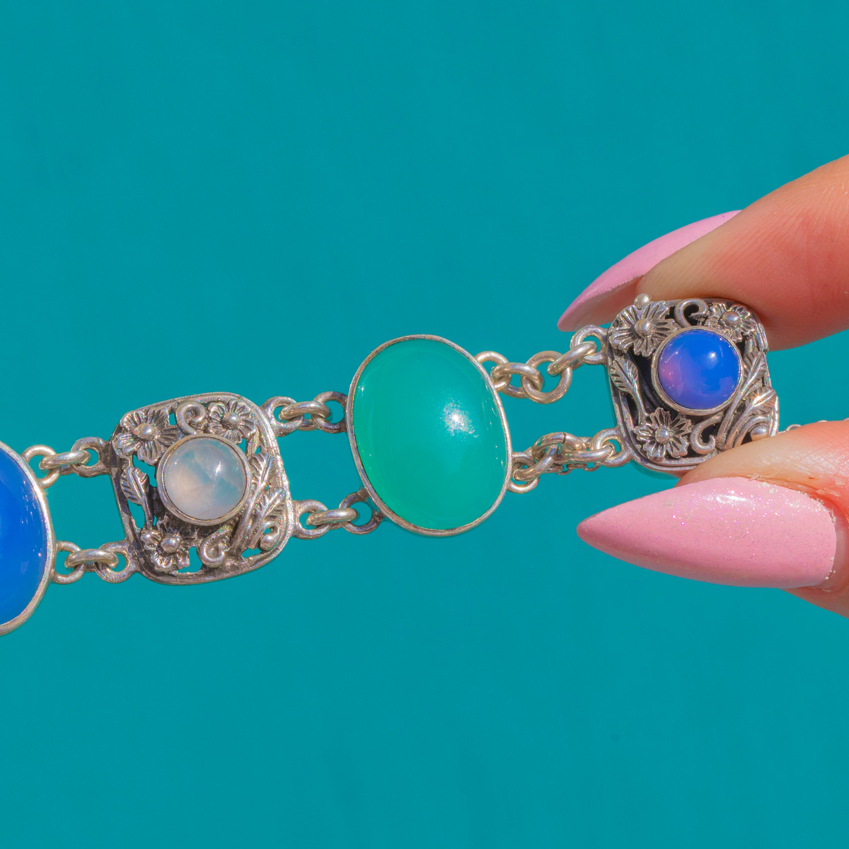 A signed Thomas Mott & Co. Sterling Silver multi-gem bracelet with a sumptuous, painterly palette and beautiful mid-century finesse. Alternating openwork floral plaques and smooth cabochons create a rhythmic flow of colour: deep Carnelian, verdant Green Chalcedony/Chrysoprase, organic Moss Agate, the soft blush of Rose Quartz and cool tones of Blue and Lilac Chalcedony.
