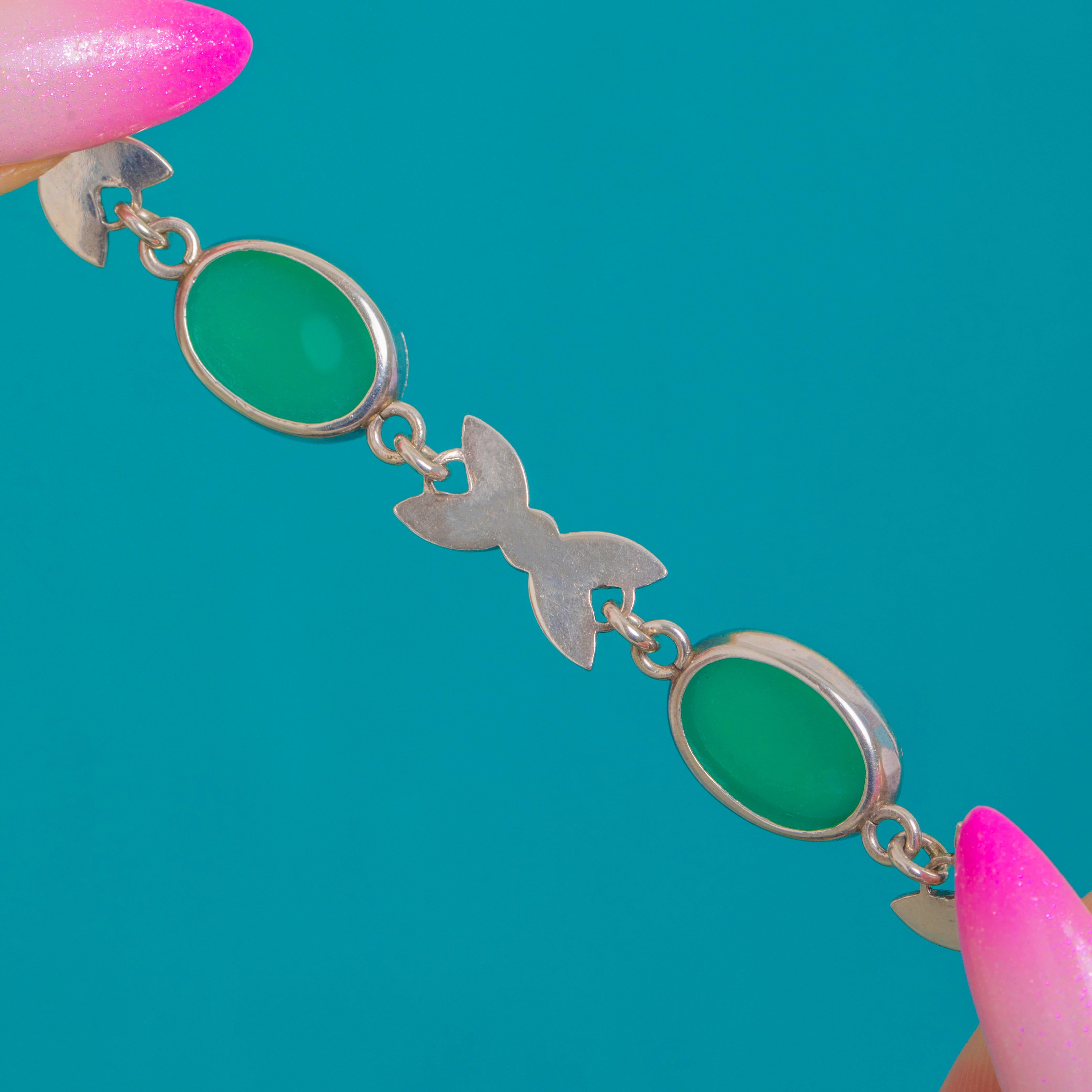 Supple and beautifully articulated on the wrist, it closes with a secure bolt-ring clasp. Fully English hallmarked for Birmingham with the date letter M for 1986, with Lion Passant marks to the Chrysoprase links, it’s a timeless touch of emerald-green glamour perfect for everyday elegance or evening sparkle.
