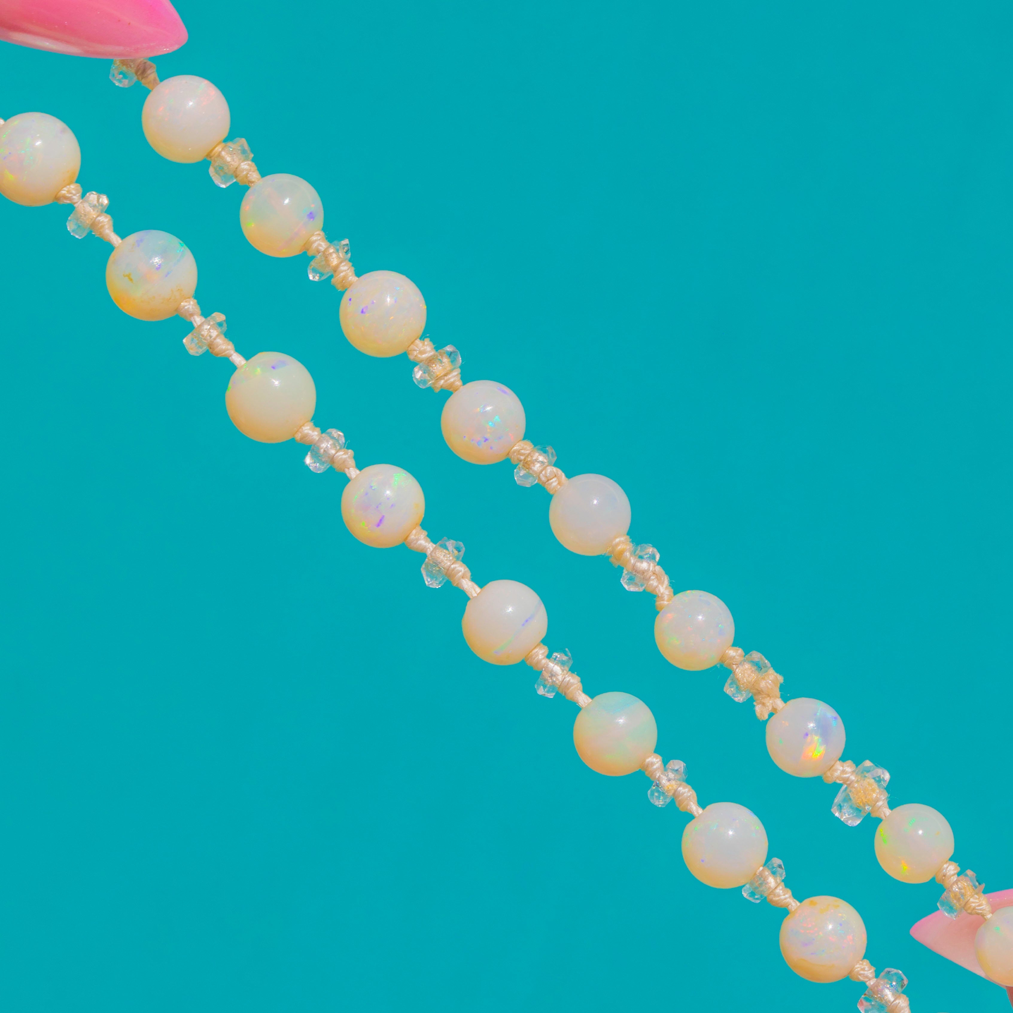 Glowing with ethereal colour, this Art Deco strand showcases Natural Opal beads that shimmer with delicate pastel flashes of pink, blue and green. Elegantly graduated and interspersed with sparkling Rock Crystal rondelles, each bead is hand-knotted on cord for a fluid, refined drape.