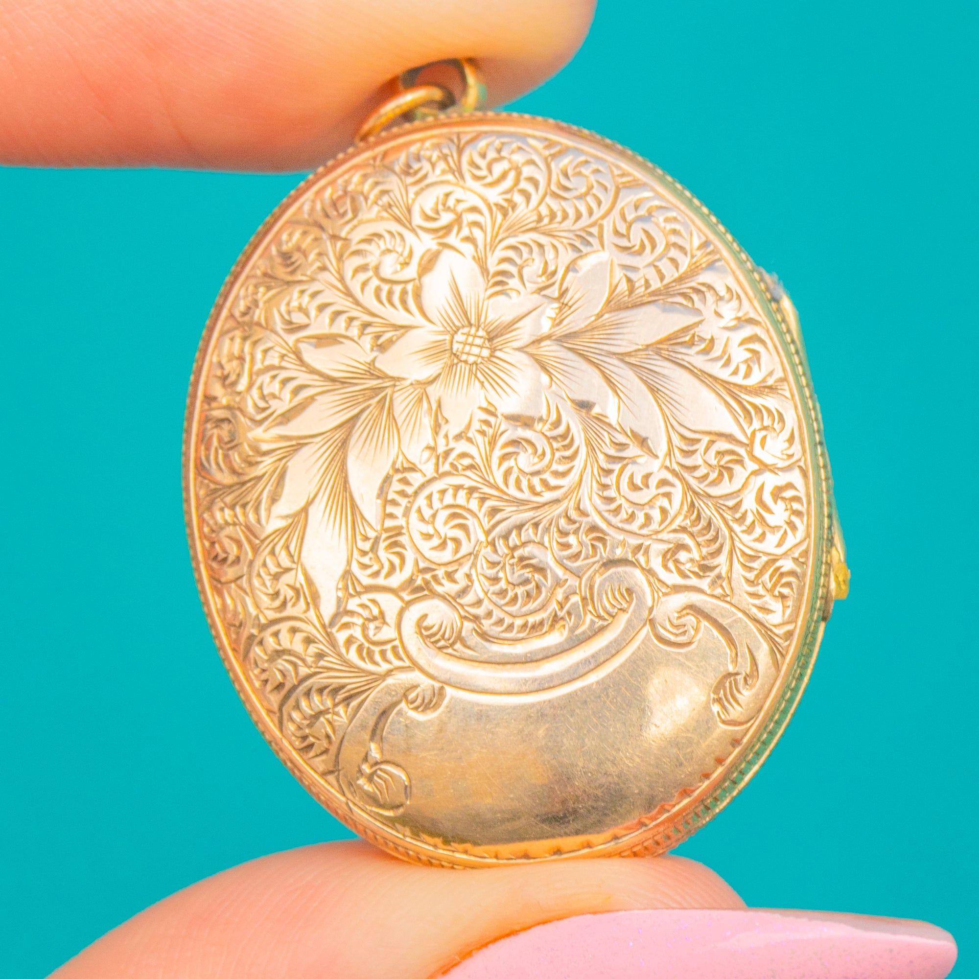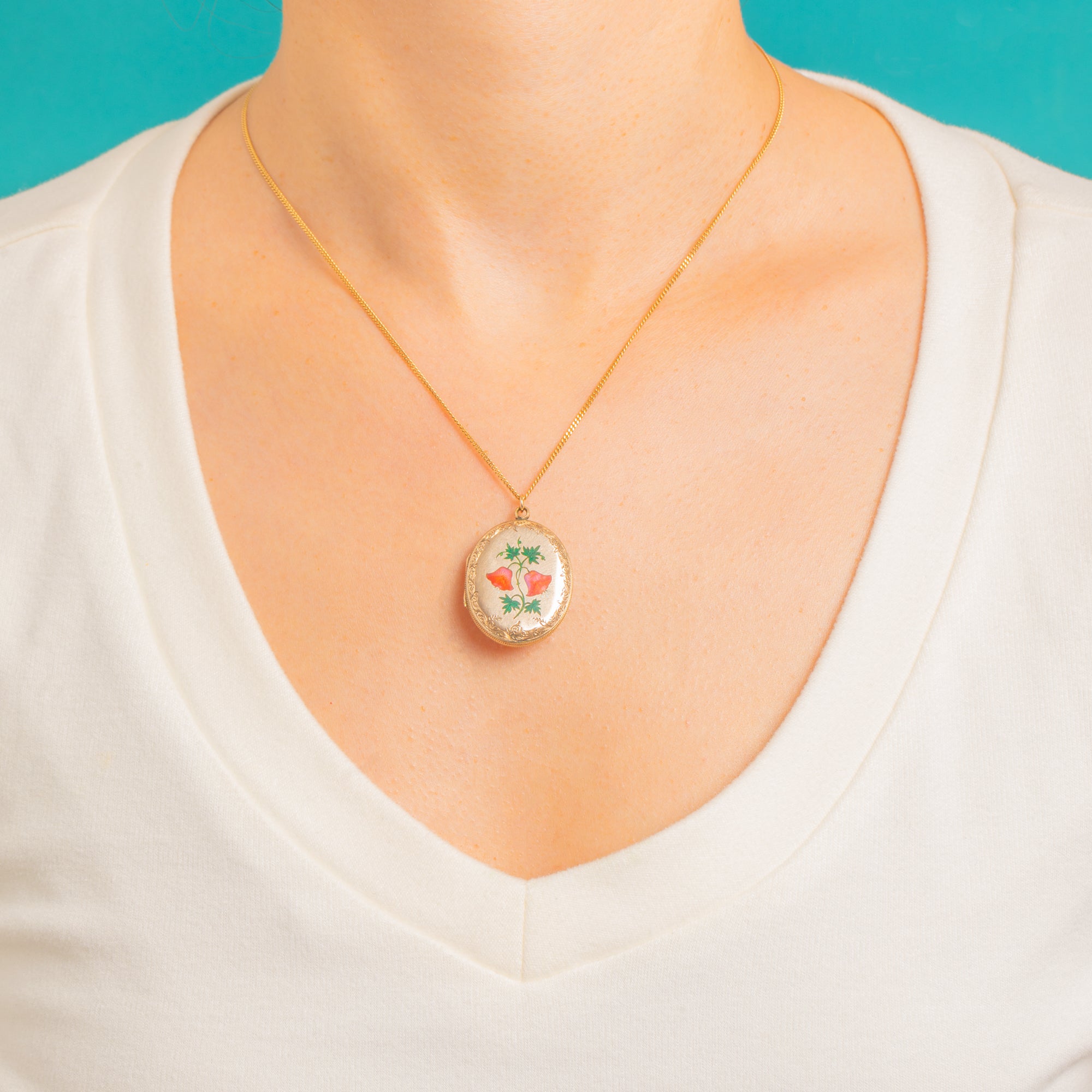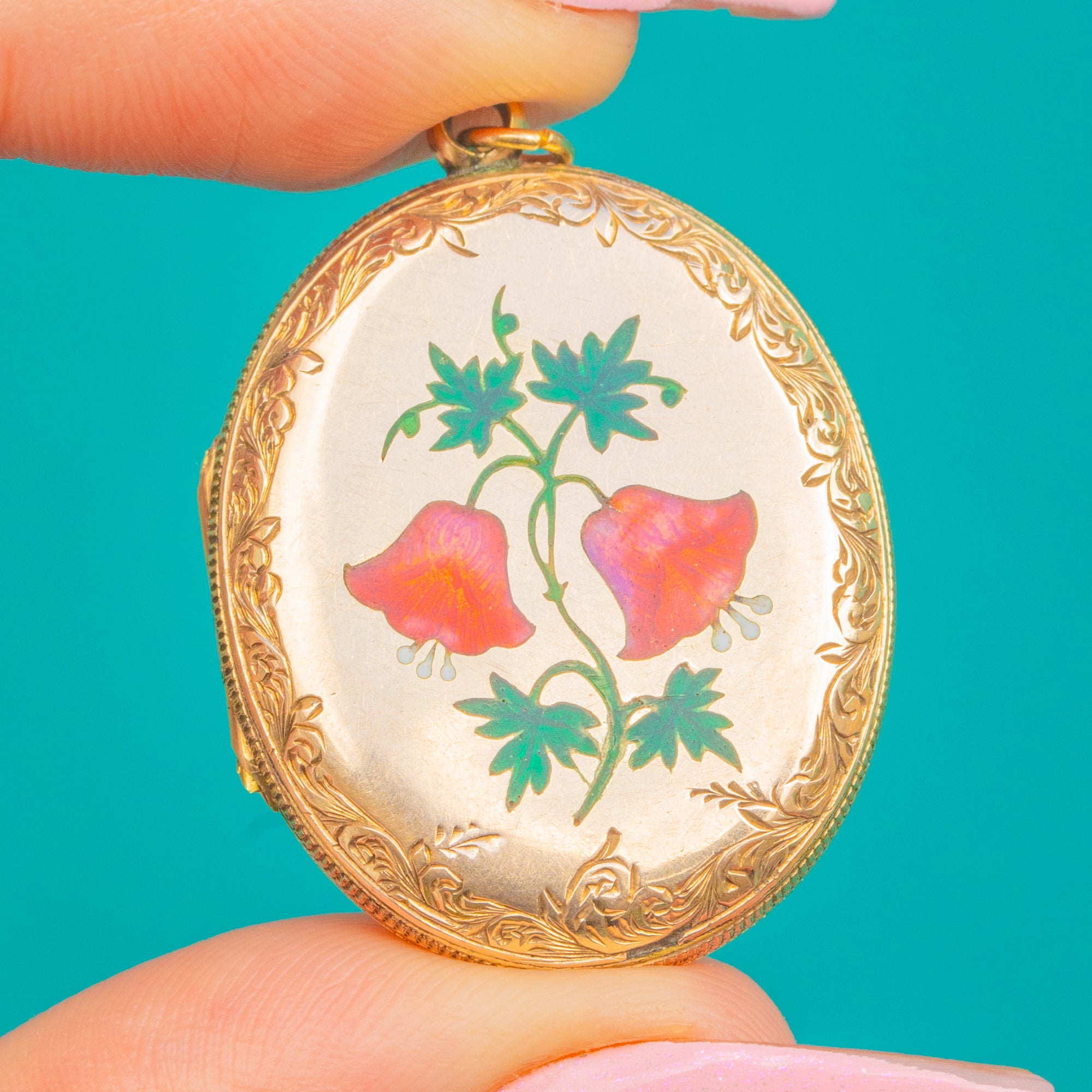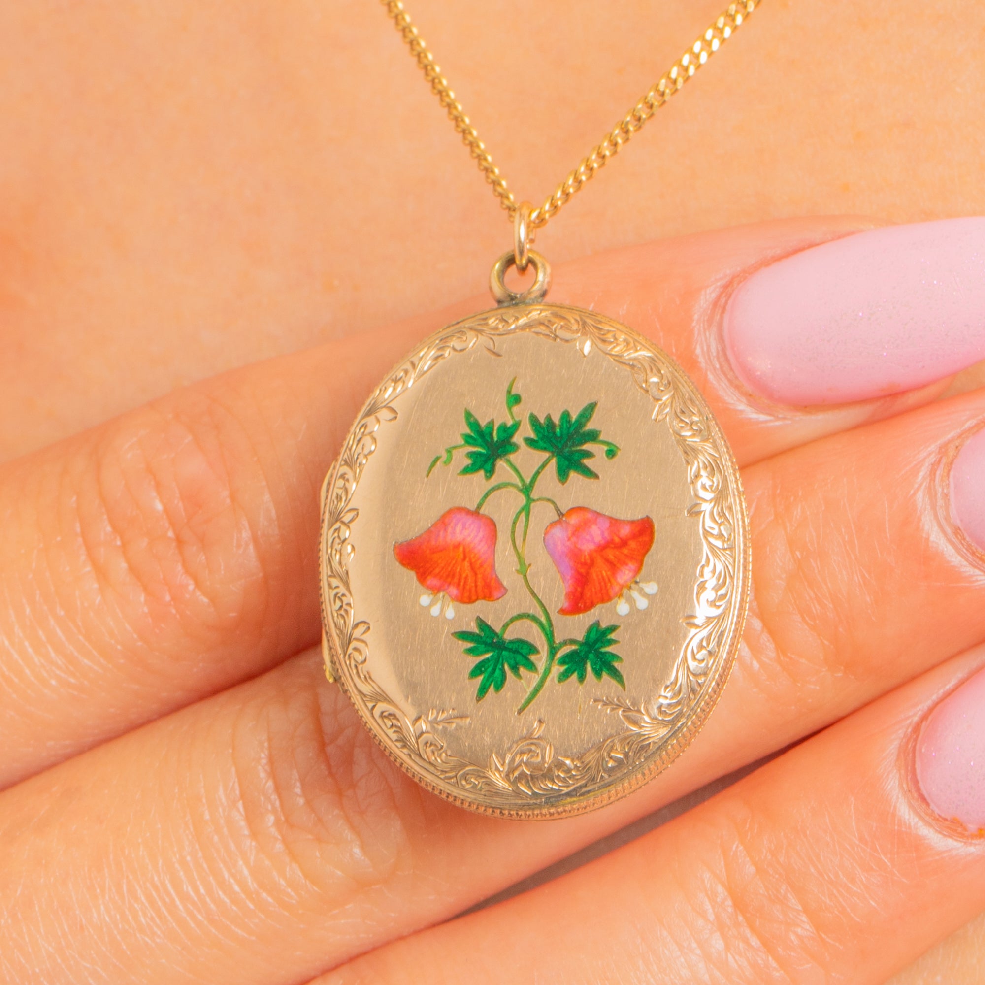 Sweet and sentimental, this Late Victorian 9ct Gold locket is adorned with a hand-painted Enamel depicting delicate Fuchsia flowers in pretty shades of Pink, Red and White with verdant Green leaves. The crisp, ornate foliate border with fine milgrain beading frames the oval beautifully for a refined, feminine finish.