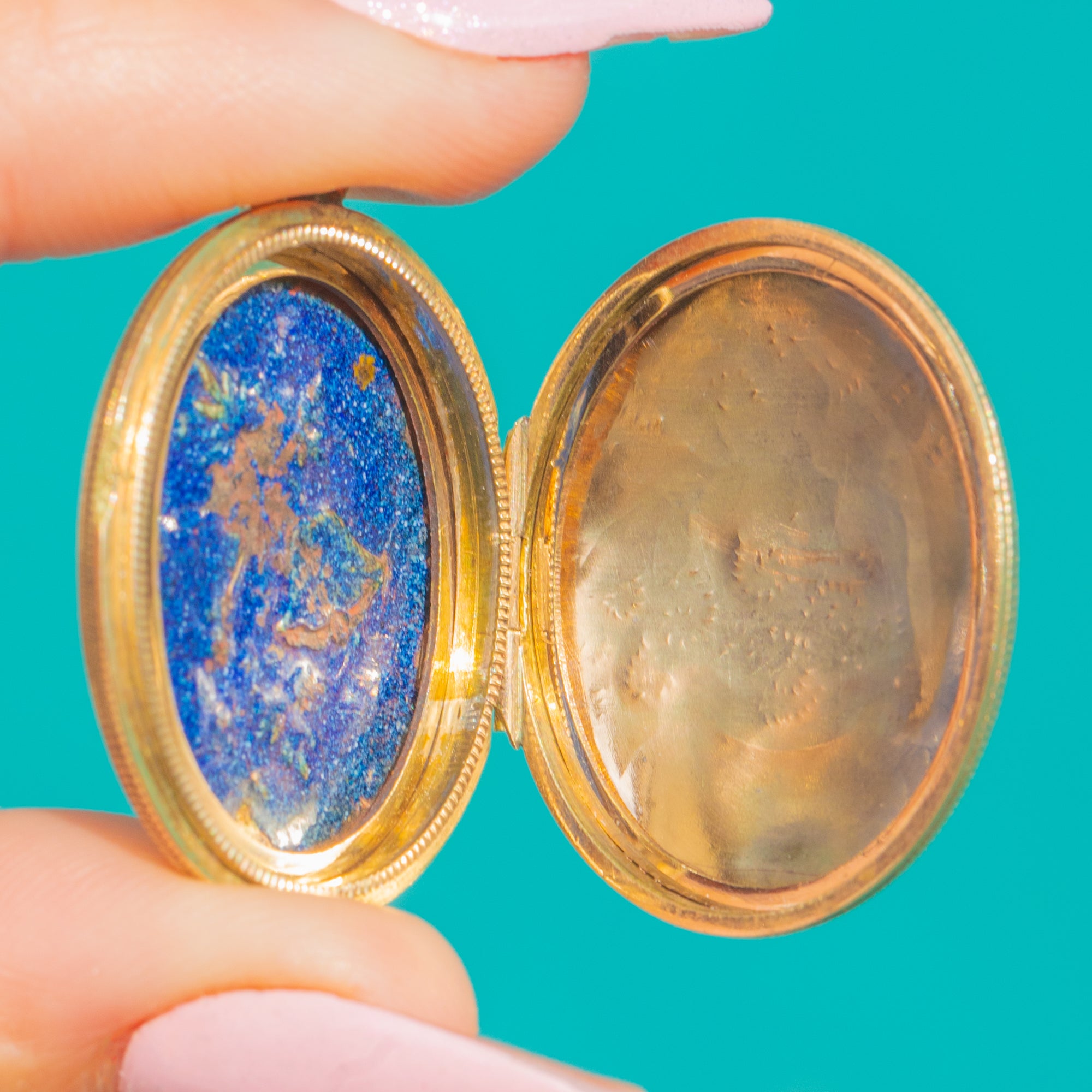 EXCELLENT: The Enamel is pristine and beautifully crisp with vibrant colour and no chips visible. The Gold shows only minimal light surface wear to the high points under close inspection, and the engraved border remains neat and sharply defined. The hinge and jump ring are secure, and the interior is clean with gentle age-related patina.