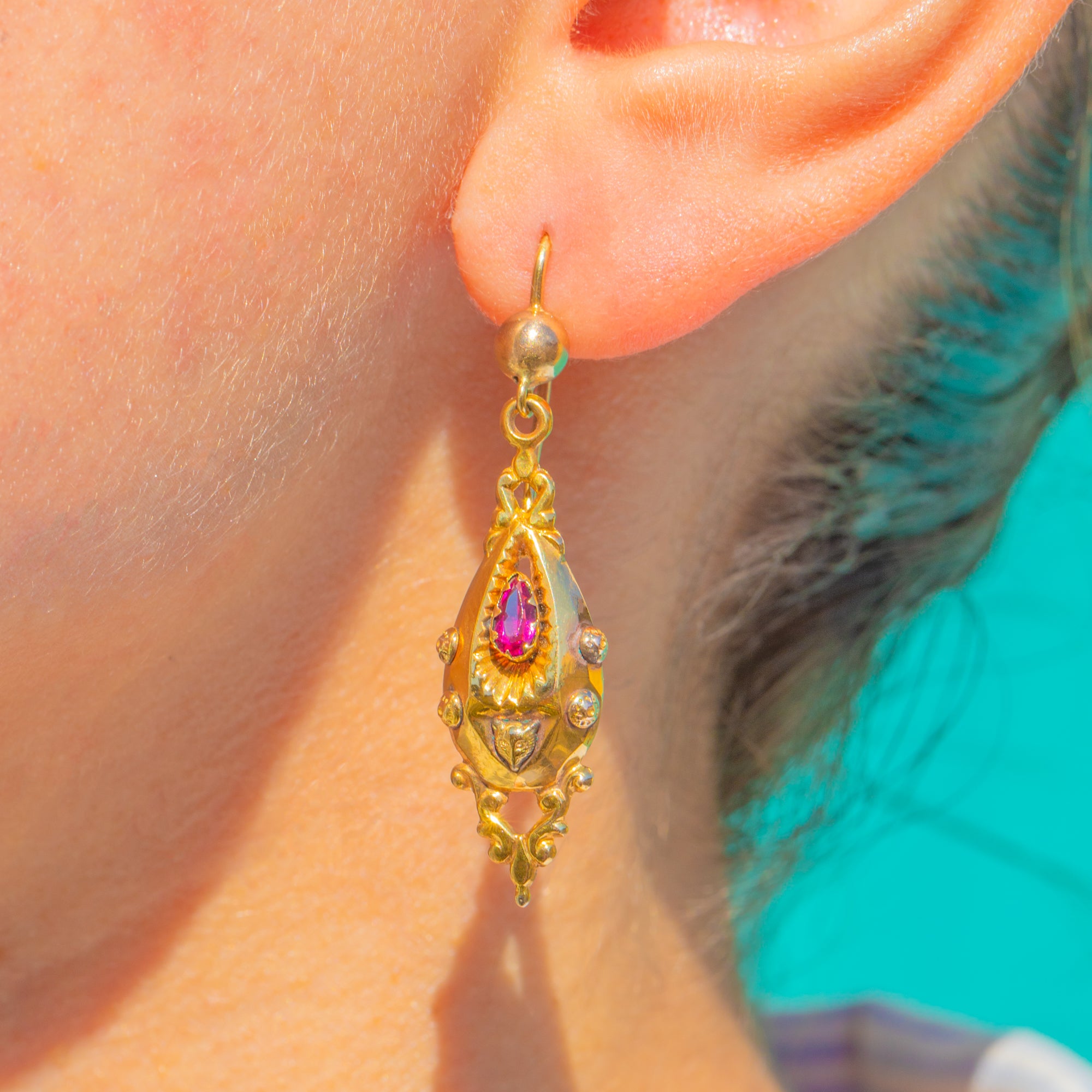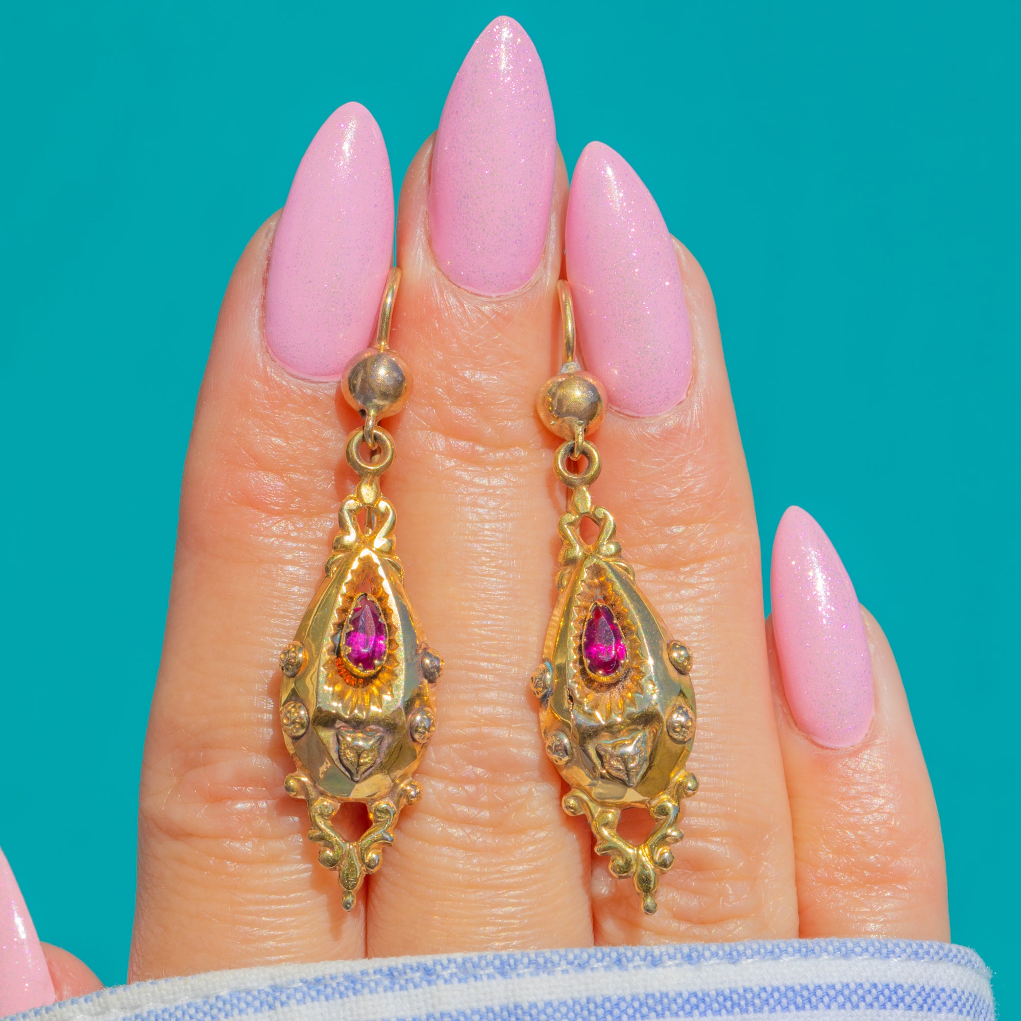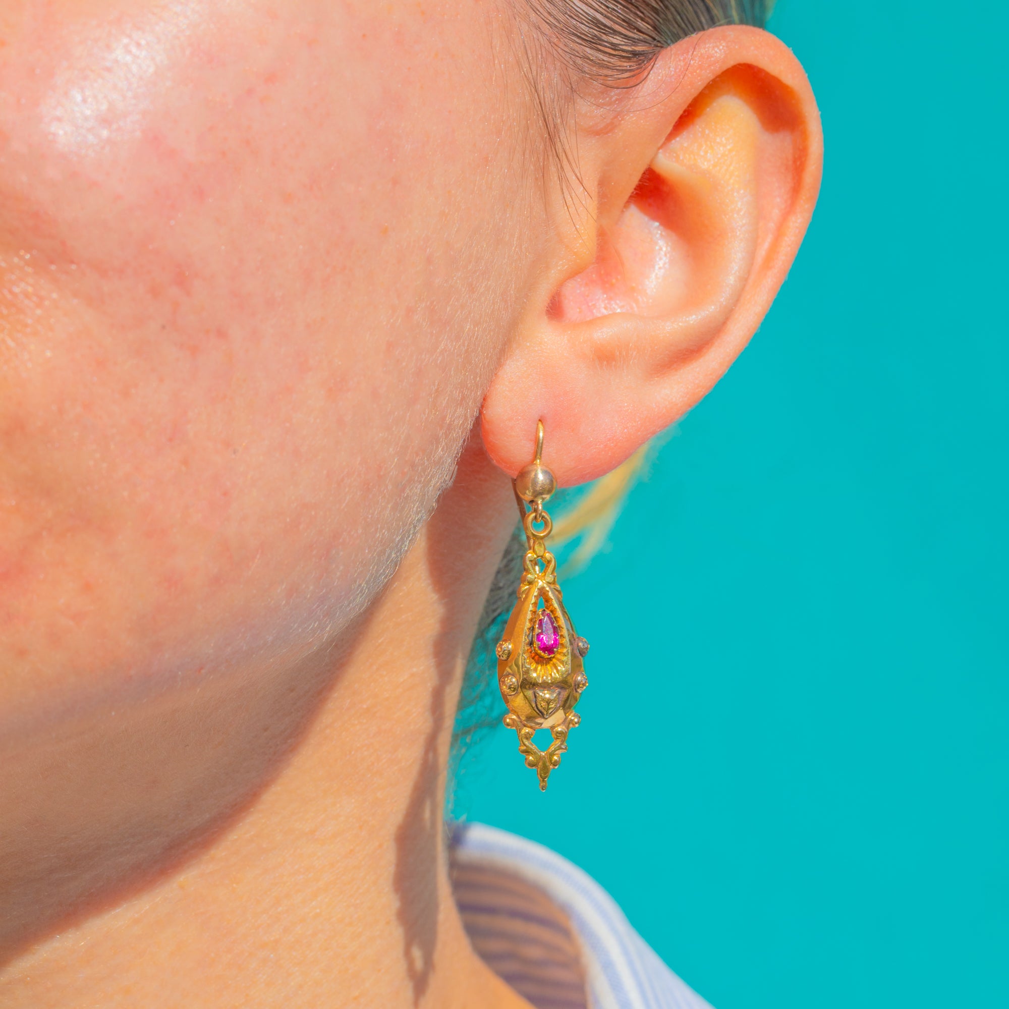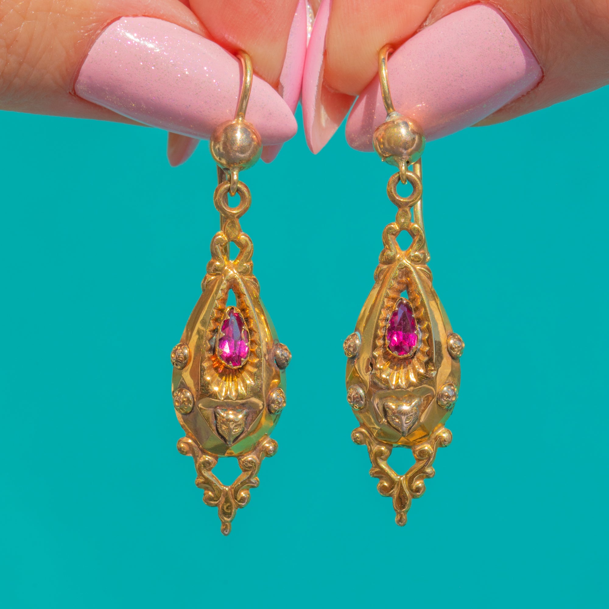 Ornate and romantic, these Victorian torpedo drop earrings are crafted in rich 14ct Gold with beautifully chased foliate motifs. Each elongated drop centres a pear-cut Pink Garnet Paste framed by a serrated, sunburst collet, with beaded ornament and an elegant openwork tip for a refined, antique silhouette.
