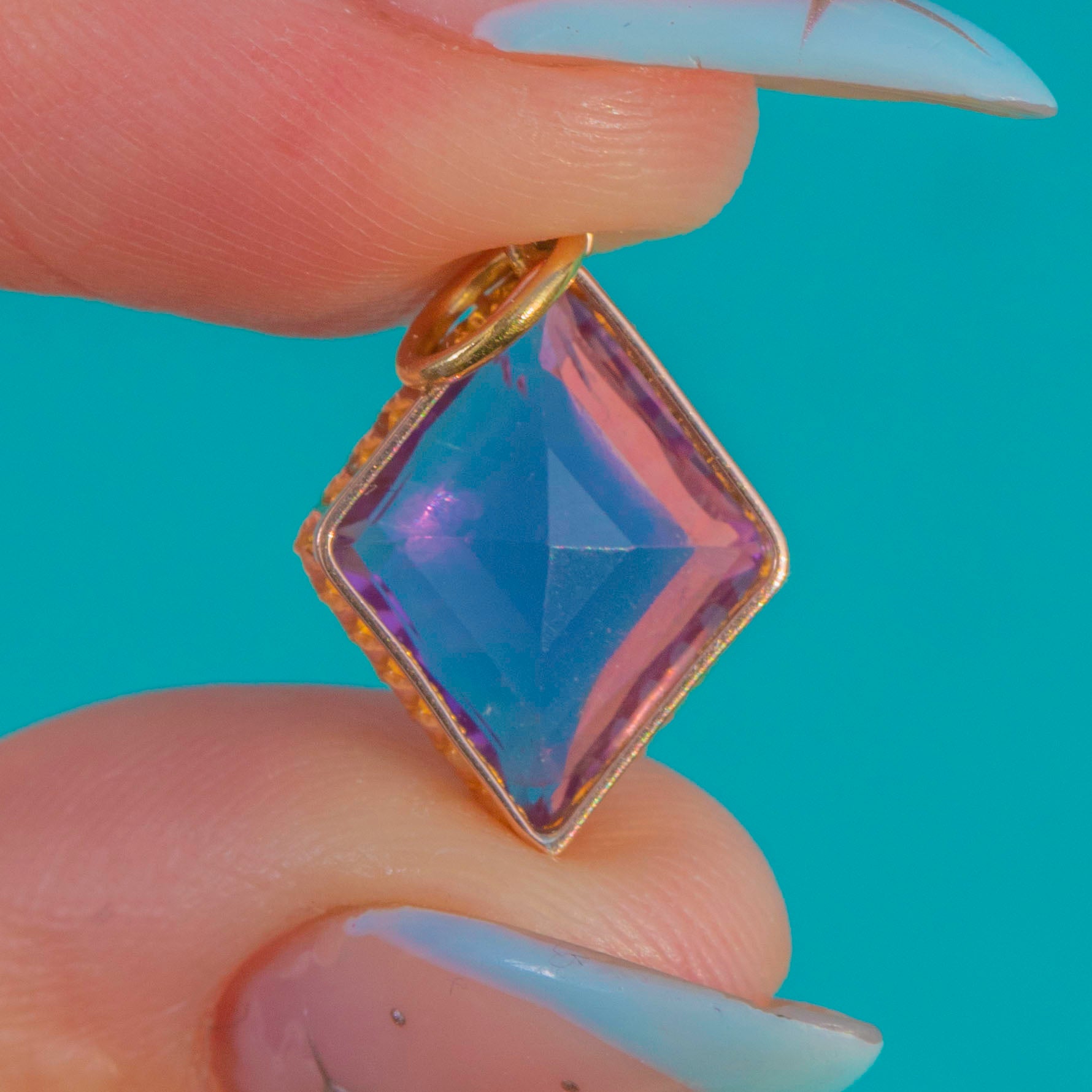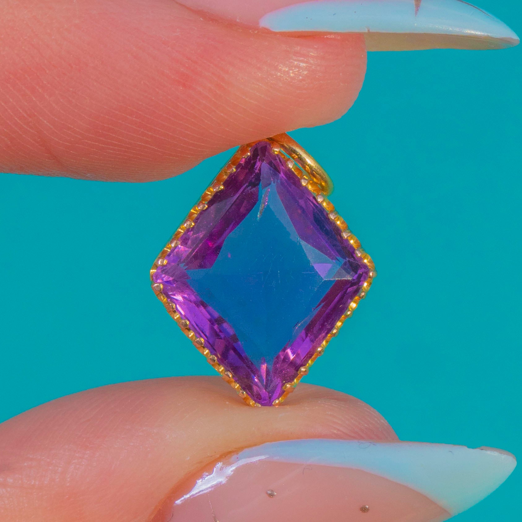 EXCELLENT: The Amethyst is bright and clean with no chips and only the lightest surface/facet wear visible under close inspection. The 15ct Gold setting is secure and well-preserved, with a secure jump ring. No restoration or repairs observed.