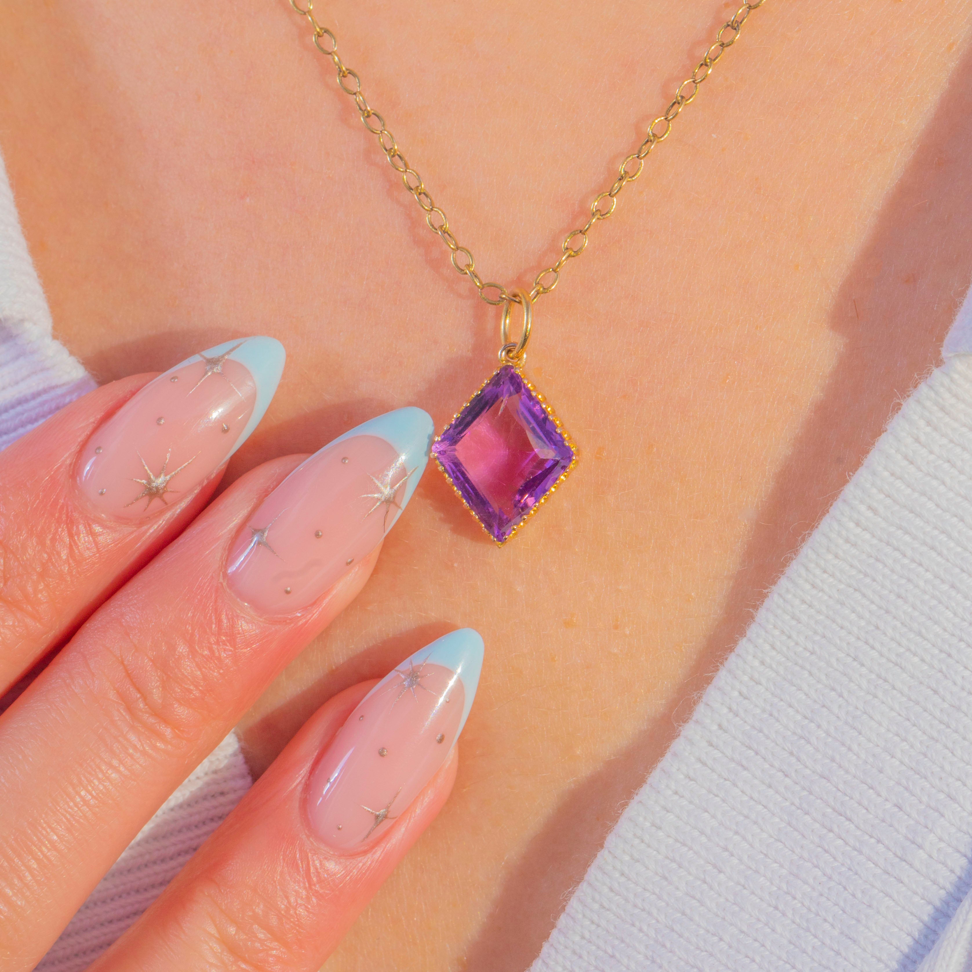 A luminous Victorian Amethyst pendant crafted in rich 15ct Gold. The marquise-cut Amethyst, oriented on the diagonal for a striking lozenge silhouette, is cradled in a striking coronet setting. Its medium–deep purple hue catches the light beautifully, offering flashes across the crisp table and facets.