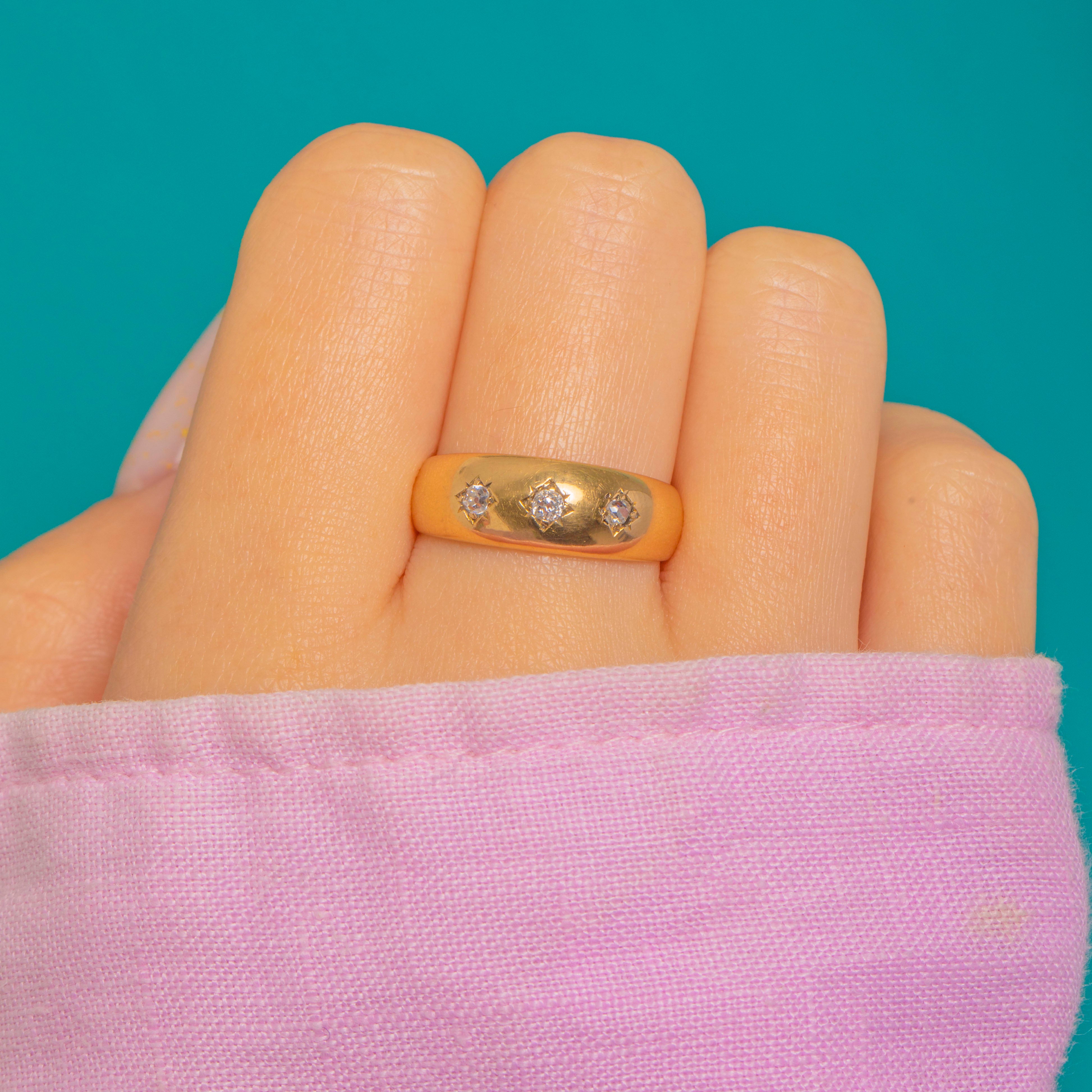 Timeless and beautifully understated, this late Victorian three-stone gypsy ring is crafted in rich 18ct Gold and set with three bright Diamonds in engraved eight-point star settings. The centre Diamond is subtly larger, flanked by a matching pair, all set flush into a smooth, domed band for effortless, everyday elegance.
