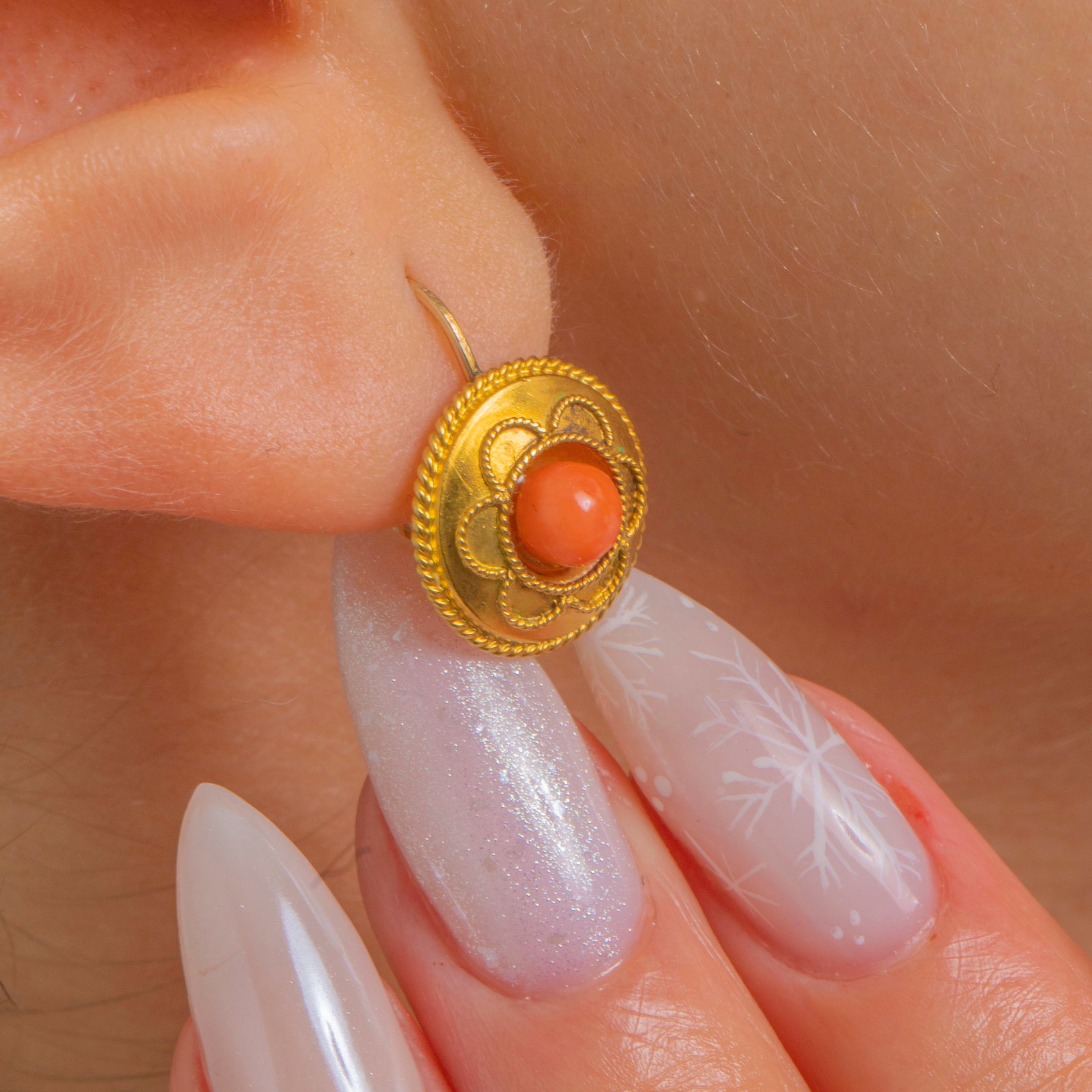 Victorian 18ct Gold Coral Etruscan Revival Earrings