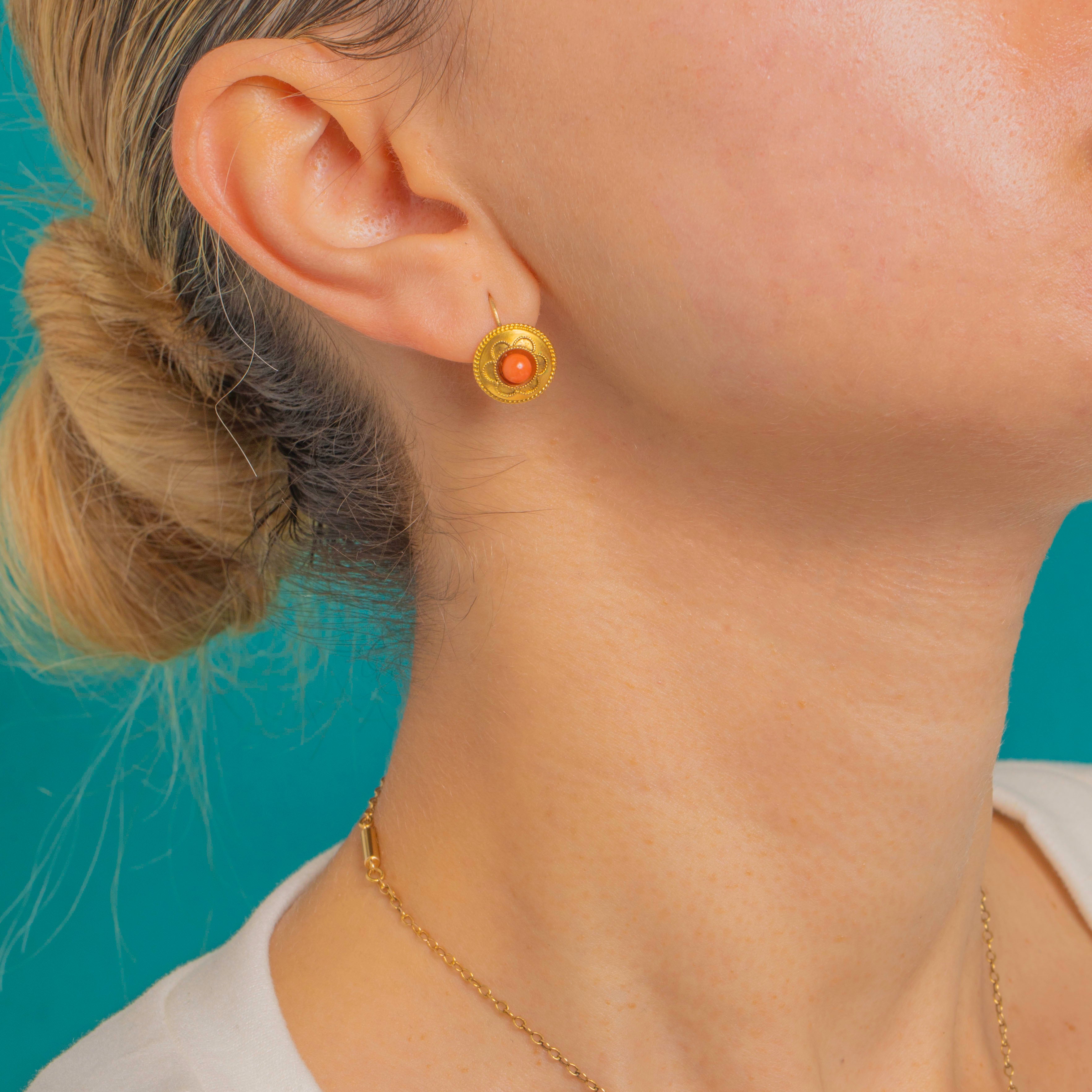 A delicious pop of Victorian colour, these 18ct Gold Coral earrings pair glowing domed Coral with exquisitely detailed wirework in Etruscan Revival style. Each circular drop is centred by a round Coral cabochon, framed by a rosette of applied cannetille wirework and finished with a twisted rope border for a beautifully sculptural, antique silhouette.