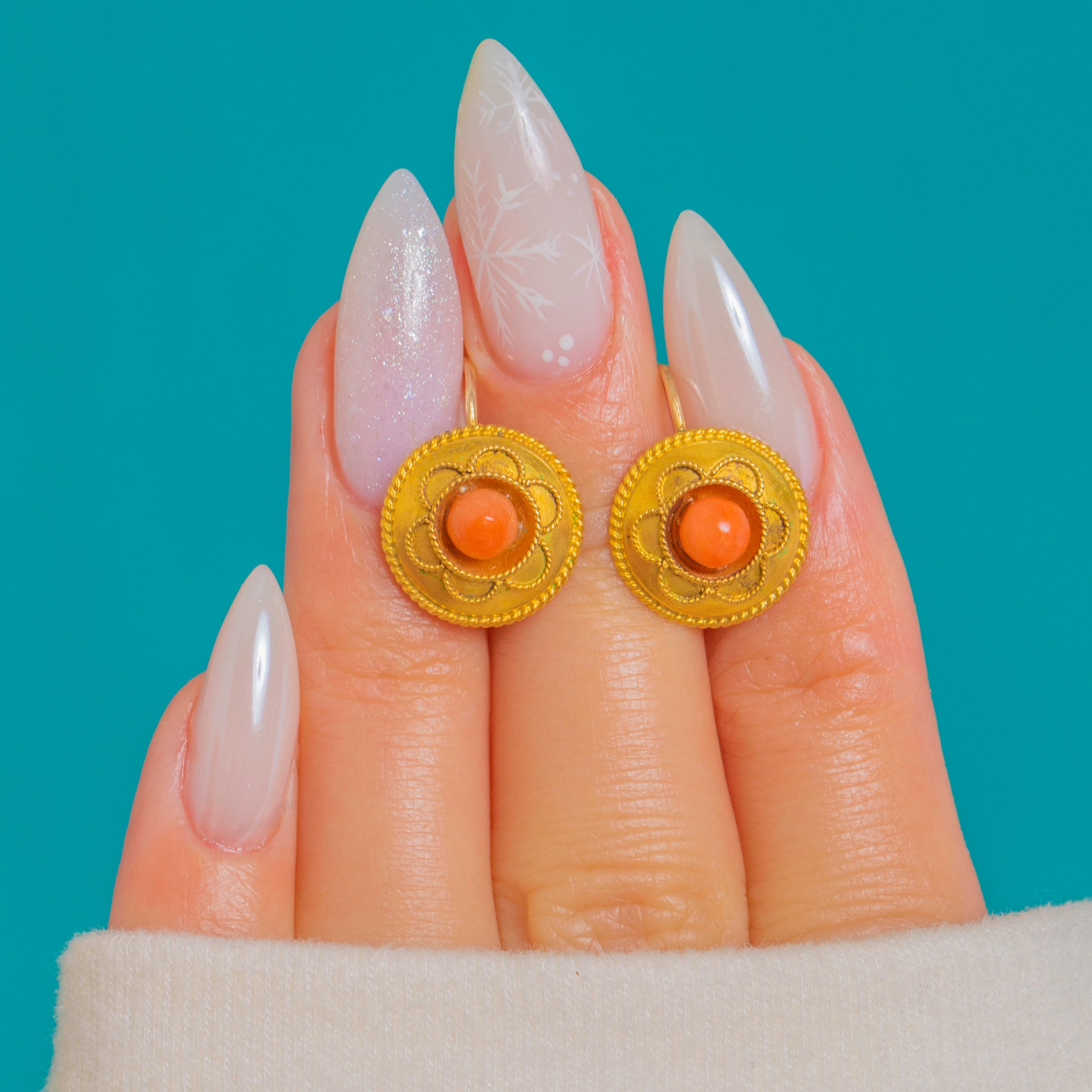 The rich, high-carat Gold has a luxurious satin finish that flatters the vibrant orange hue of the Coral. Elegant, ornate, and effortlessly wearable, they’re a quintessential Victorian jewel with enduring charm. Later 9ct Gold fittings have been added in keeping with their long life and careful stewardship.