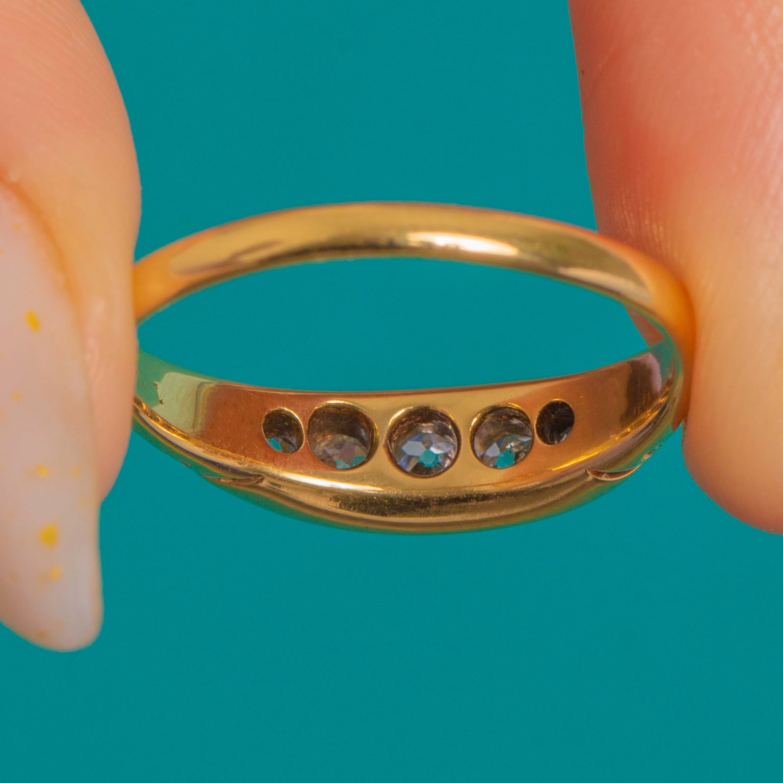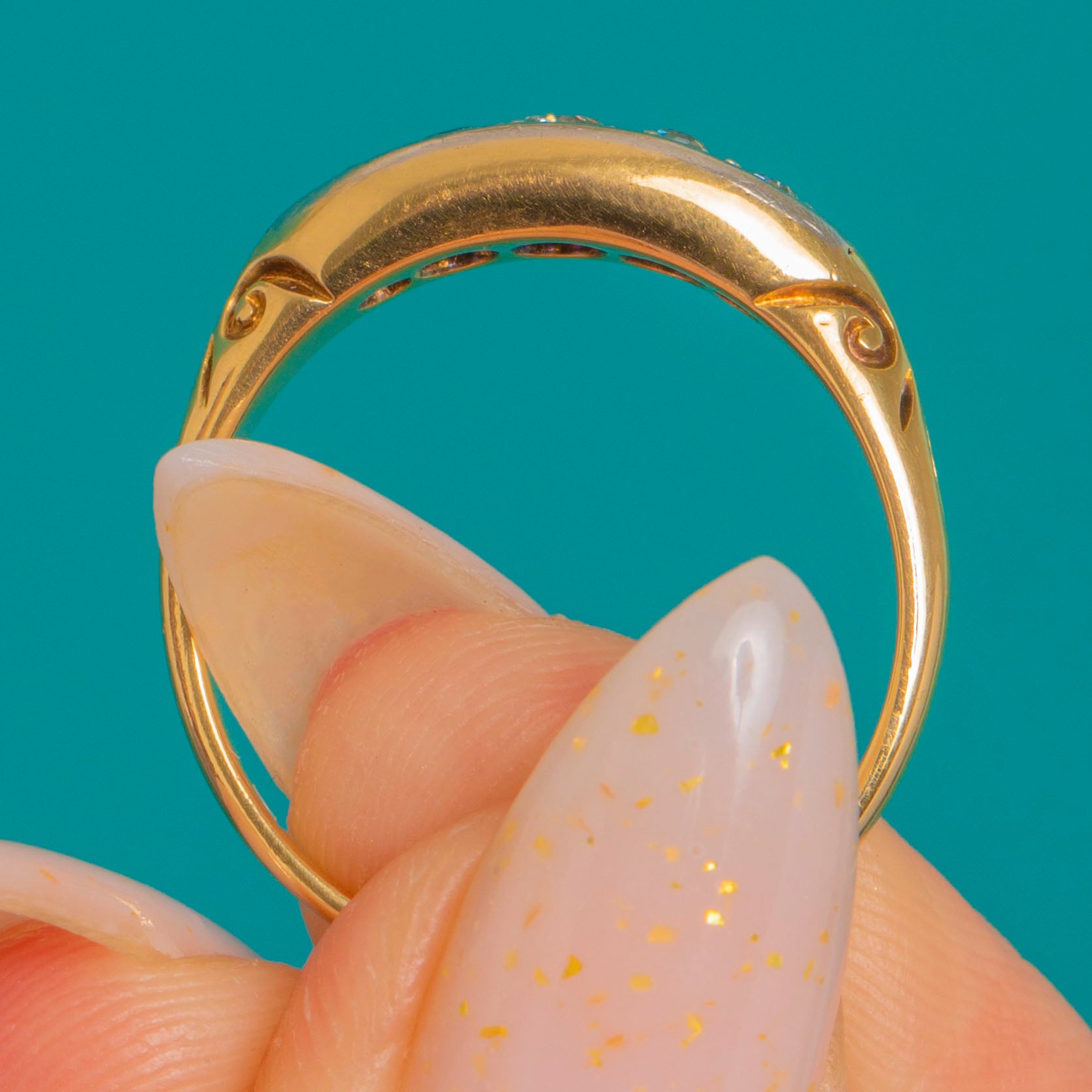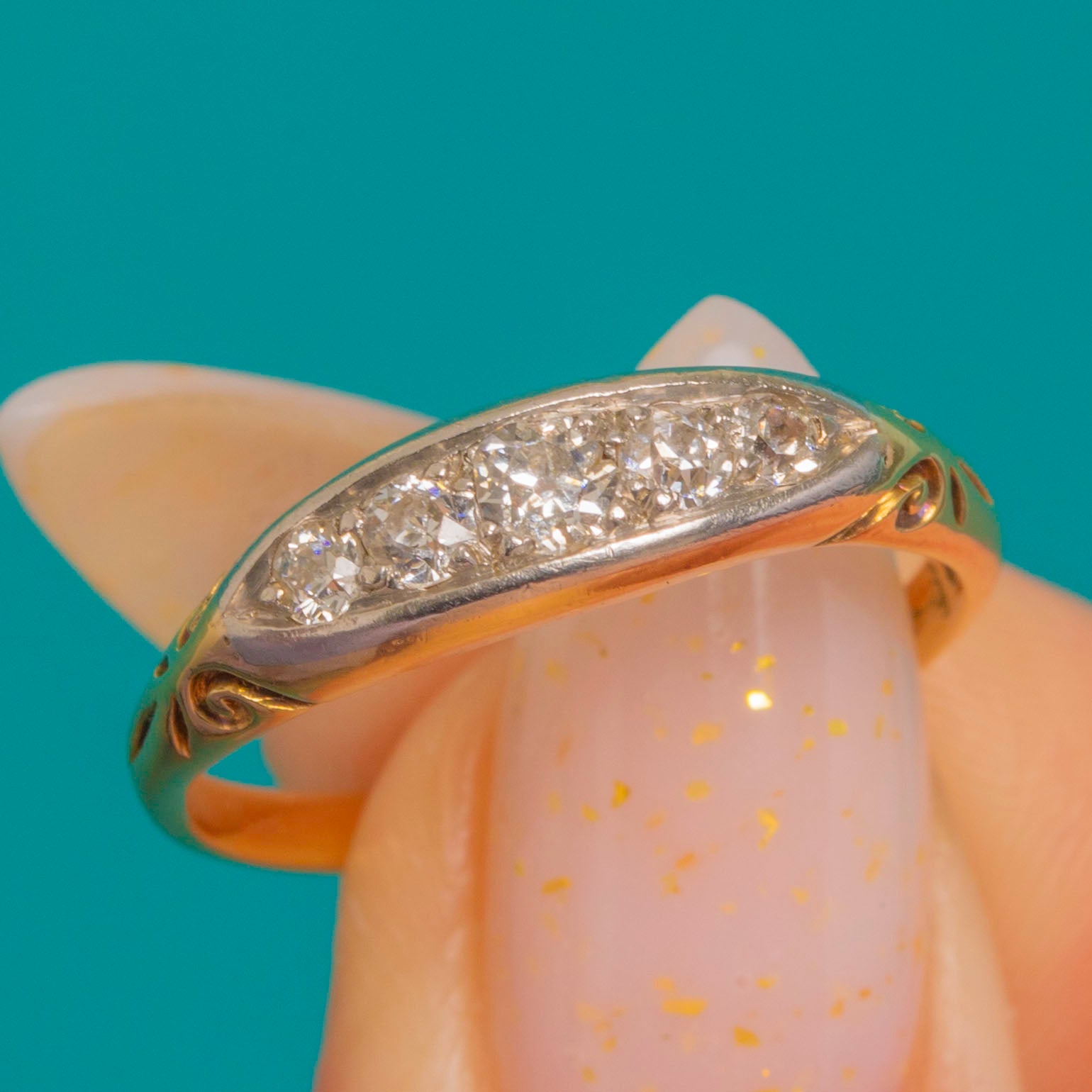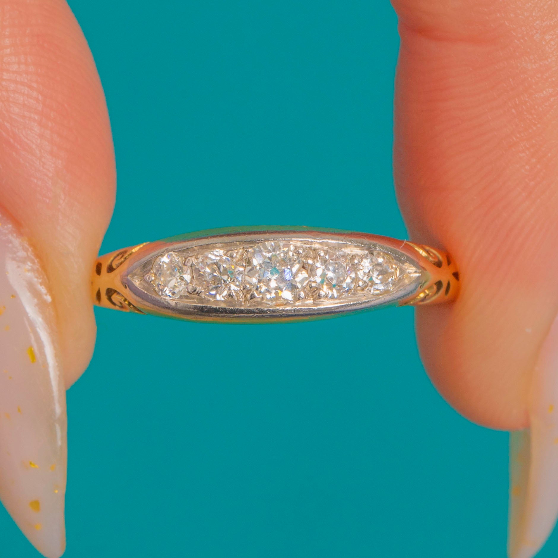 A timeless Victorian classic, this Diamond five-stone ring pairs the warmth of 18ct Gold with the cool gleam of Platinum. The Diamonds are subtly graduated for a refined flow of light across the finger, offering elegant sparkle that feels effortless day or night.