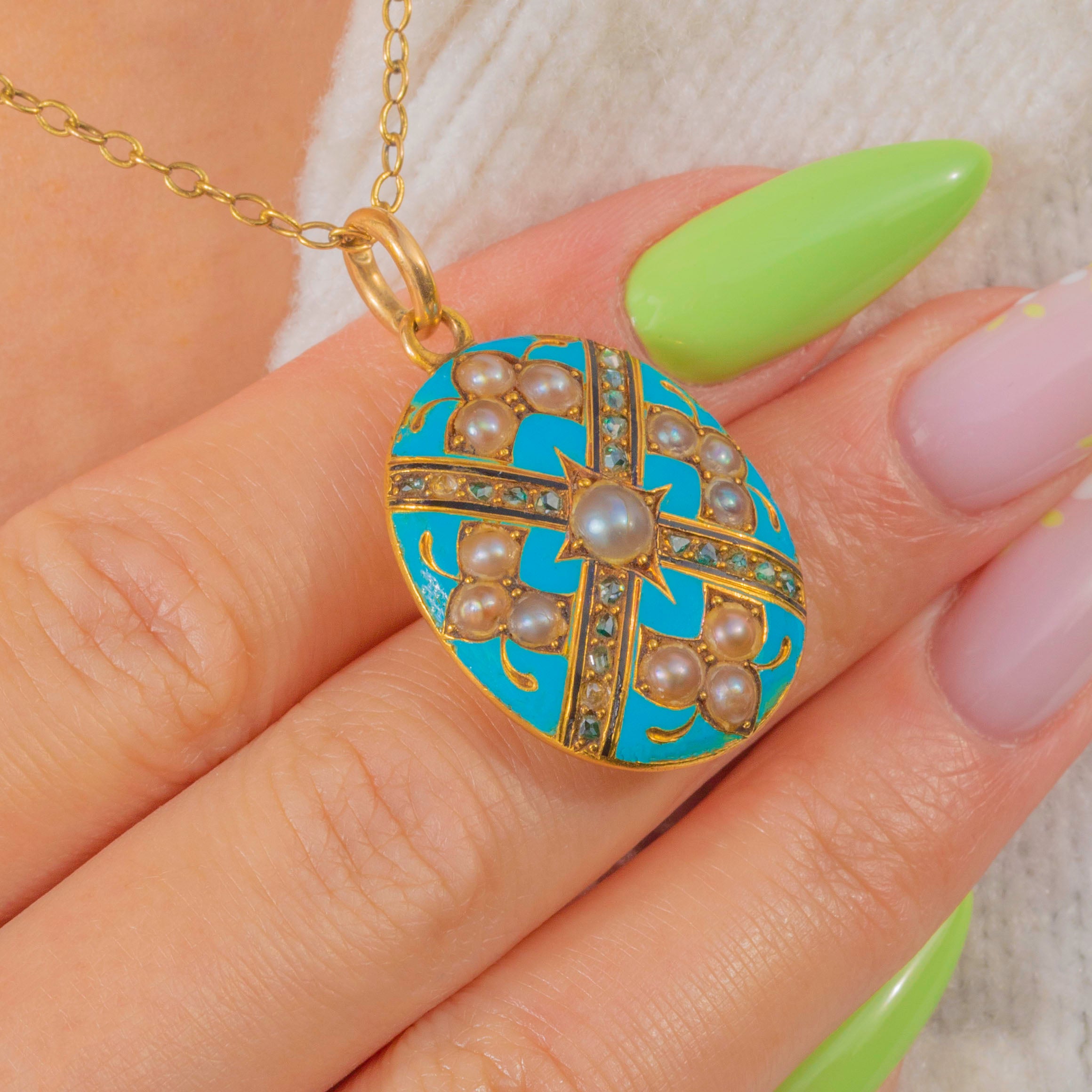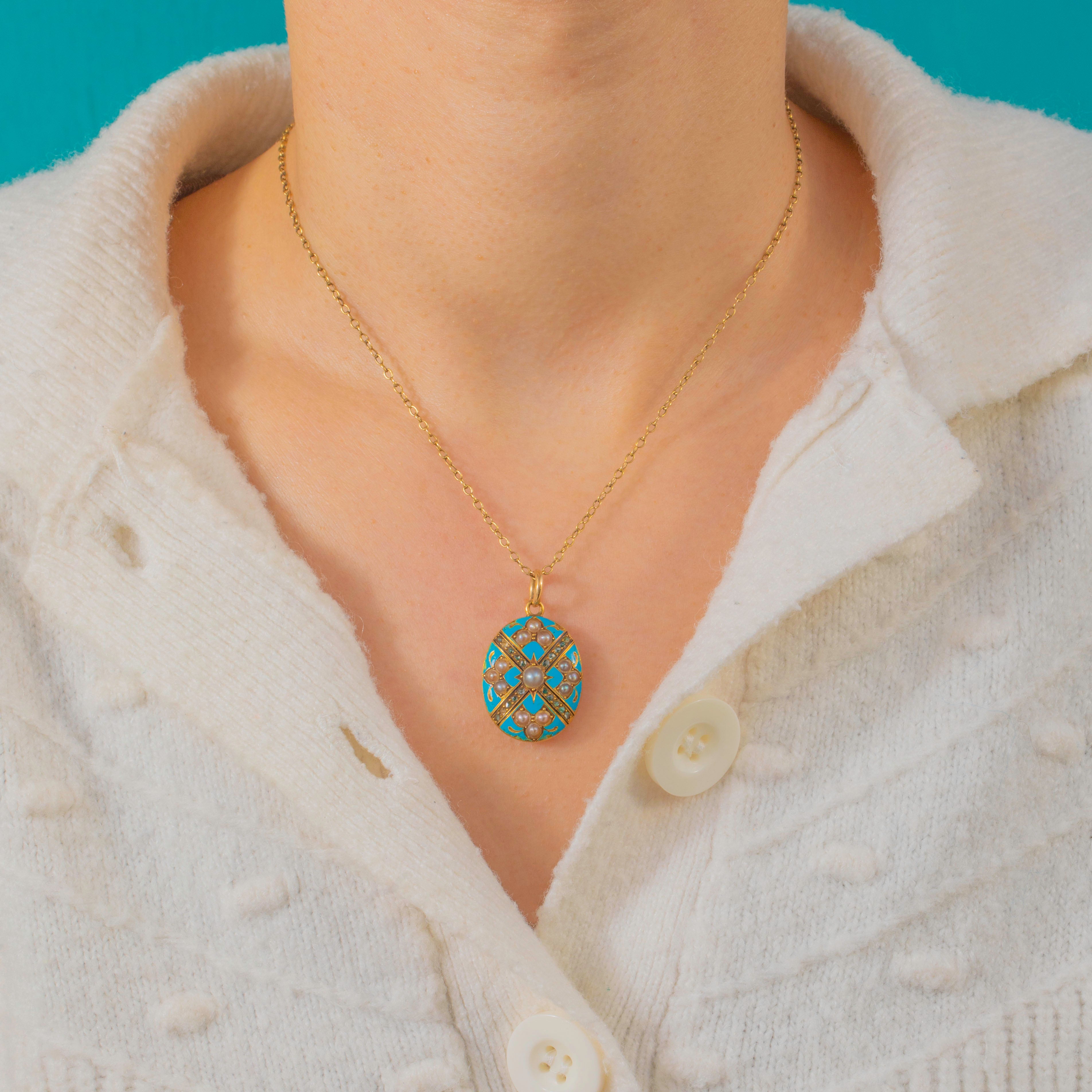 A petite Victorian 18ct Gold locket bathed in duck‑egg blue Enamel, its oval face traced with raised Gold diagonal bands to form an elegant cross. At the heart sits a creamy round Pearl in a starburst mount, with trios of Seed Pearls and a constellation of glinting rose‑cut Diamonds accenting the design.