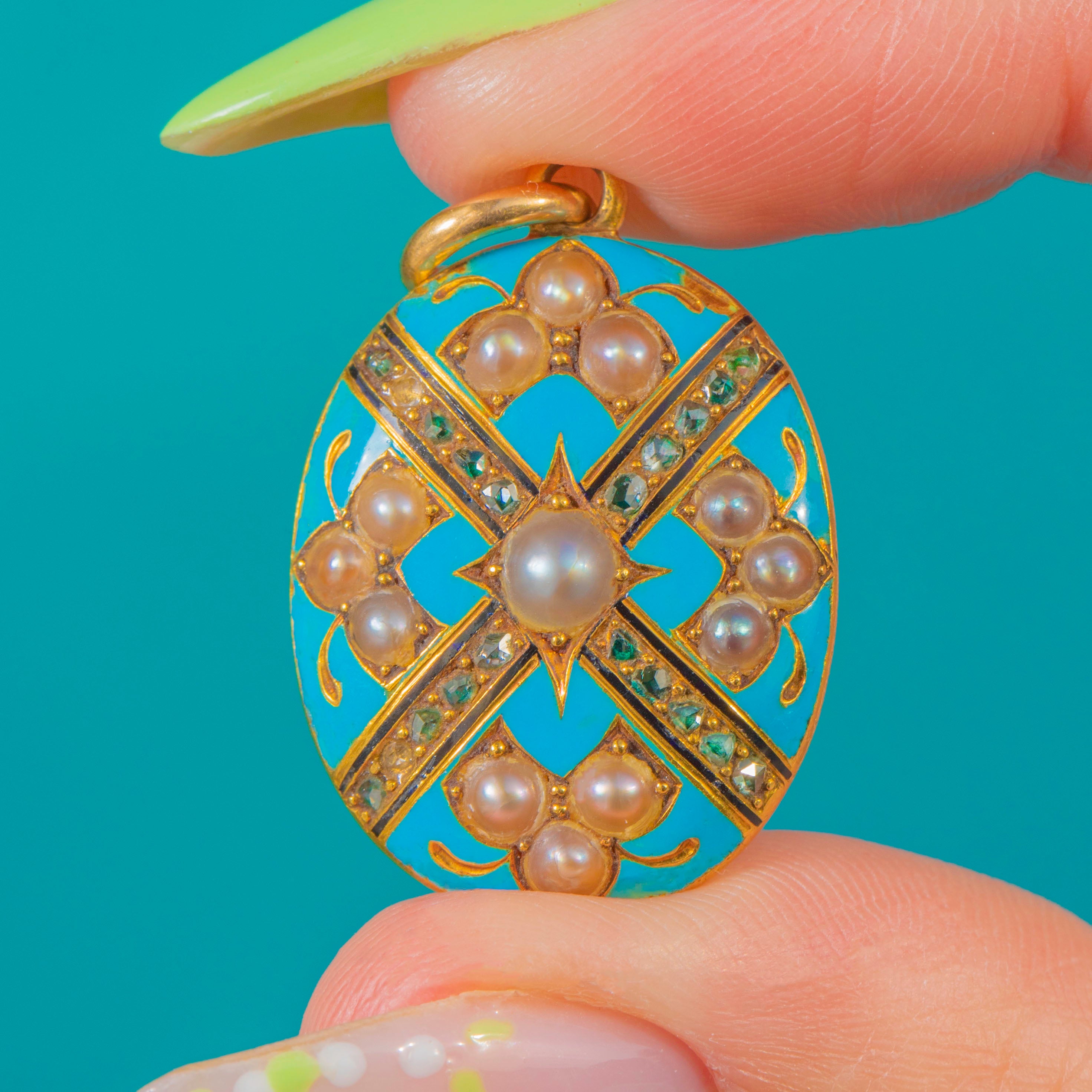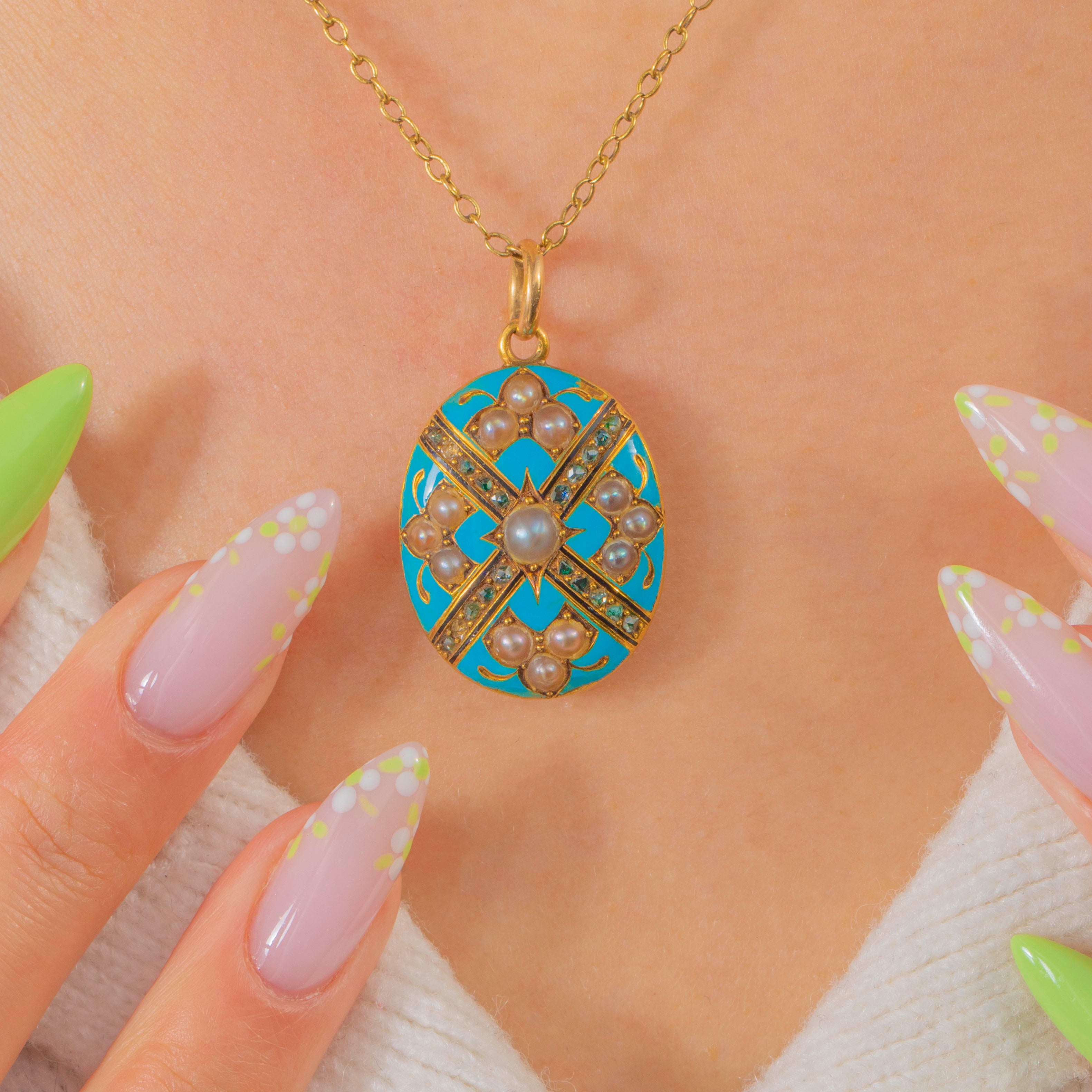 Victorian 18ct Gold Duck-Egg Blue Enamel Locket with Pearls & Rose-Cut Diamonds