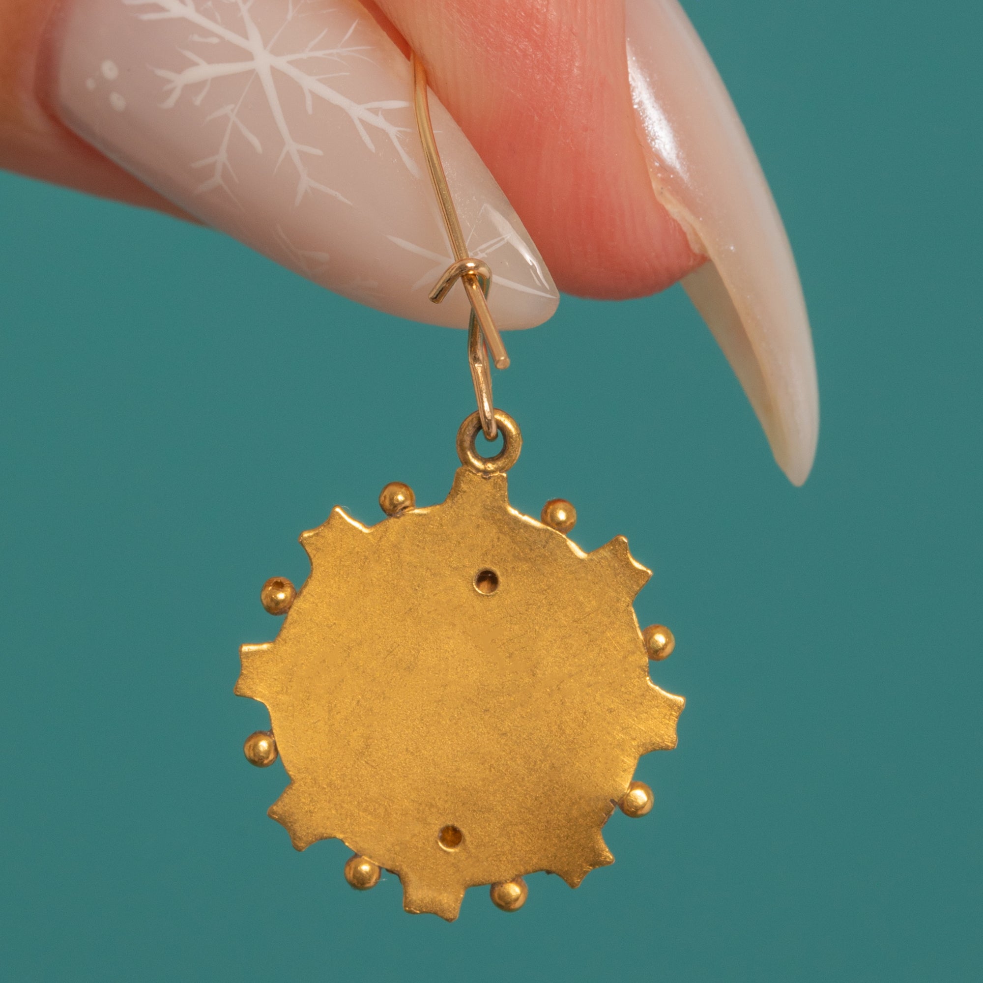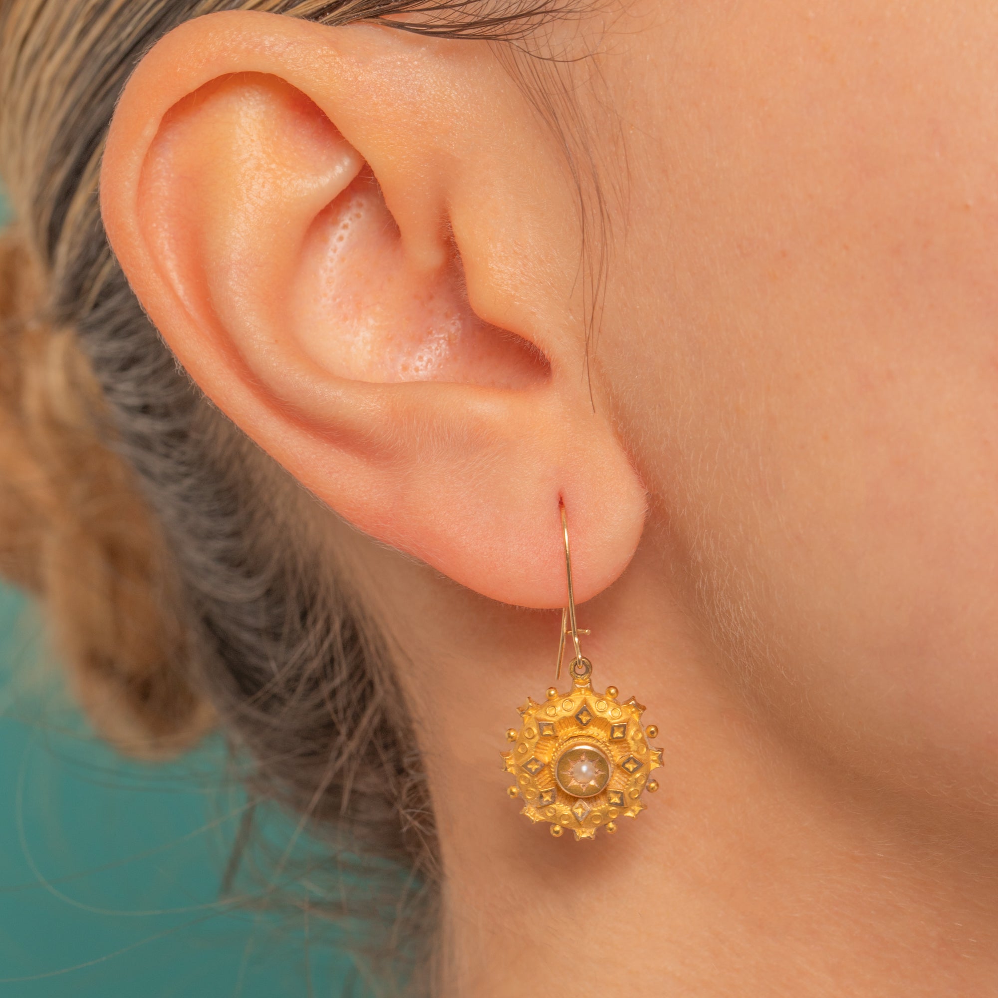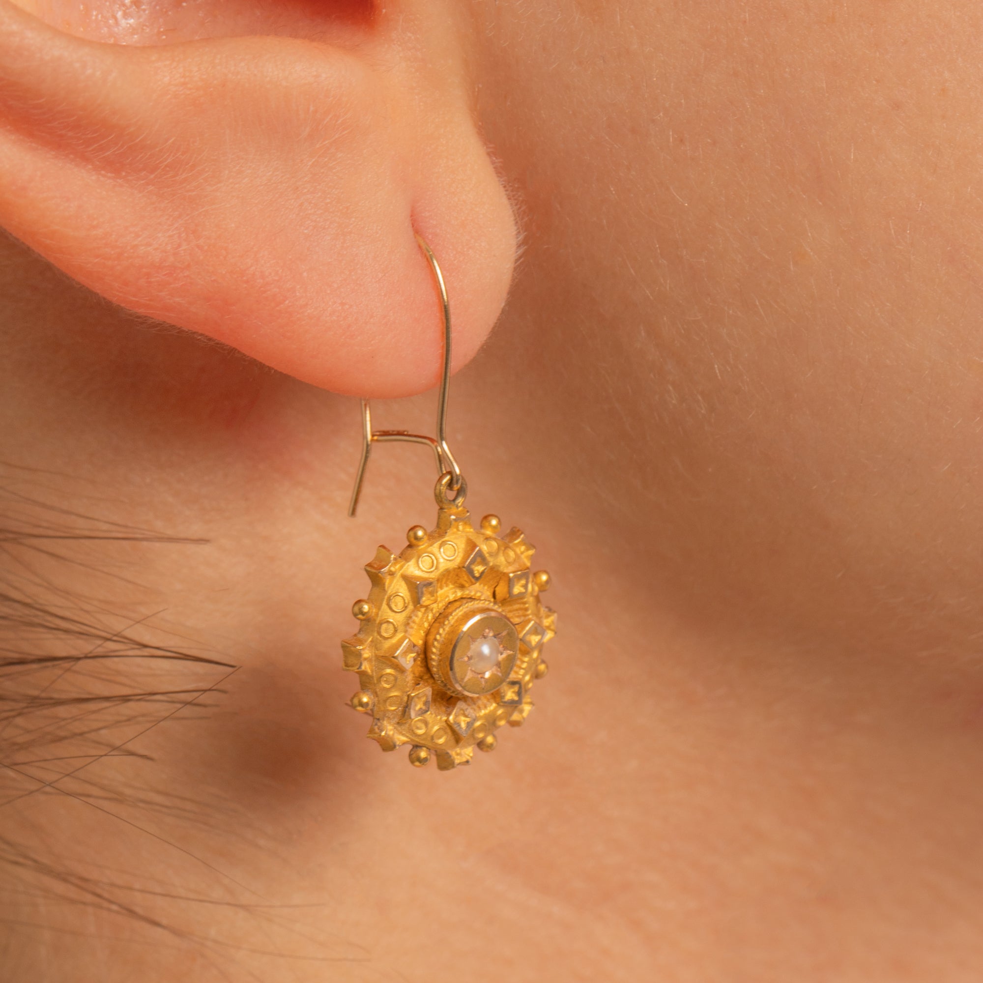 Elegant and ornate, these Victorian Etruscan Revival drop earrings are crafted in glowing 18ct Gold with exquisitely detailed domed medallions. Each disc is richly embellished with applied granulation, rope wirework and tiny geometric studs that radiate in a sunburst rosette, centred by a petite creamy Pearl.