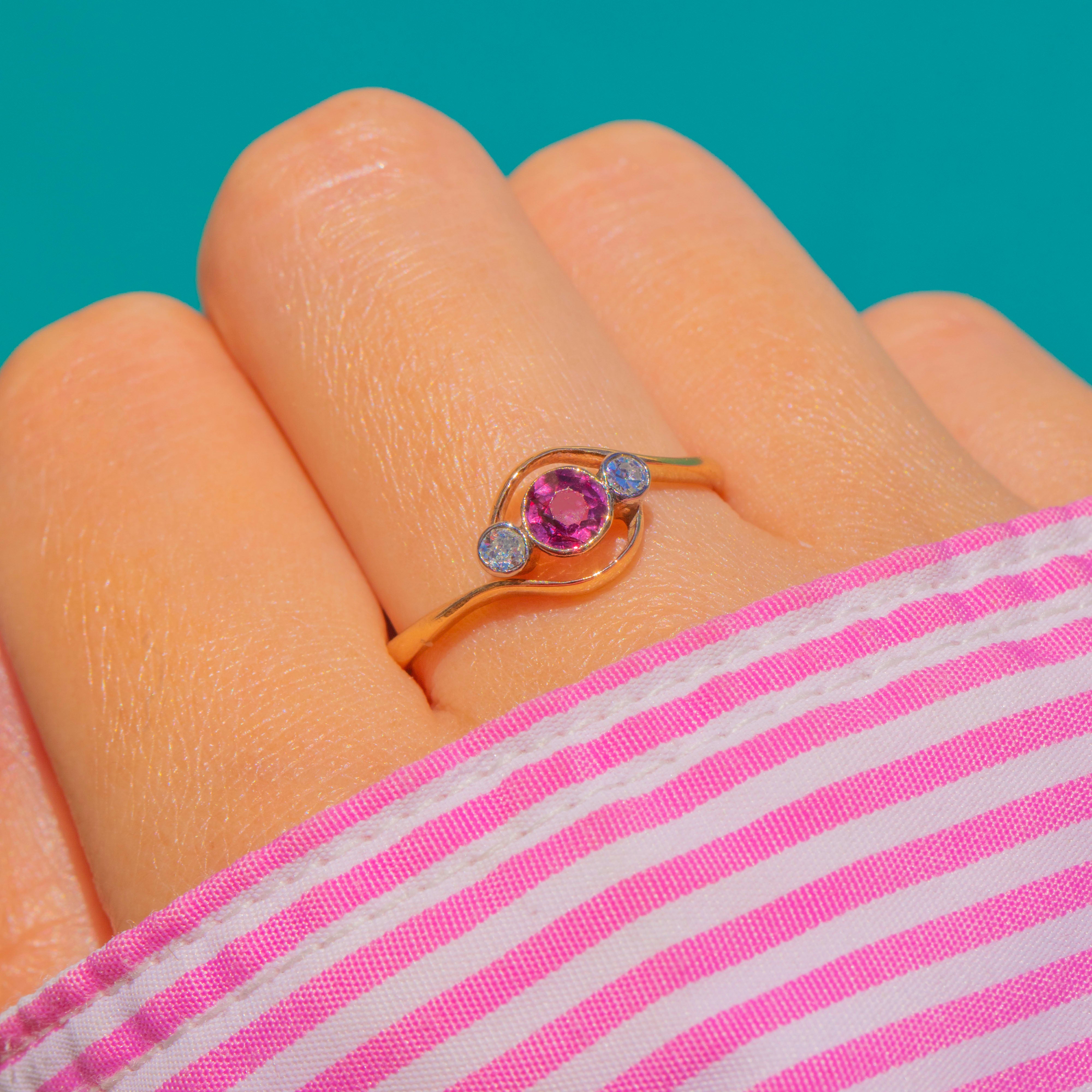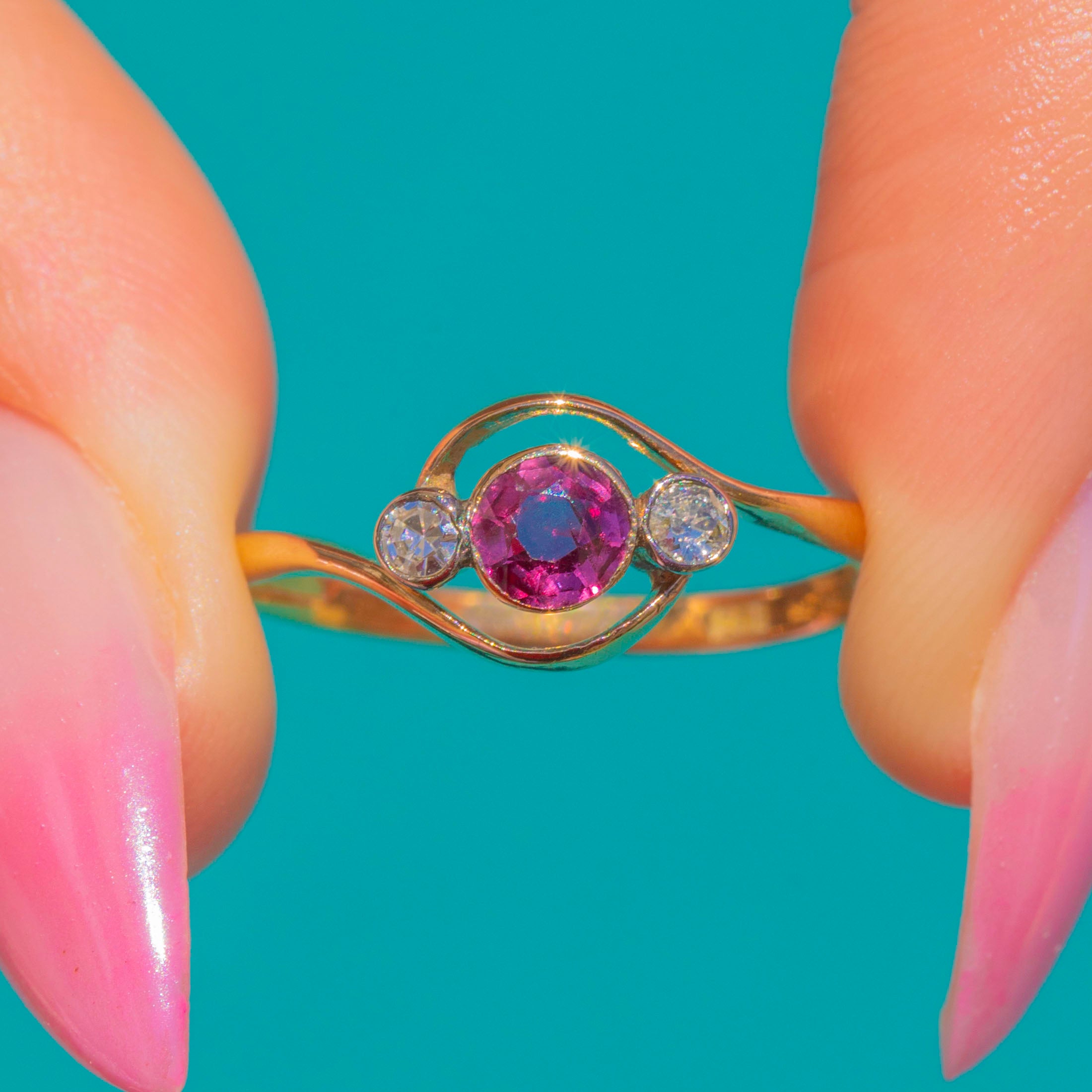 A refined Victorian twist ring in rich 18ct Gold, set with a glowing round Ruby embraced by two sparkling round Diamonds. The trio is secured in smooth bezel settings that flow seamlessly into elegant, scrolling shoulders for a beautifully fluid, romantic silhouette.
