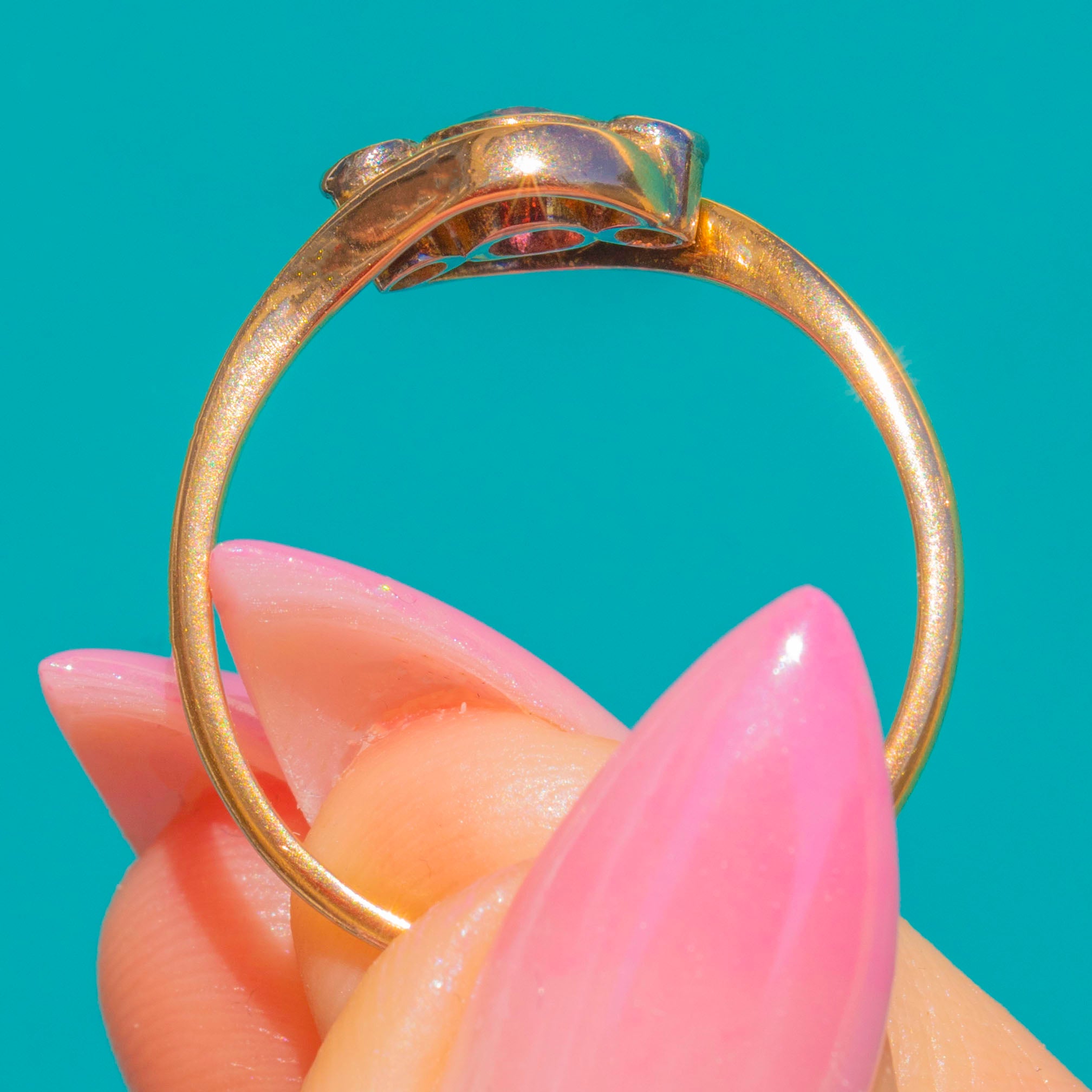 The warm Yellow Gold amplifies the Ruby’s vivid hue while the Diamonds add a delicate kiss of brightness at each side. This charming Victorian trilogy ring is an effortlessly wearable antique treasure with timeless appeal.