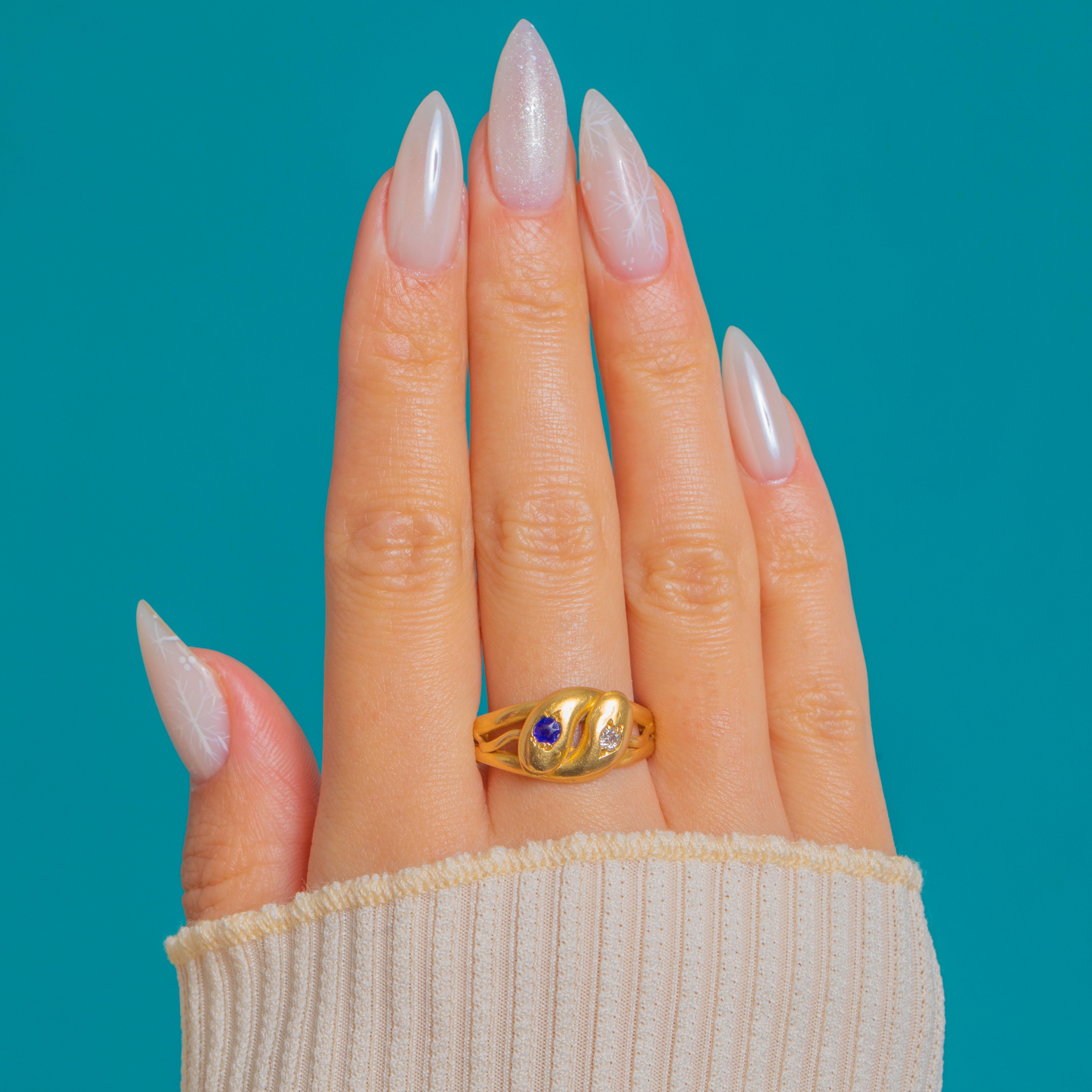 A quintessential Victorian treasure, this entwined double-snake ring is crafted in rich 18ct Gold. Two smooth serpent heads meet in a graceful bypass, each gypsy-set with a deep blue Sapphire on one, the other with a bright Diamond. The low, sculptural profile and split shoulders taper elegantly into a plain shank for a sleek, comfortable fit.