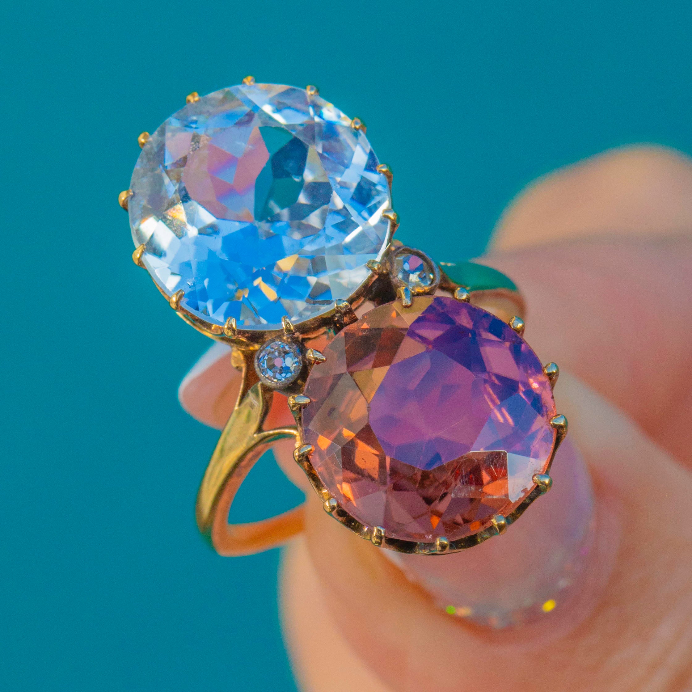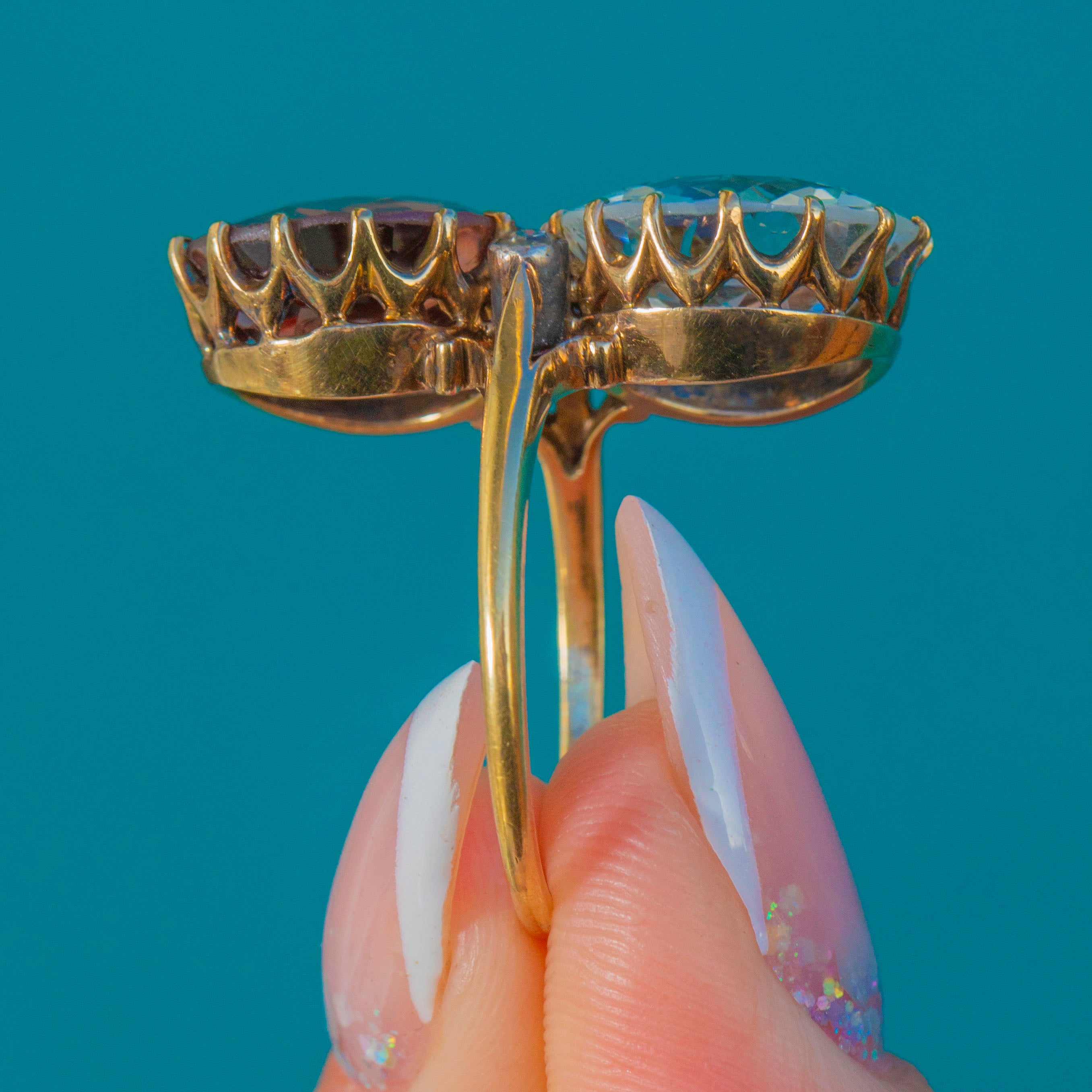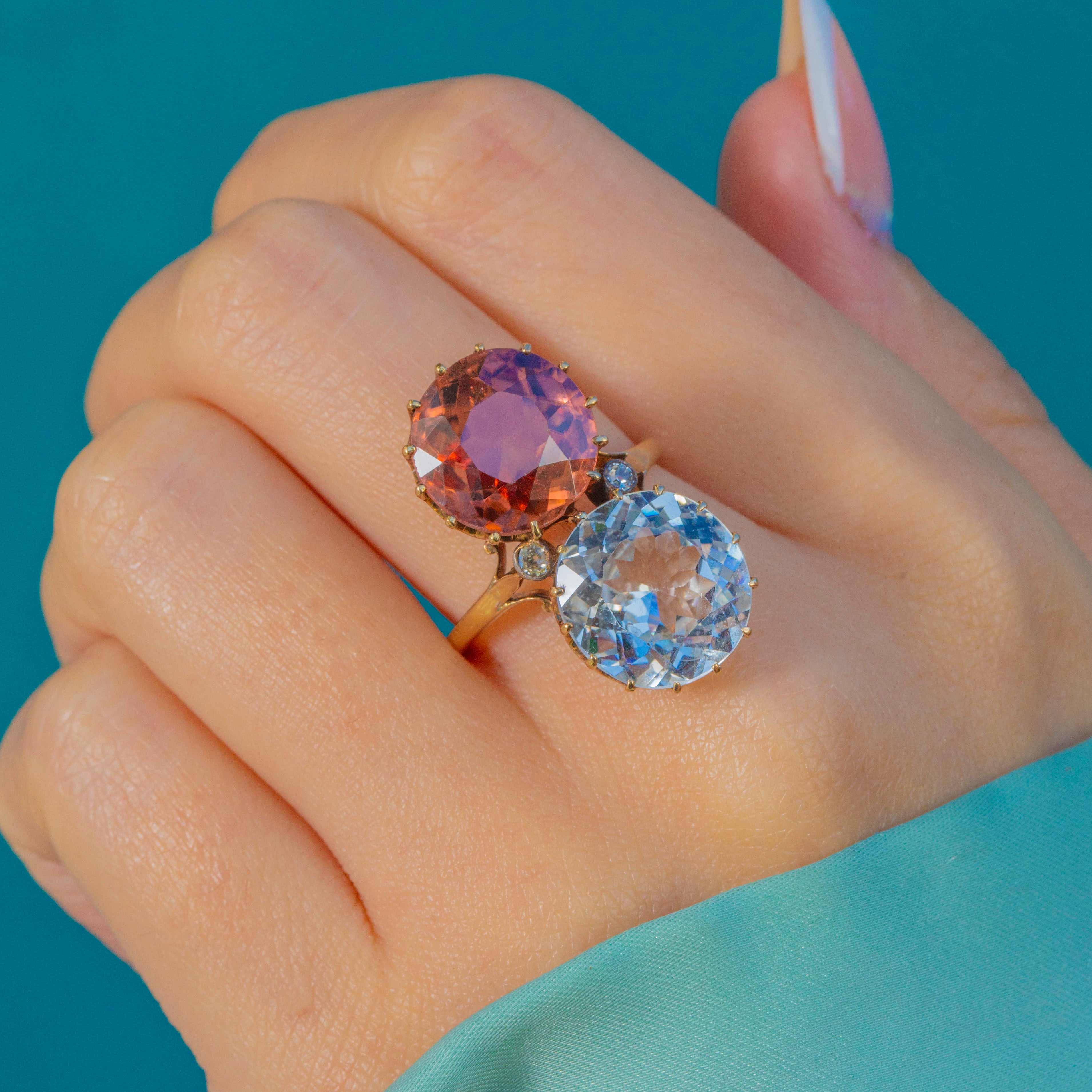 A striking Victorian toi et moi ring marrying colour, romance and scale. Twin antique round-cut Zircons totalling an impressive 14.00ct —one an icy blue, the other a warm peach‑pink—rise proudly in tall coronet claw settings atop an 18ct Gold mount. Their open backs and airy, scalloped galleries invite the light, creating a vivid duet that dances across the finger.