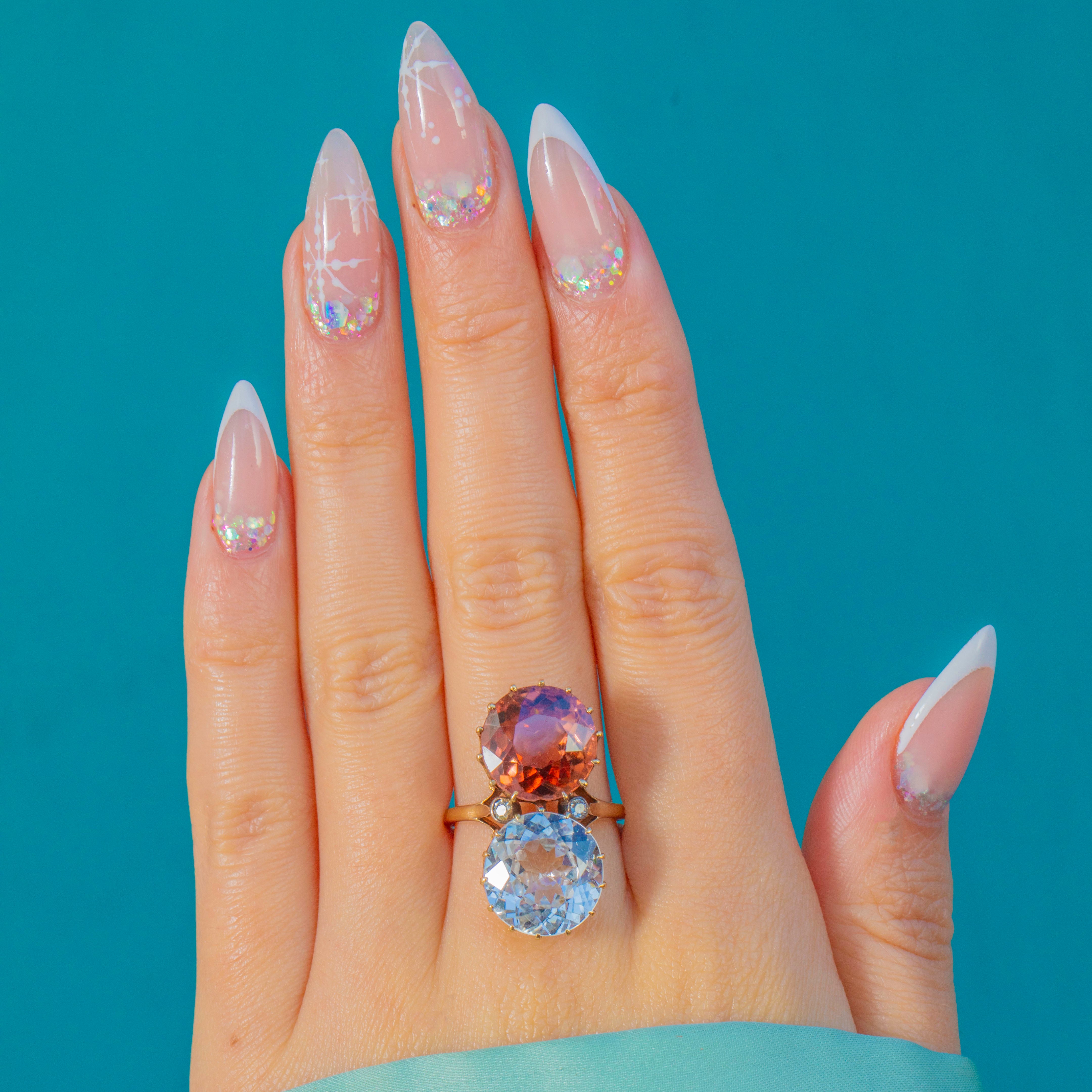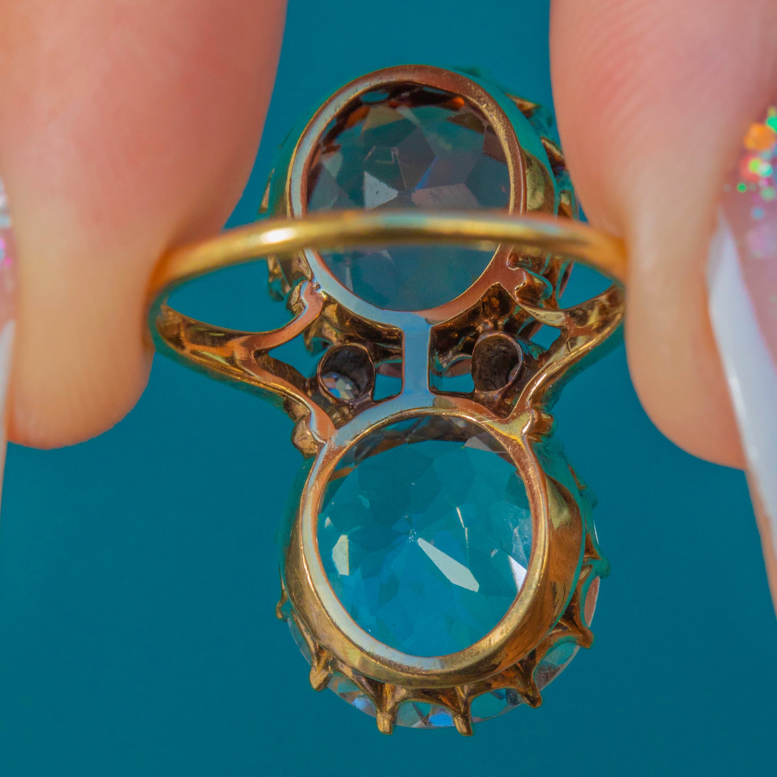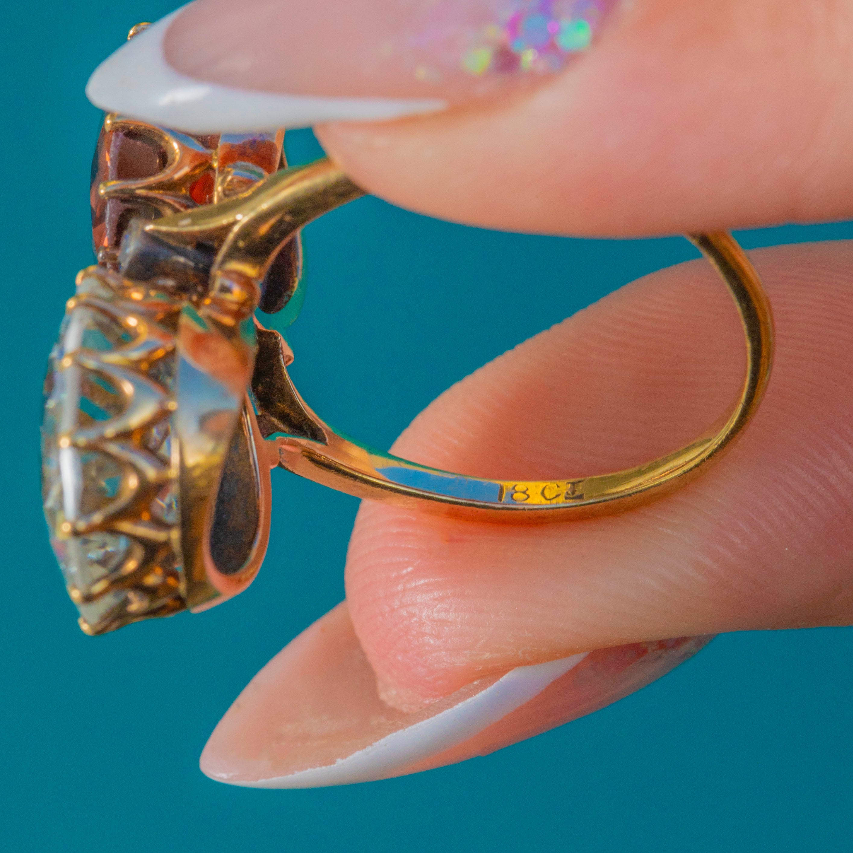 A striking Victorian toi et moi ring marrying colour, romance and scale. Twin antique round-cut Zircons totalling an impressive 14.00ct —one an icy blue, the other a warm peach‑pink—rise proudly in tall coronet claw settings atop an 18ct Gold mount. Their open backs and airy, scalloped galleries invite the light, creating a vivid duet that dances across the finger.