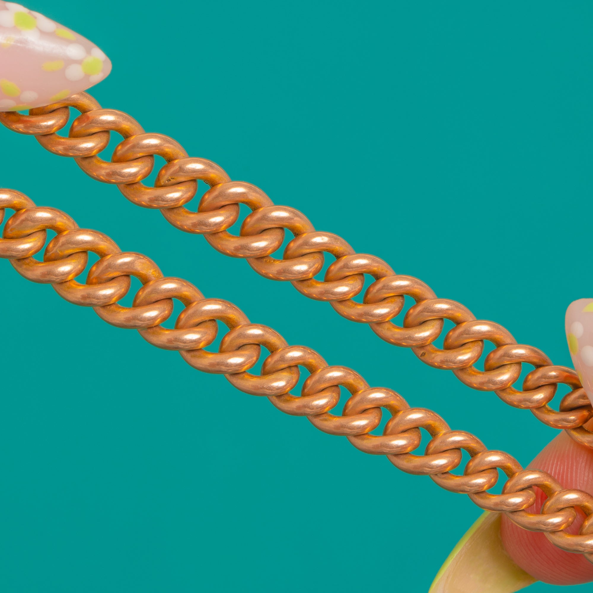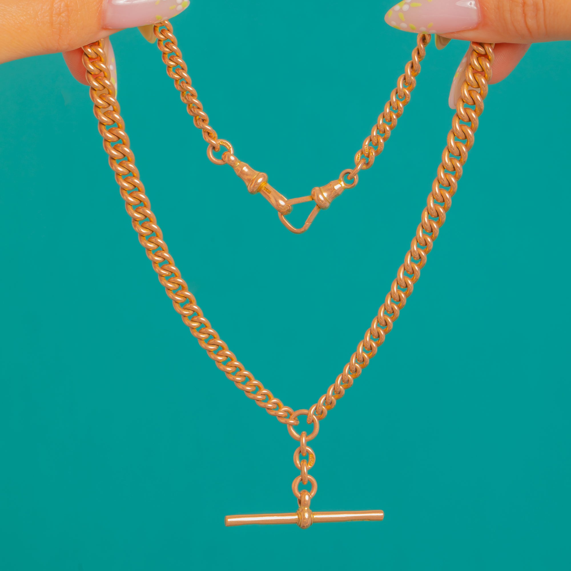 Substantial and beautifully made, this Victorian 9ct Gold Albert chain showcases classic curb links with a warm, rosy glow. The uniform links flow into a tubular T-bar and dog-clips, creating that timeless, utilitarian elegance collectors adore.