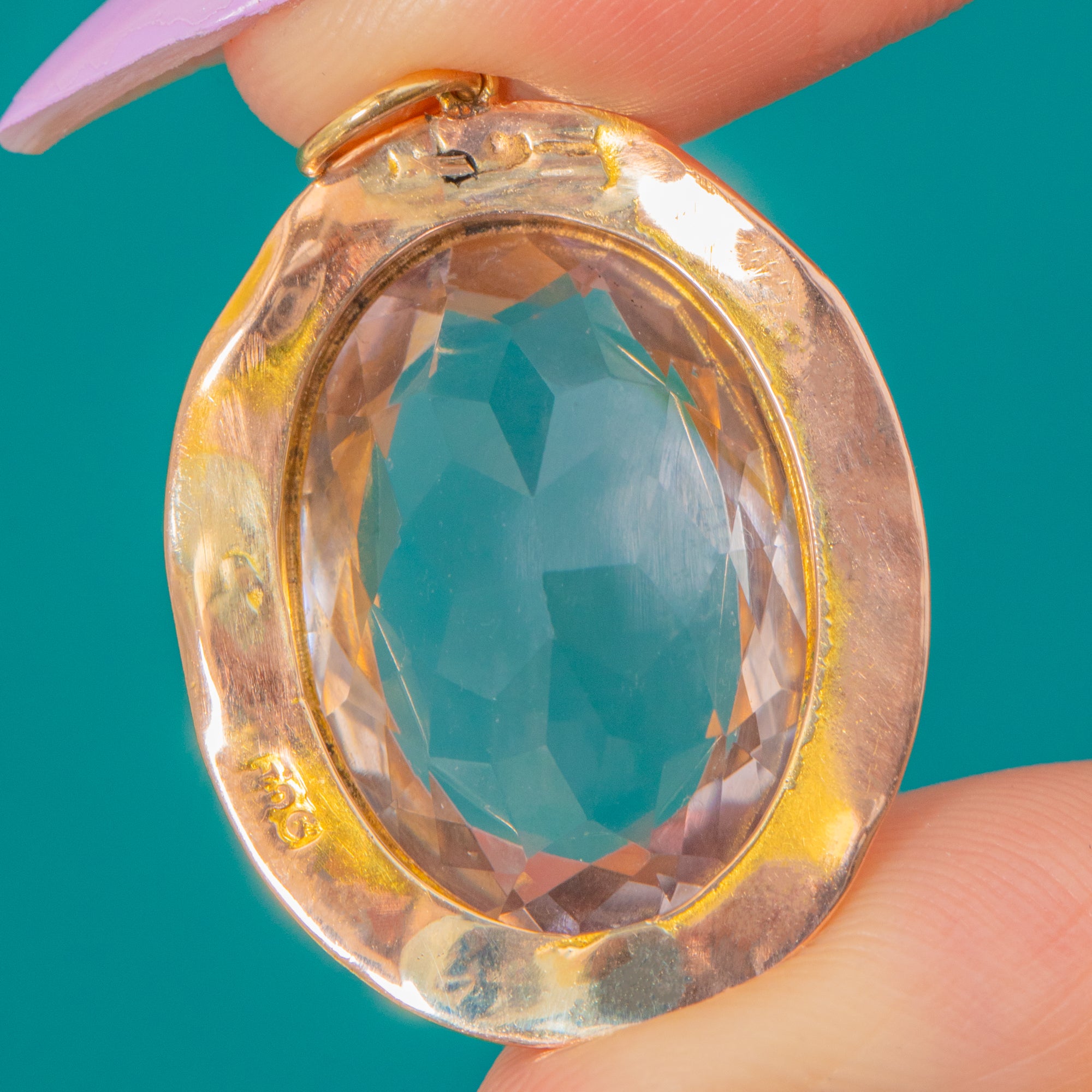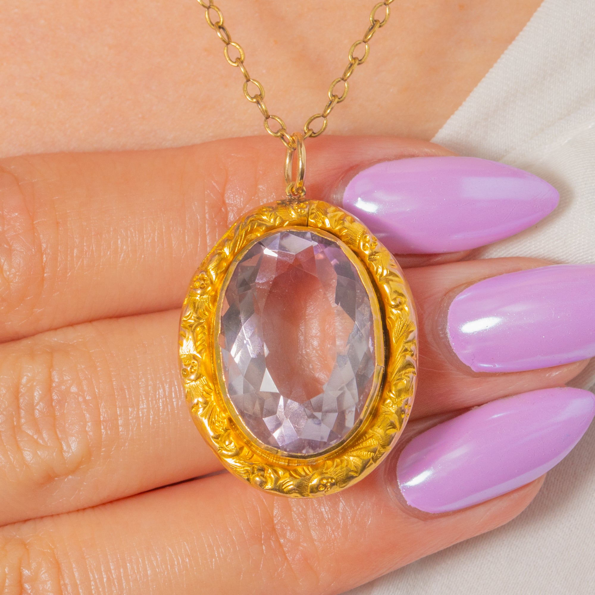 A romantic early Victorian pendant ablaze with soft lilac tones, this statement Amethyst is cradled in rich 9ct Gold. The large oval stone is bezel set and framed by a high-relief chased foliate border with delicate rosette accents, giving the piece wonderful texture and movement.