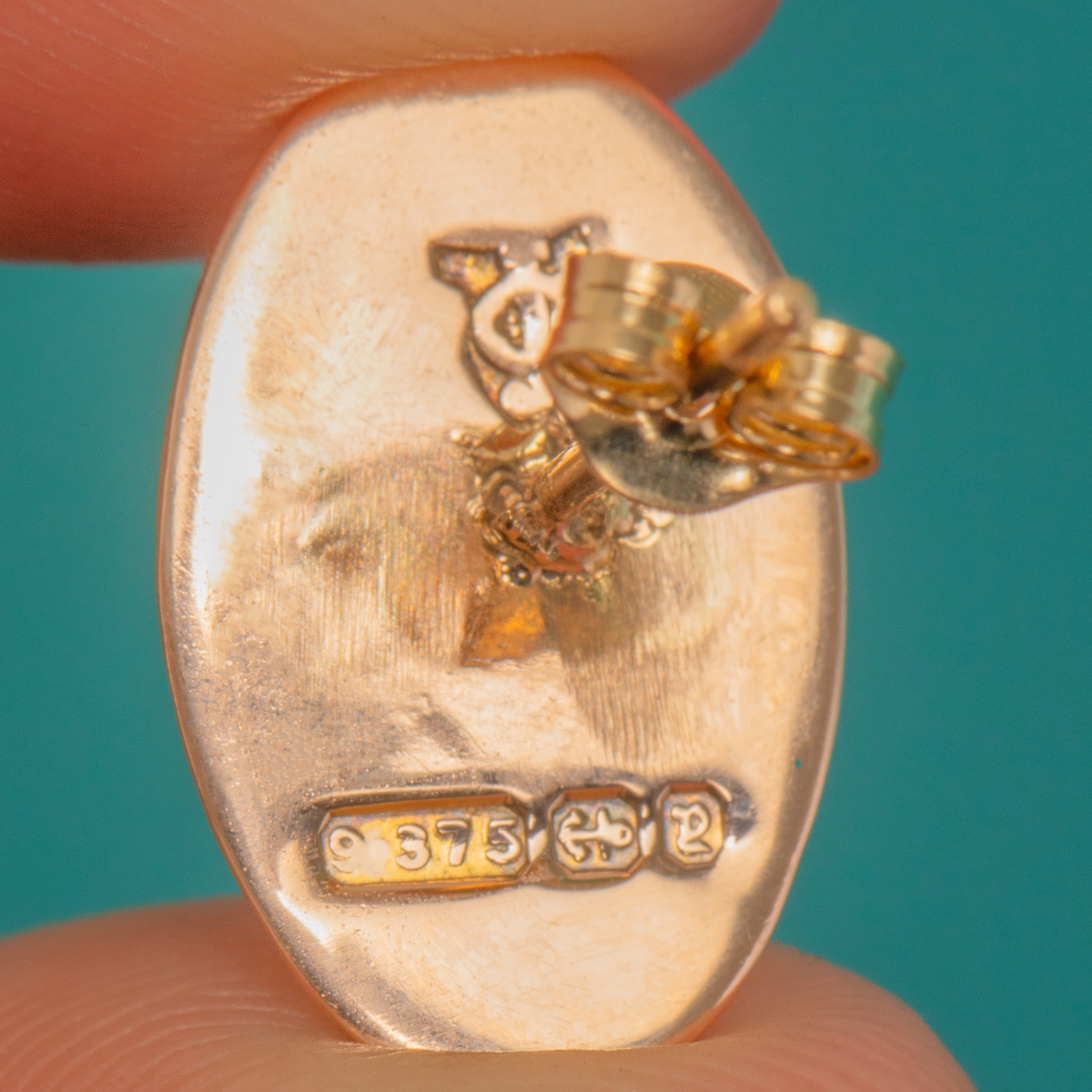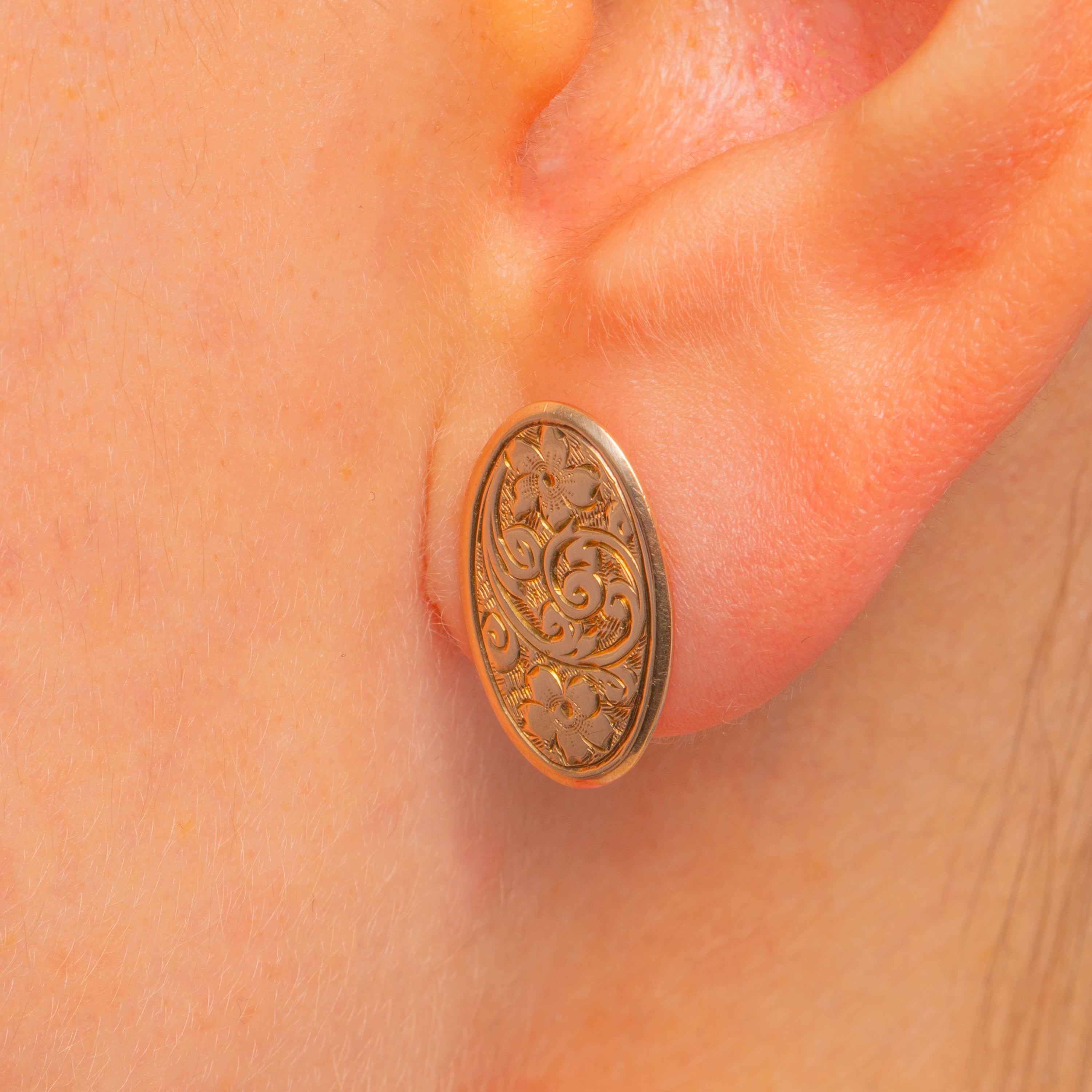 Delicately ornate and unmistakably Victorian, these 9ct Gold oval studs are miniature works of art. Each face is richly engraved with scrolling foliage and tiny five-petaled flowers, the polished relief glowing against a finely textured, stippled ground. A softly raised rim frames the design, lending a refined, button-like profile in warm, buttery Gold.