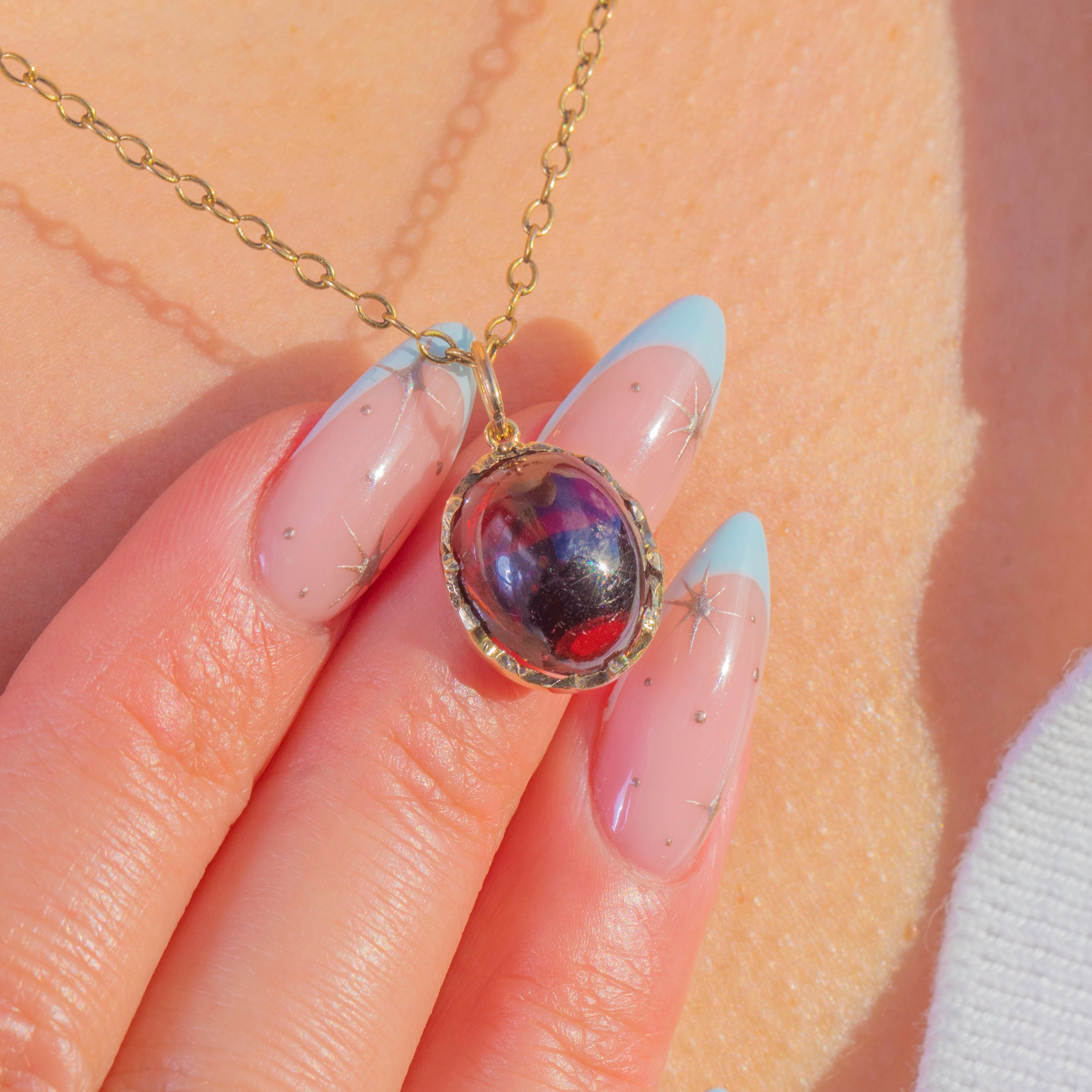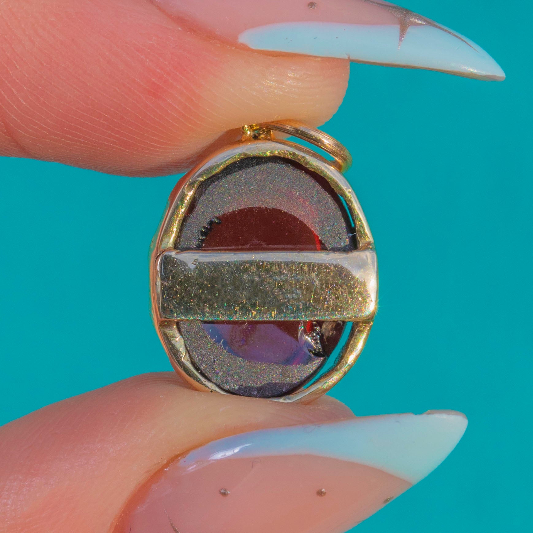A petite Victorian treasure, this charming Garnet pendant showcases a rich claret-red cabochon displayed in a textured setting of buttery 15ct Gold. The high-domed 9.27ct Garnet catches the light beautifully, its glossy surface and deep wine tones offering a romantic glow that feels timeless and elegant.