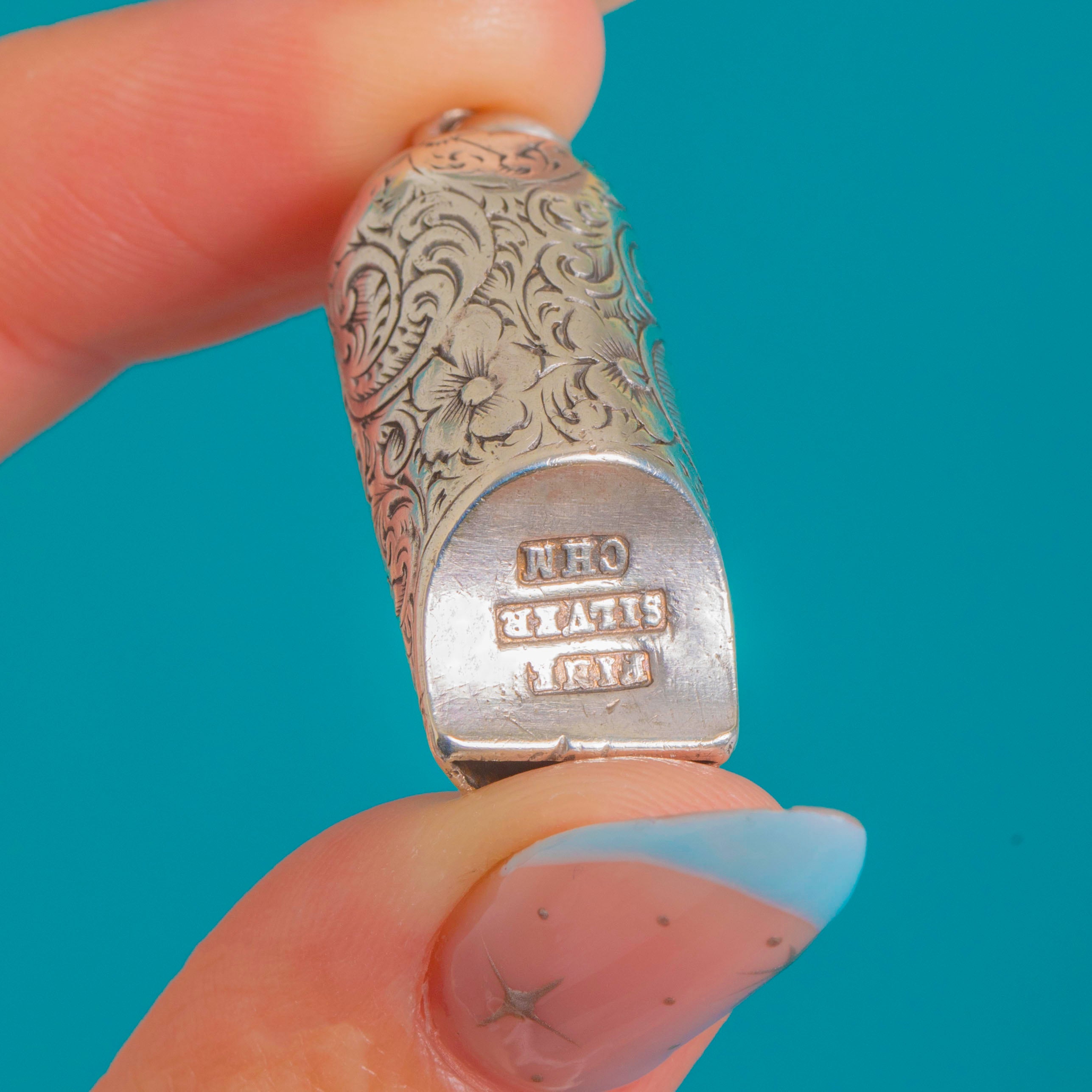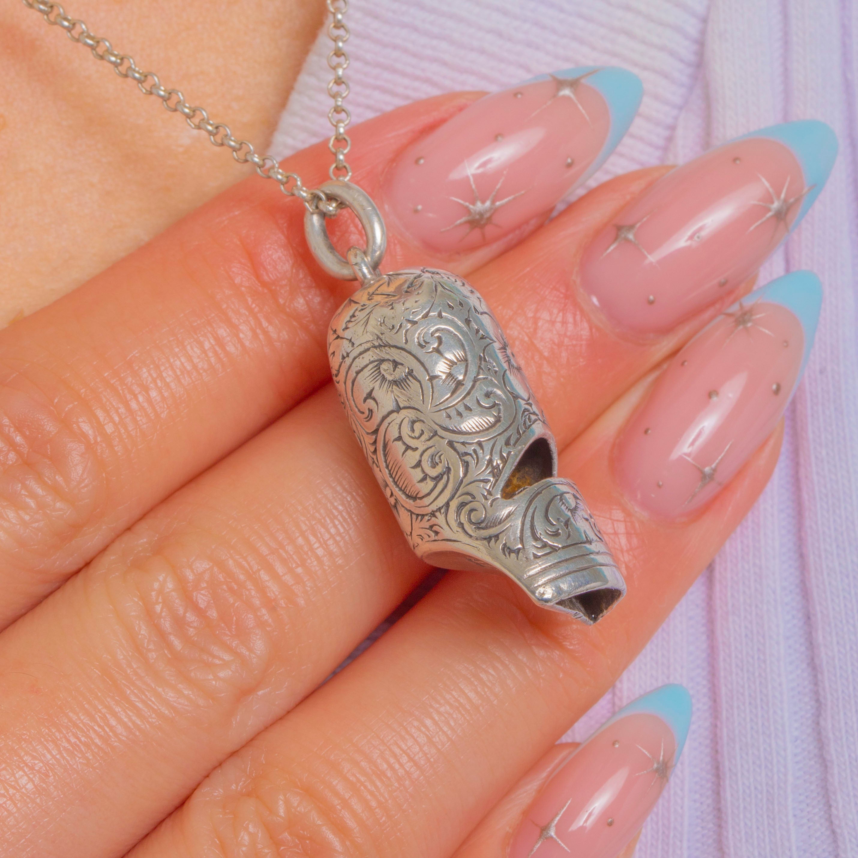An ornate Victorian novelty with a practical twist, this Fine Silver whistle pendant is richly hand-engraved with scrolling foliage and tiny flowers across its tubular body and domed cap. The bright-cut work dances with light, while gentle patina in the recesses lends beautiful depth and character.