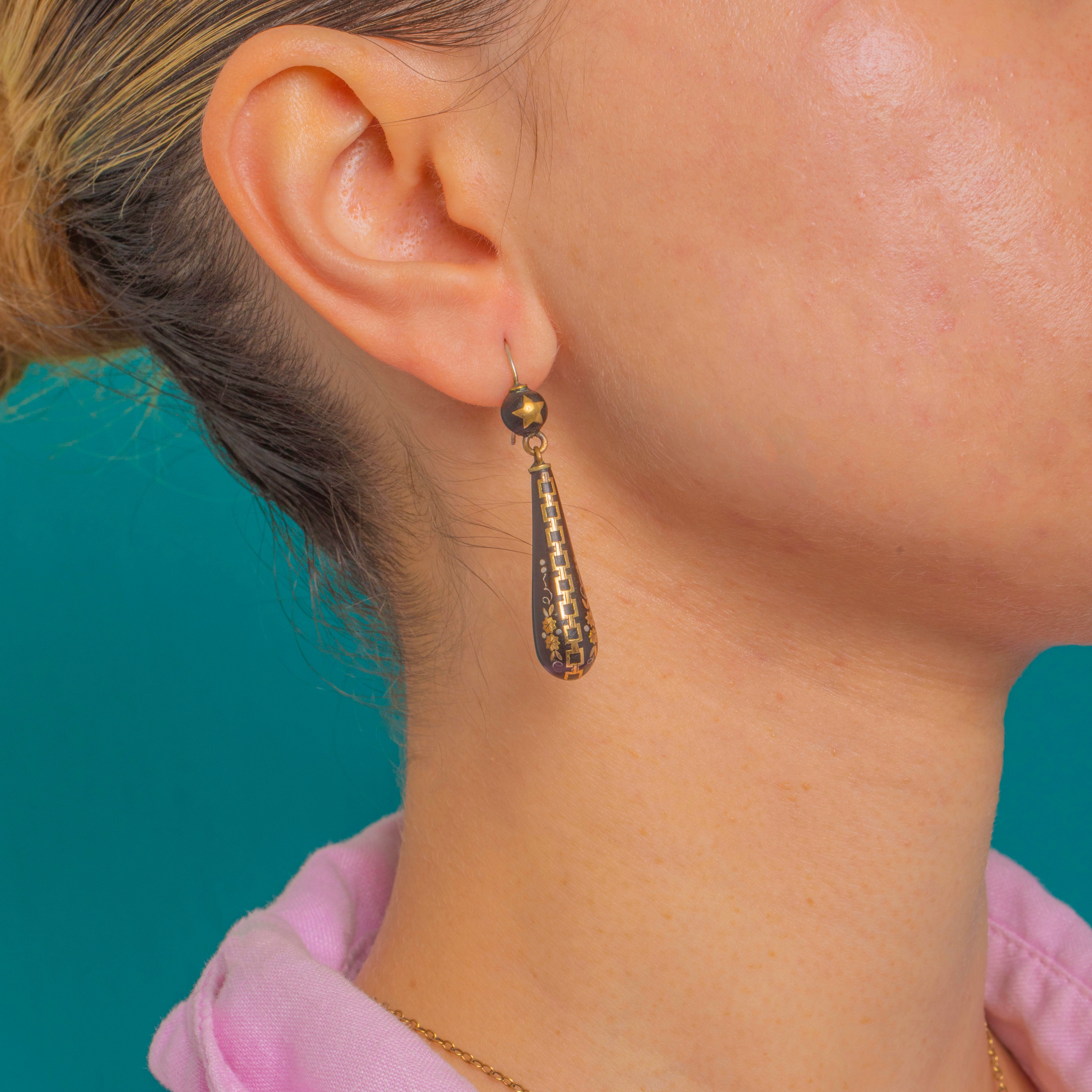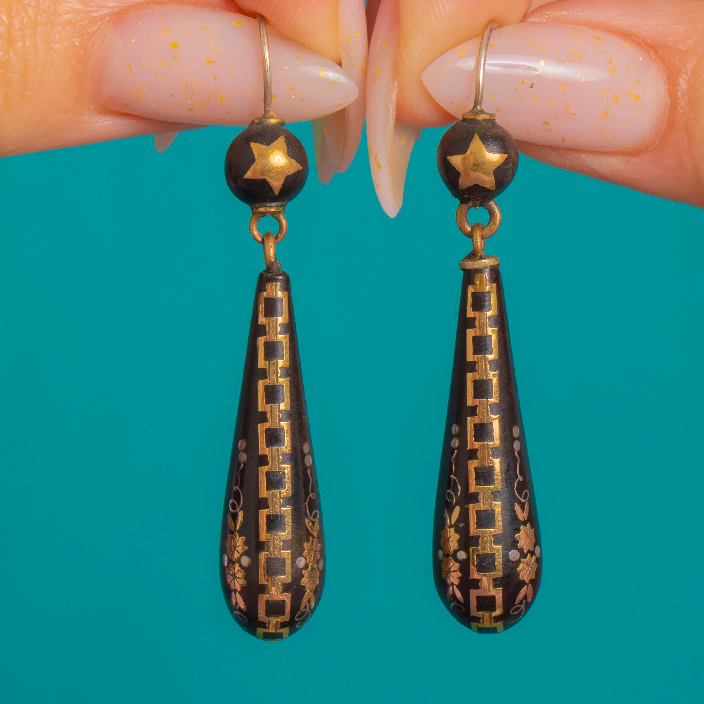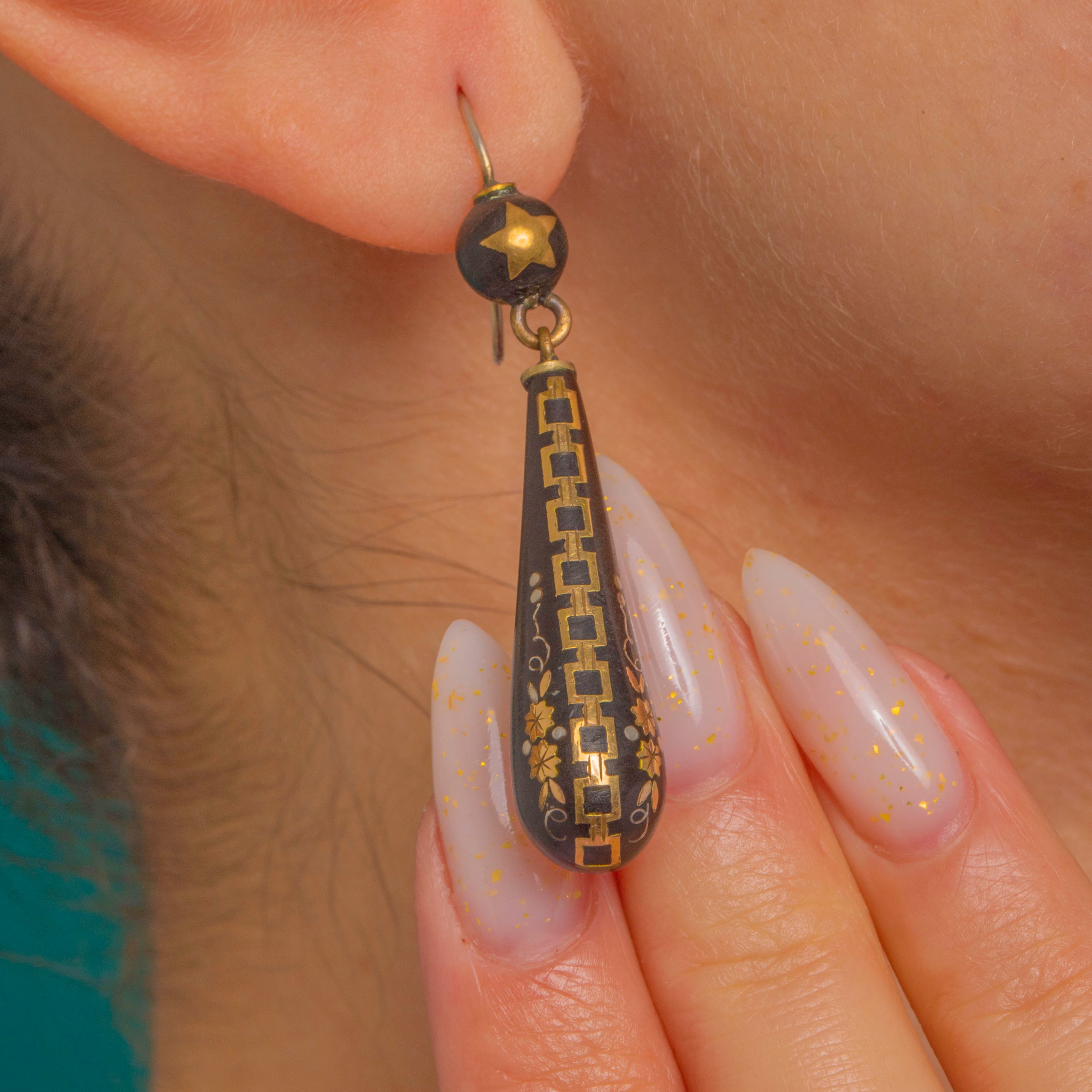 Graphic and elegant, these Victorian Piqué drop earrings marry inky black with glints of Gold and Silver inlay. A petite round bead with a five-point star suspends a tapered torpedo teardrop, all articulated for graceful movement. The surface is finely worked with geometric borders, chain-like bands and delicate foliate sprays, creating a striking black-and-gold contrast emblematic of the era’s refined taste.