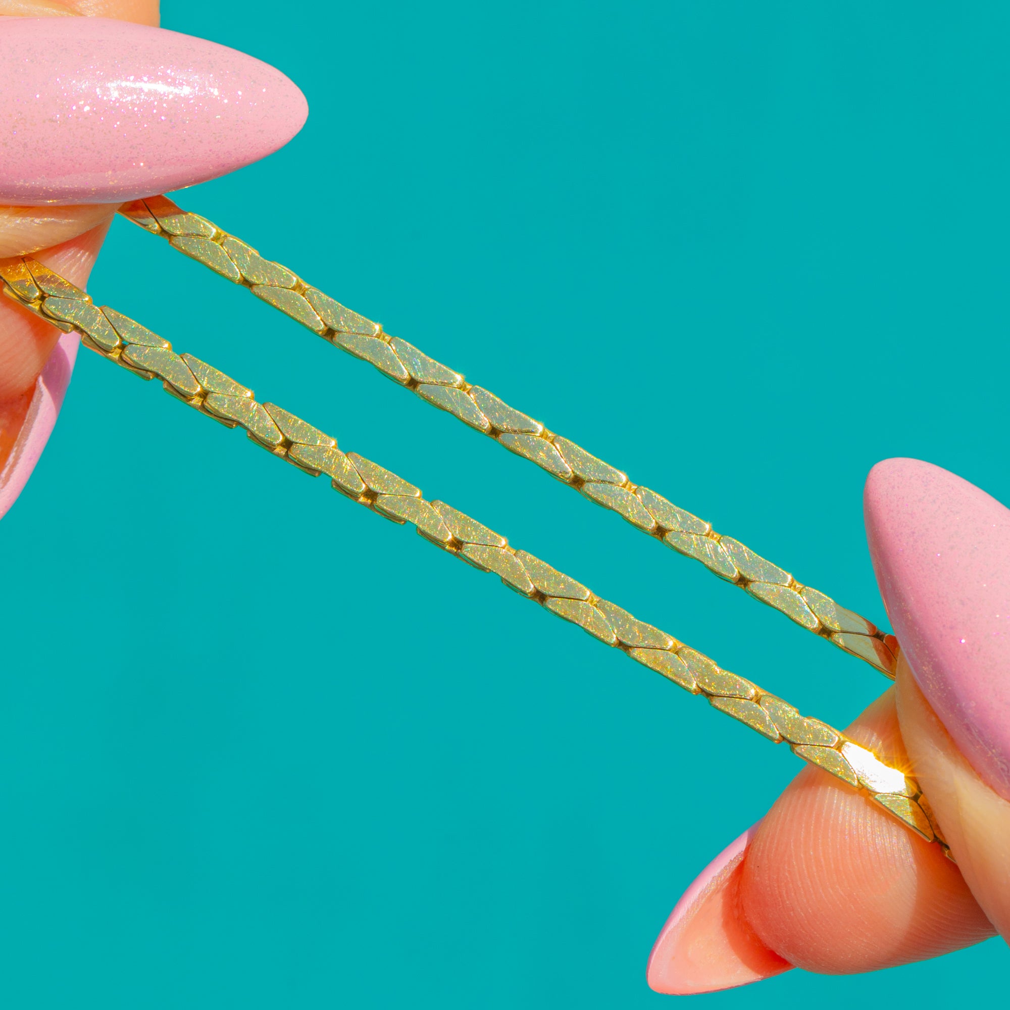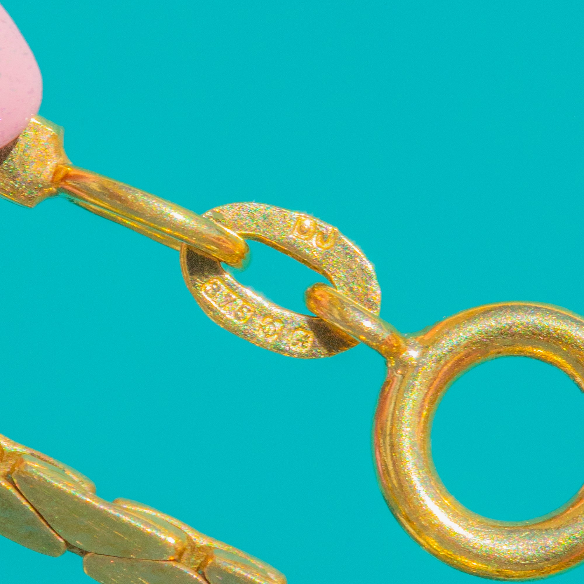 A glamorous 1970s statement in glowing 9ct Gold, this fancy Y‑style necklace centres on a sculptural ribbon‑knot with sleek tassel drops. The high‑polish, flat ribbon‑style links catch the light beautifully, giving that bold, retro allure the era is loved for.