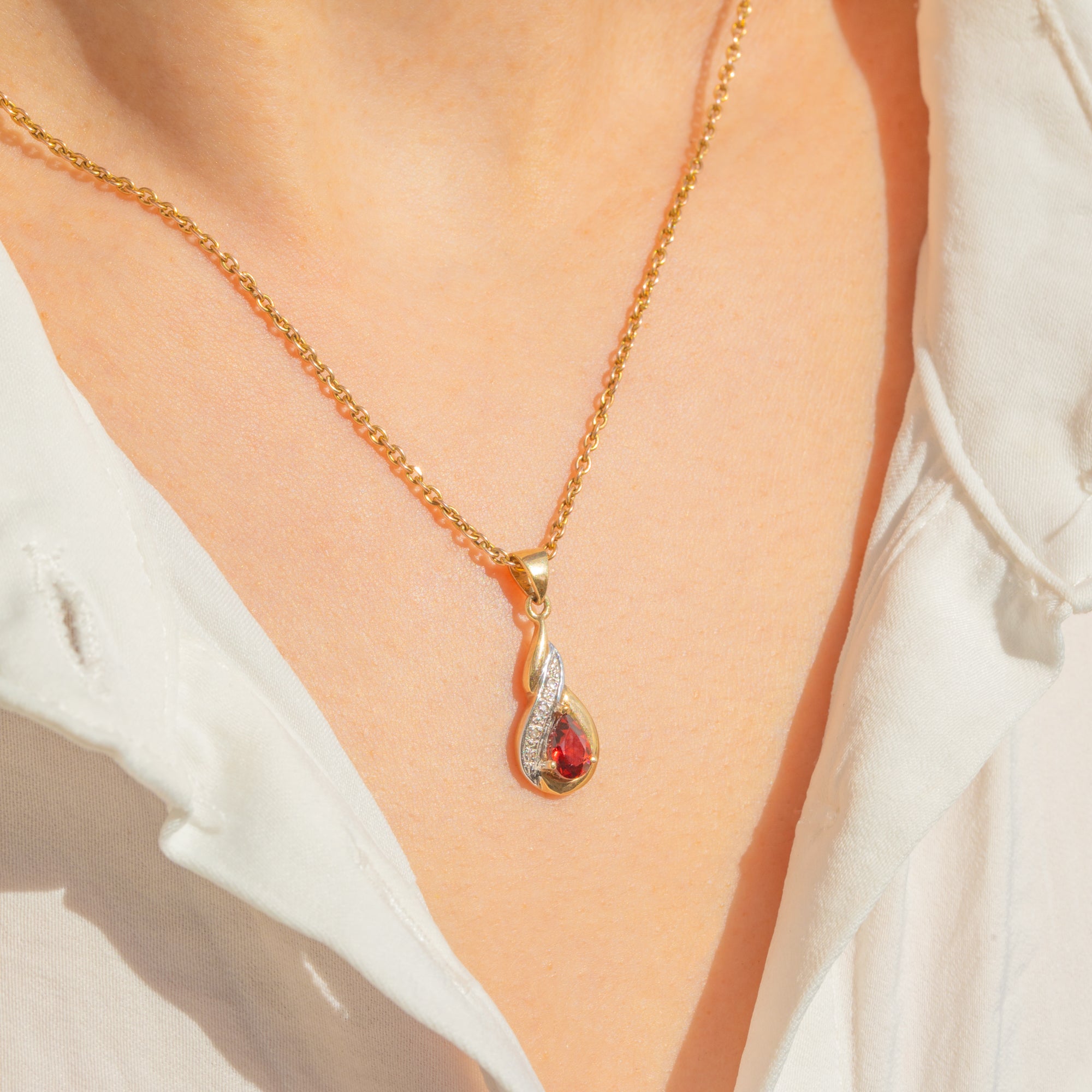 A romantic pear-shaped Garnet glows at the heart of this 9ct Gold drop, its rich red facets swept by a delicate Diamond-set ribbon. Petite yet poised, the teardrop silhouette and tapered bail bring a refined vintage elegance to the neckline.