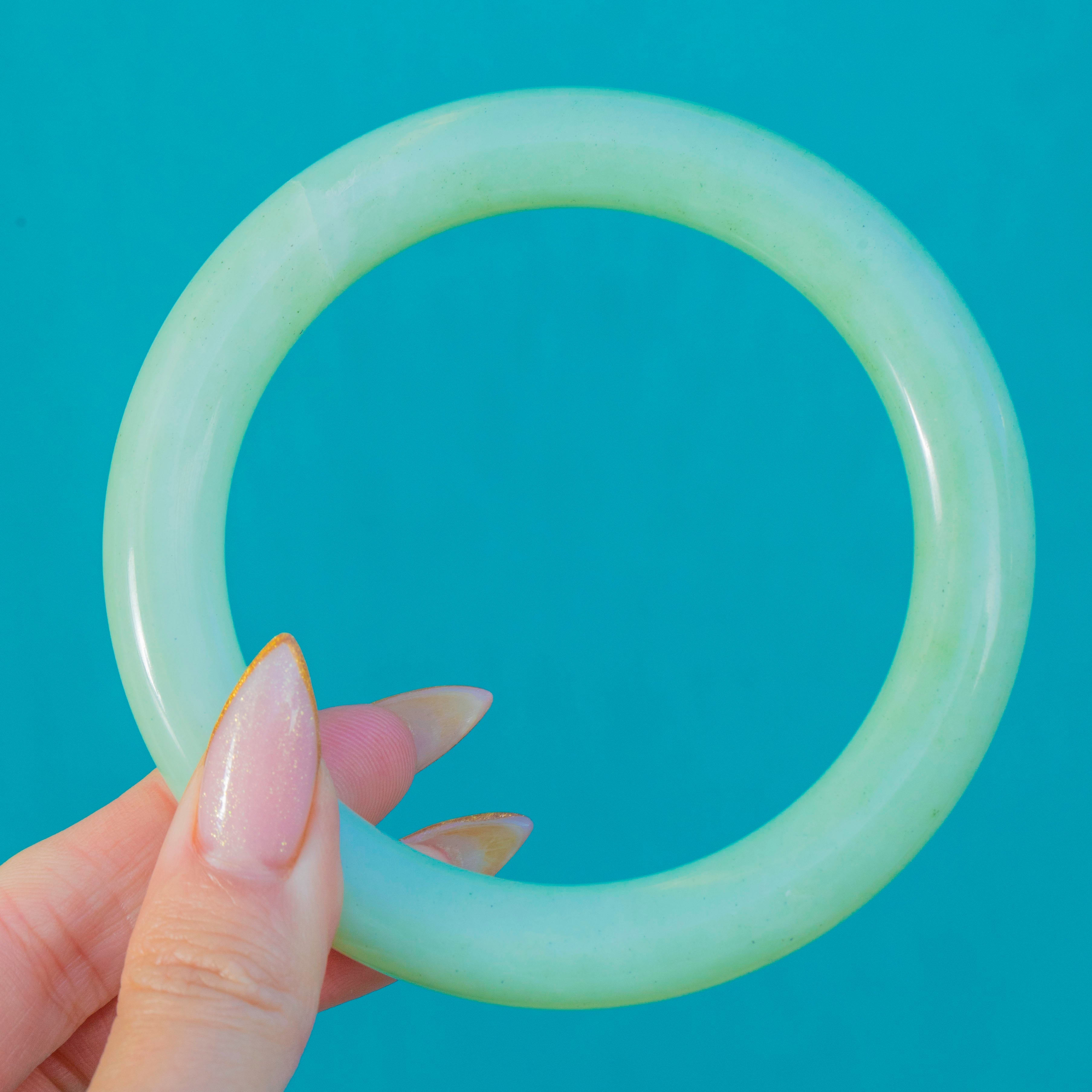 This beautiful vintage Jade bangle has a wonderfully smooth, polished finish and a serene green tone throughout. Its generous width and weight give it a luxurious, substantial feel on the wrist, while the classic rounded profile makes it comfortable for everyday wear.