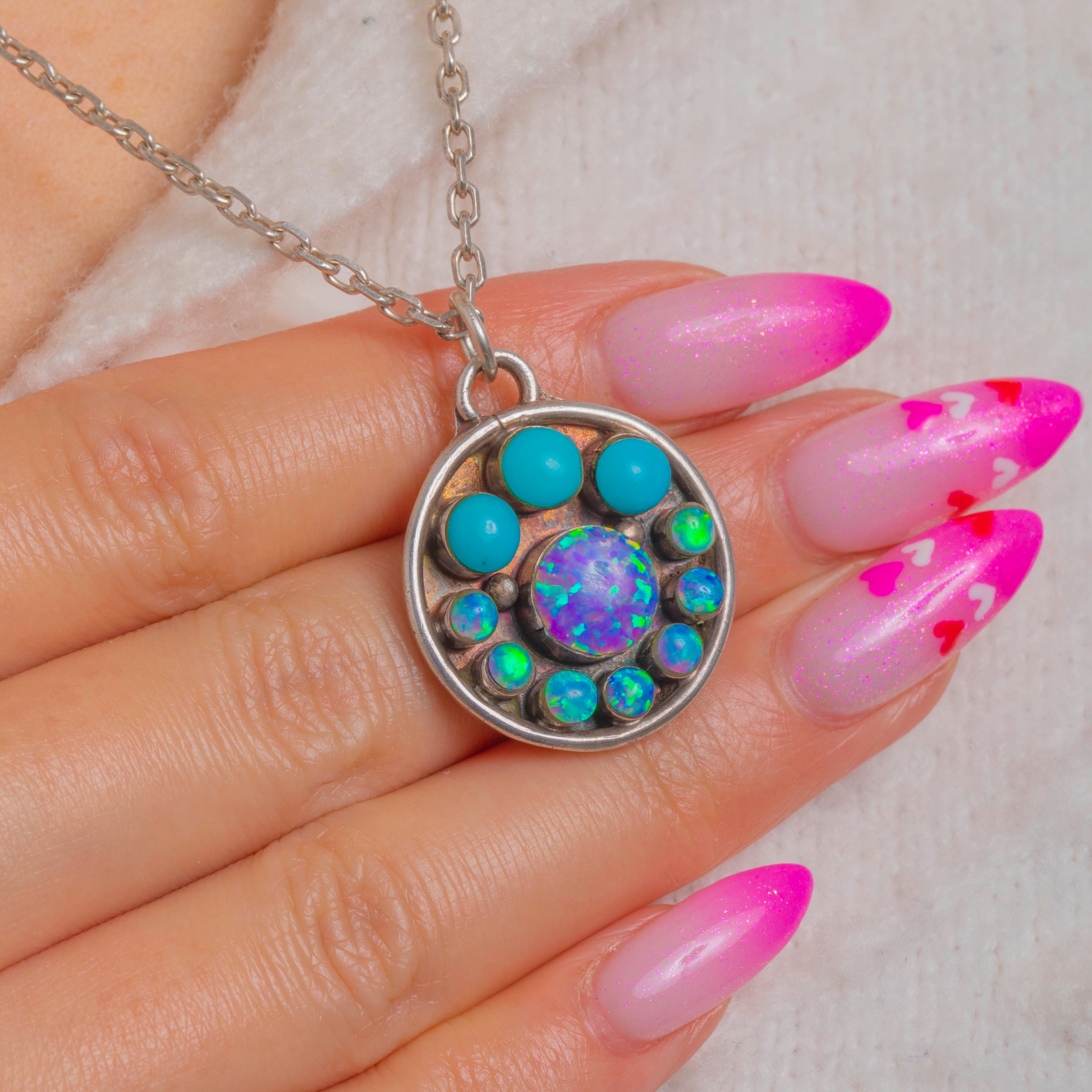 A vibrant Vintage pendant necklace brimming with colour and texture. A domed Opal Doublet shimmers at the centre with electric greens, blues and violets, encircled by a halo of smaller Opal Doublet cabochons for a glowing, mandala-like effect. Three bright Turquoise cabochons crown the composition, lending a joyful pop of sky-blue contrast.