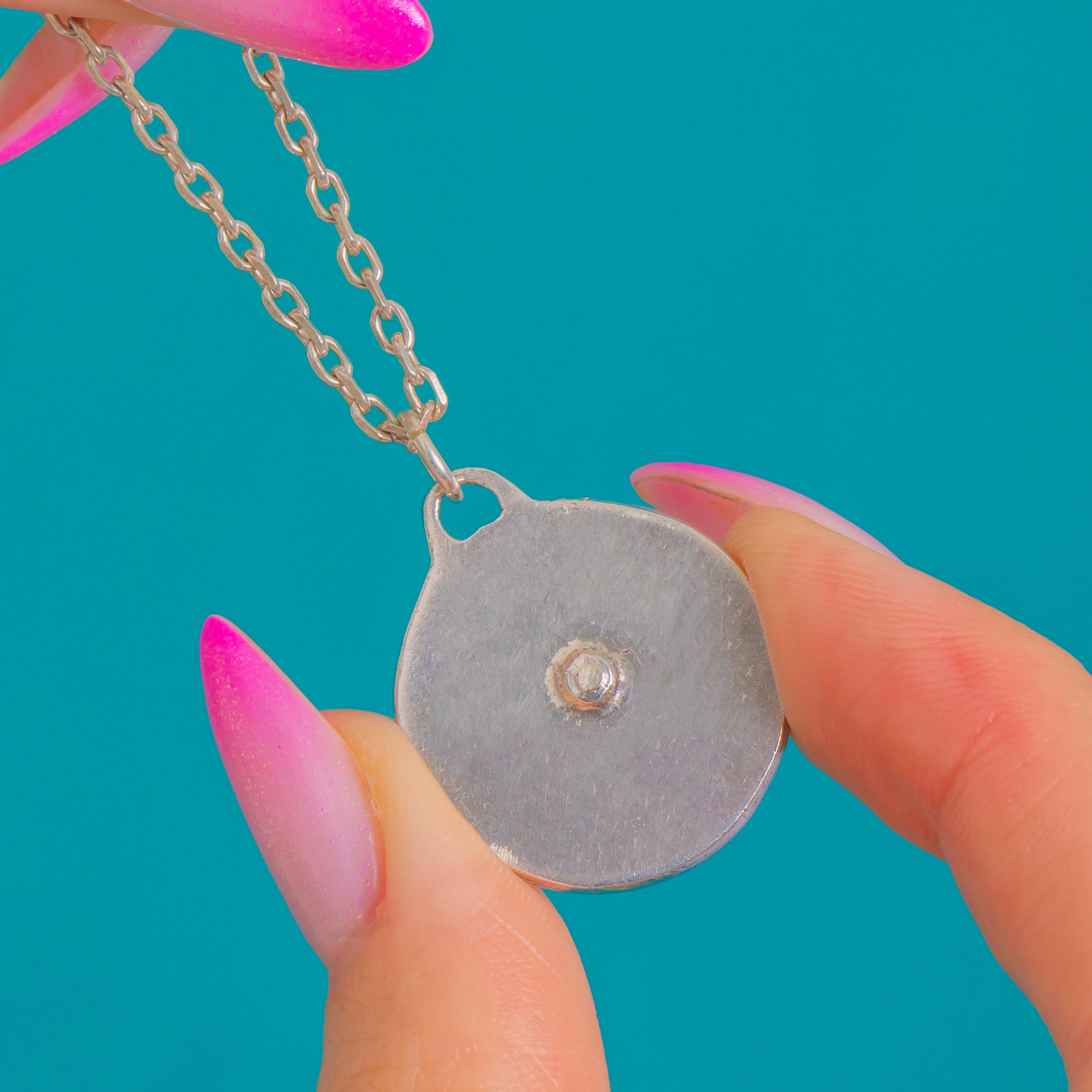 Crafted in Silver with softly darkened recesses, the circular frame and neat closed bezels give the piece a beautifully finished, tactile presence. Suspended from a fine Silver chain, it’s a playful yet polished jewel that layers effortlessly and brings instant radiance to every look.