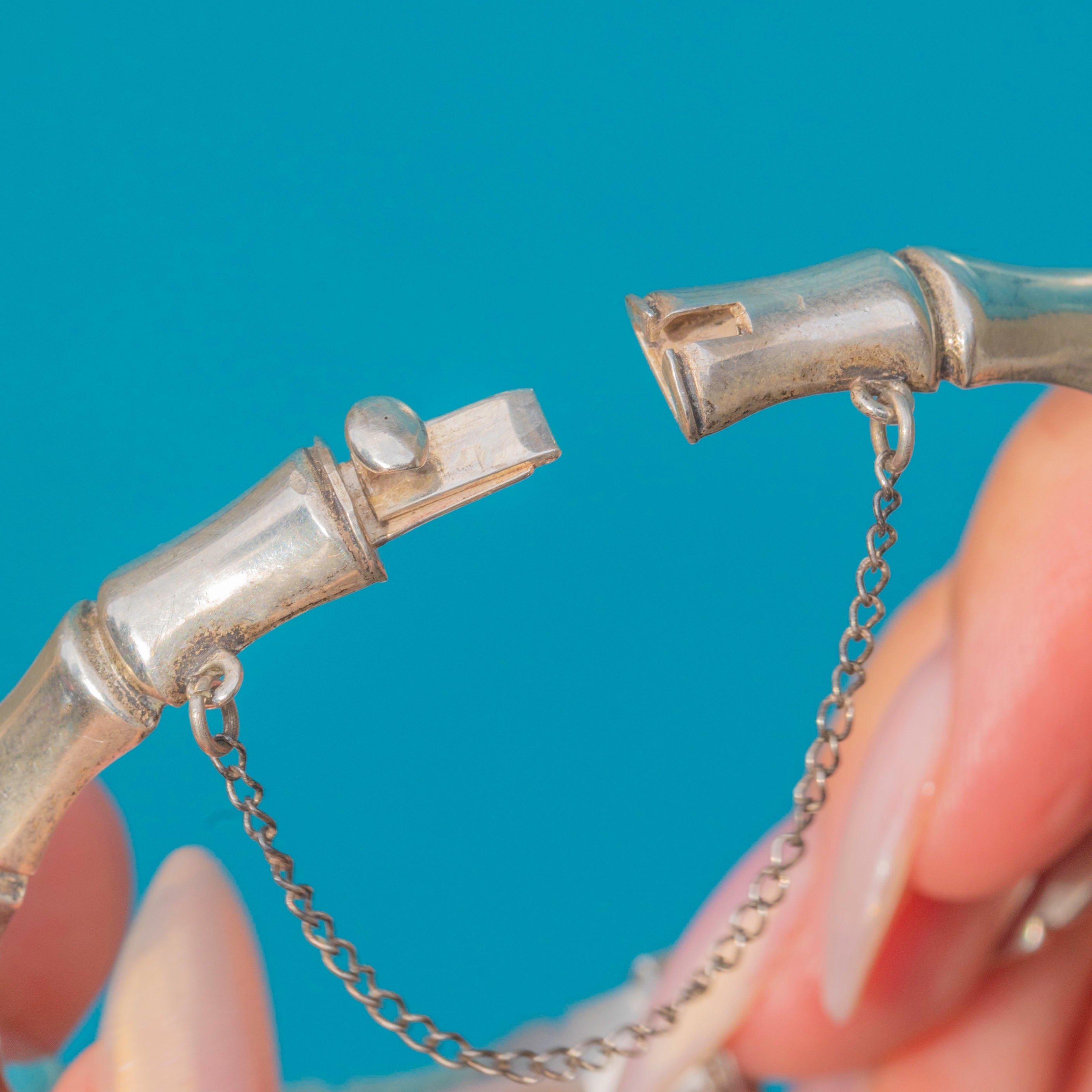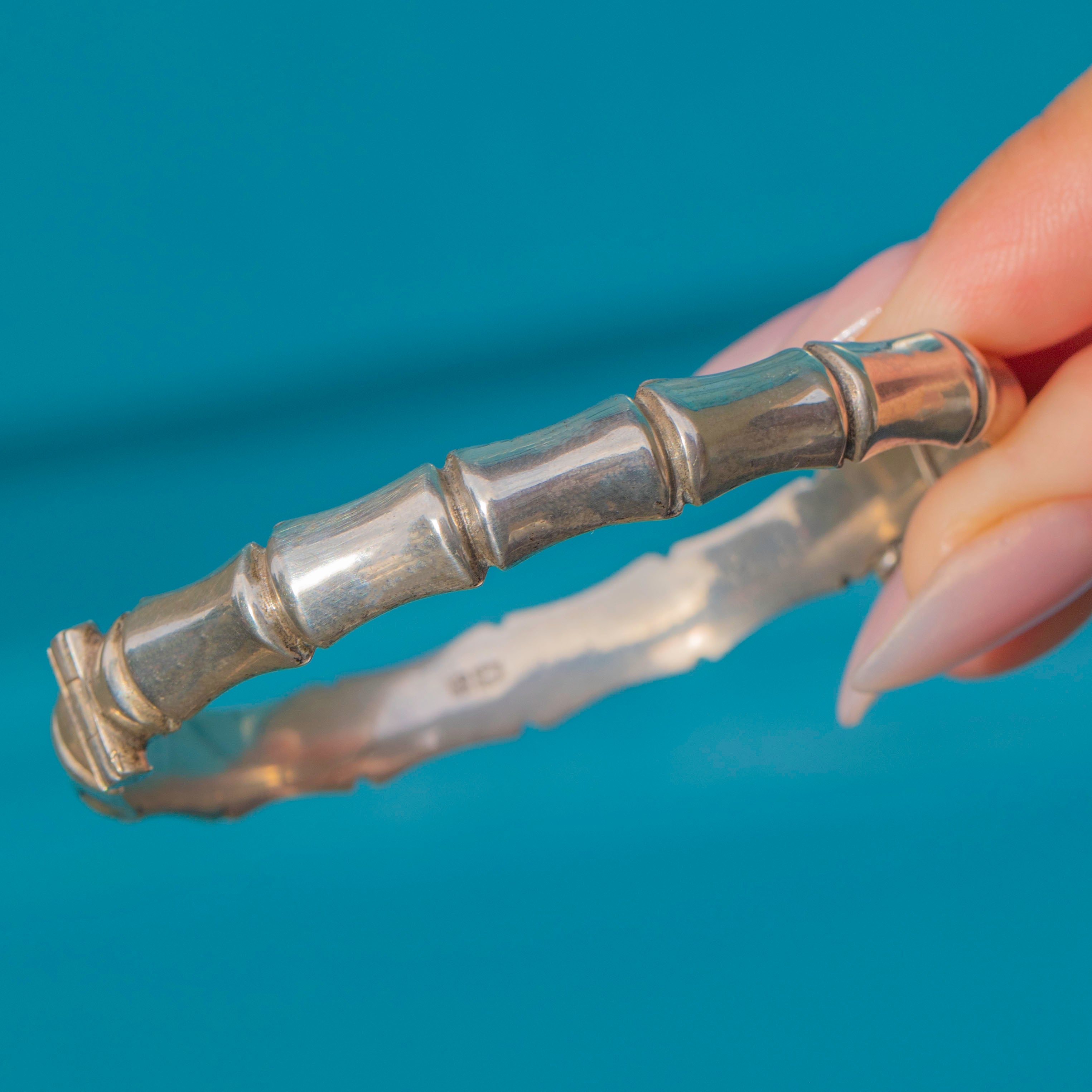 This fabulous Vintage Sterling Silver bangle captures the spirit of the 1960s with its bold bamboo design. Beautifully sculpted to mimic the natural nodes of bamboo, it has a stylish, organic feel that is as chic today as it was when first crafted.