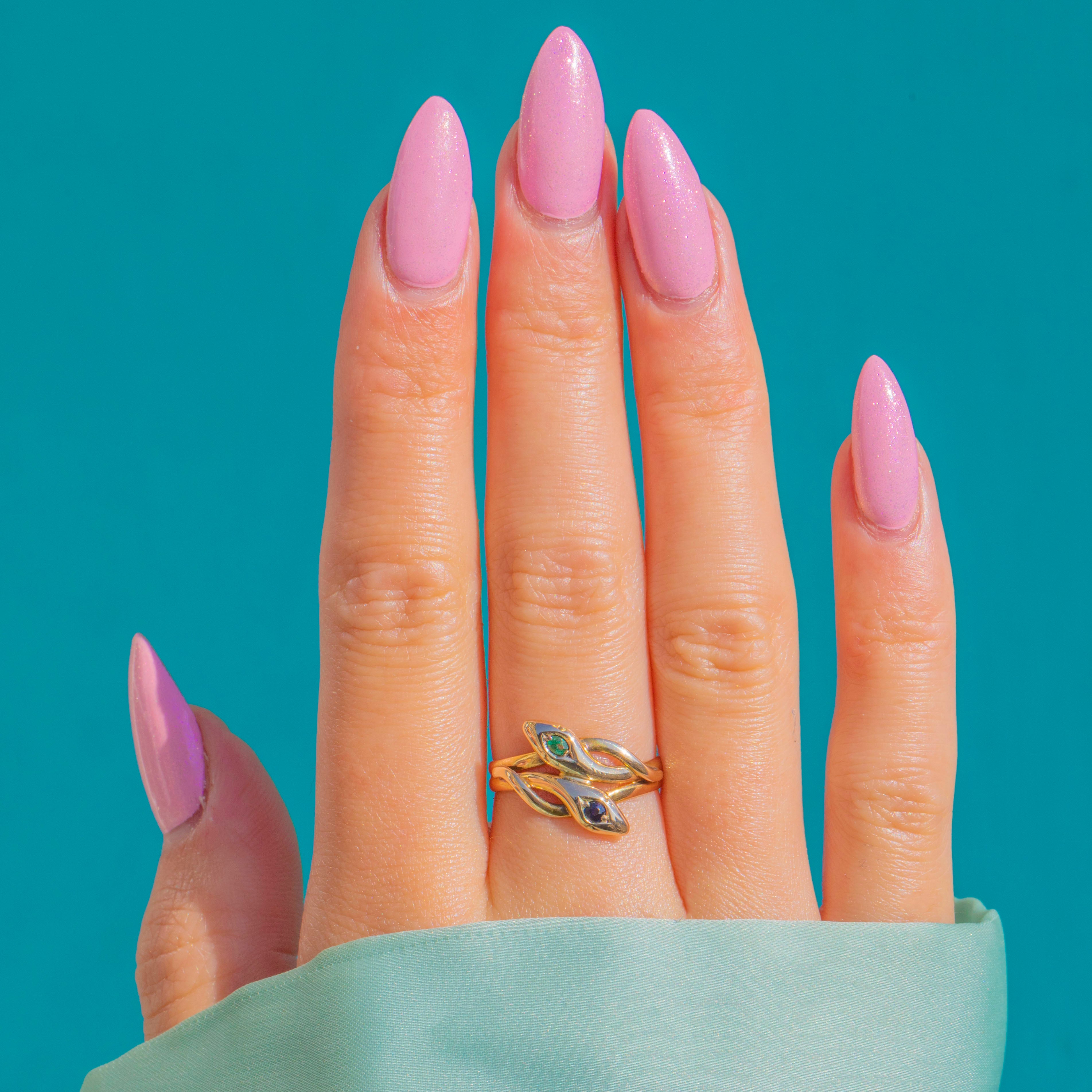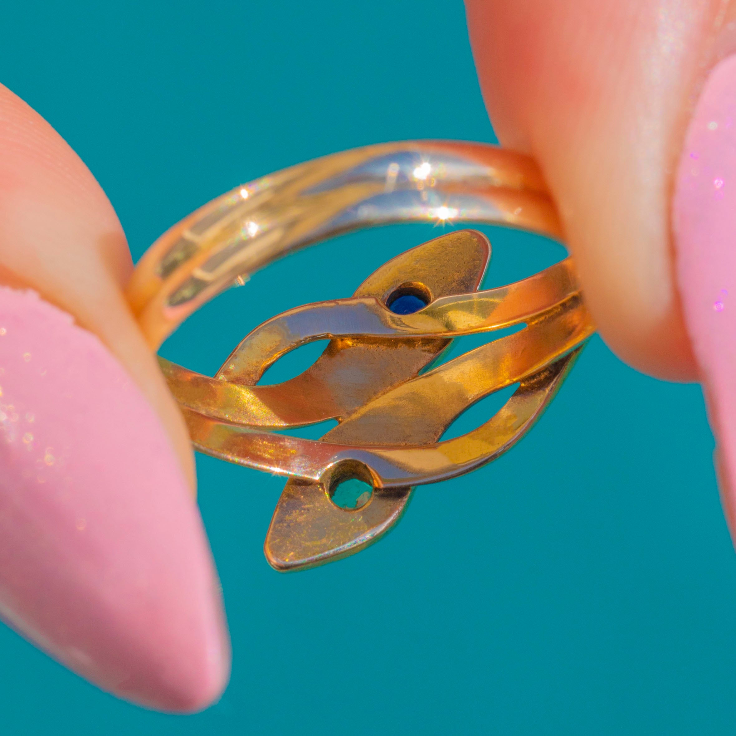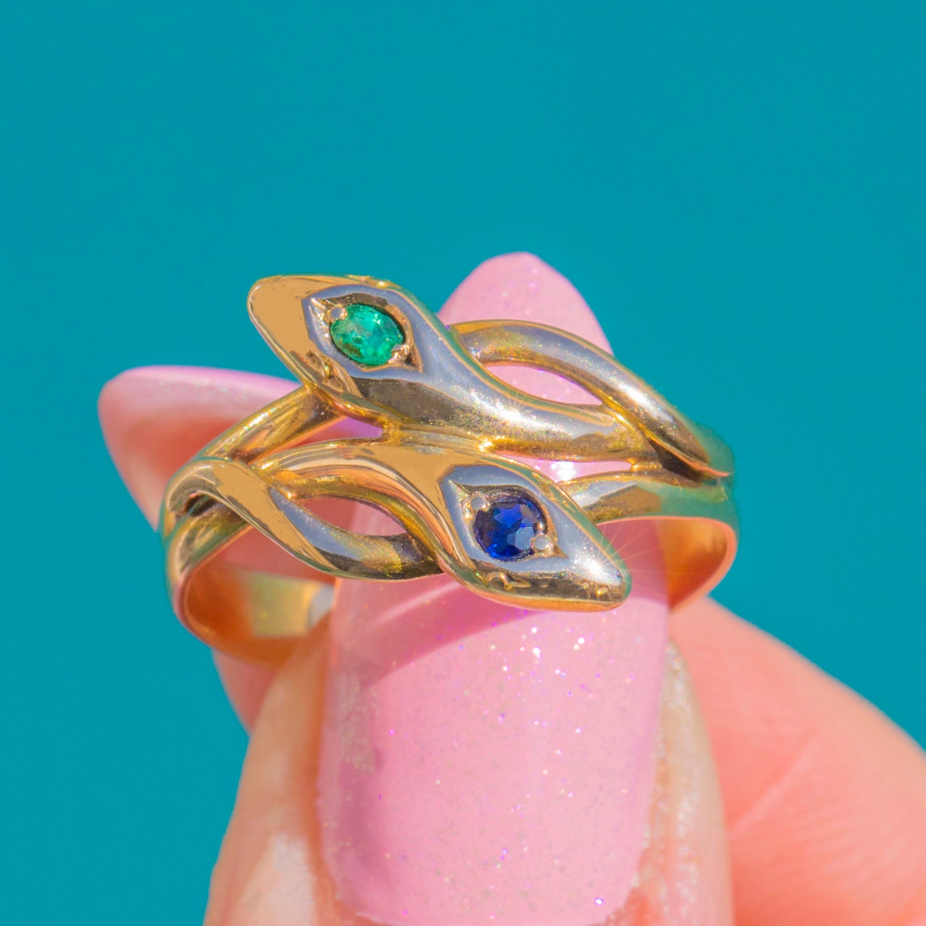 Geschwungen und skulptural windet sich dieser gedrehte Schlangenring anmutig in 14ct Gold, wobei sich die verflochtenen Stränge in einem Duo aus blattförmigen Köpfen vereinen. Ein leuchtender Smaragd und ein tief samtiger Saphir funkeln aus eleganten Zargenfassungen und verleihen der organischen, fließenden Silhouette einen raffinierten Farbakzent.