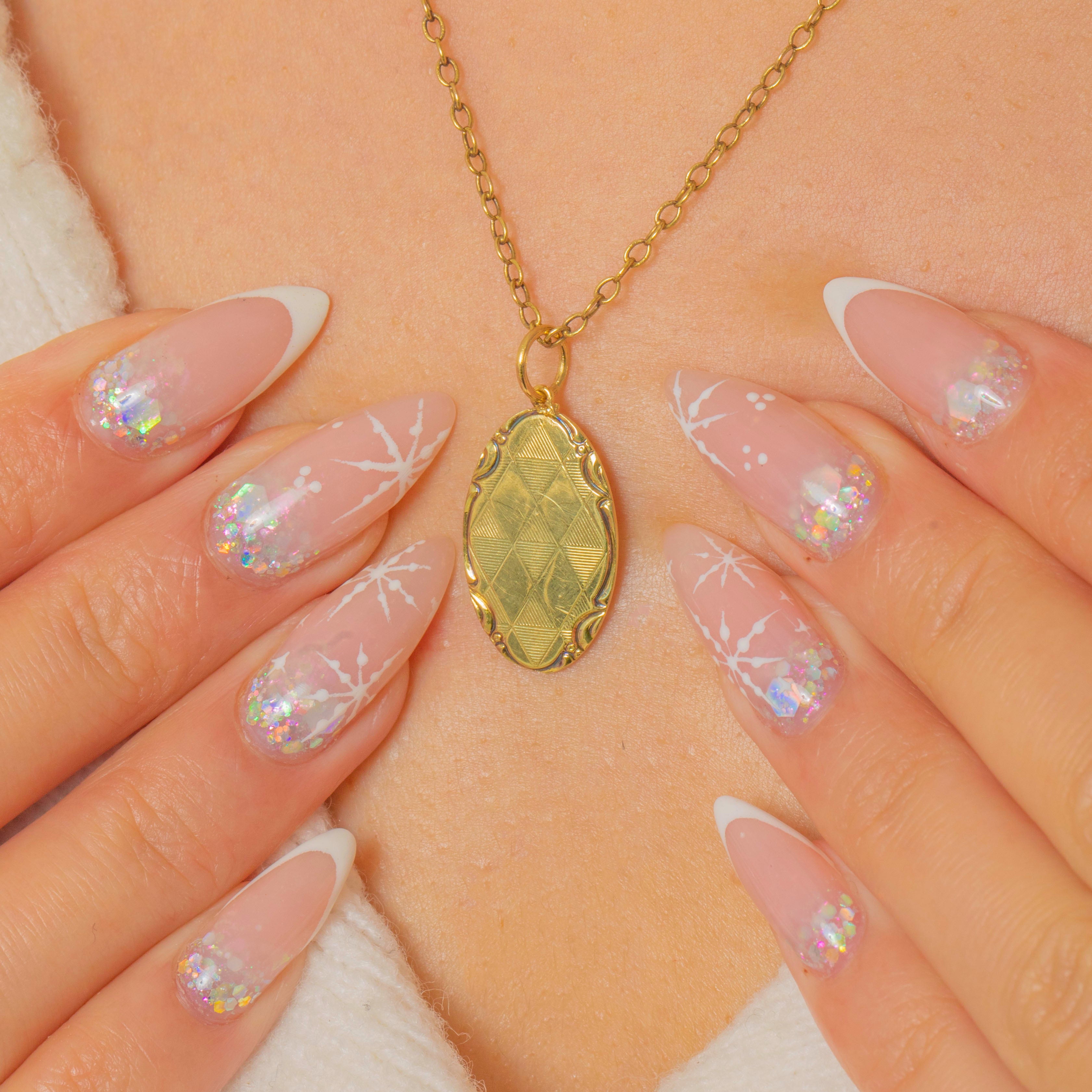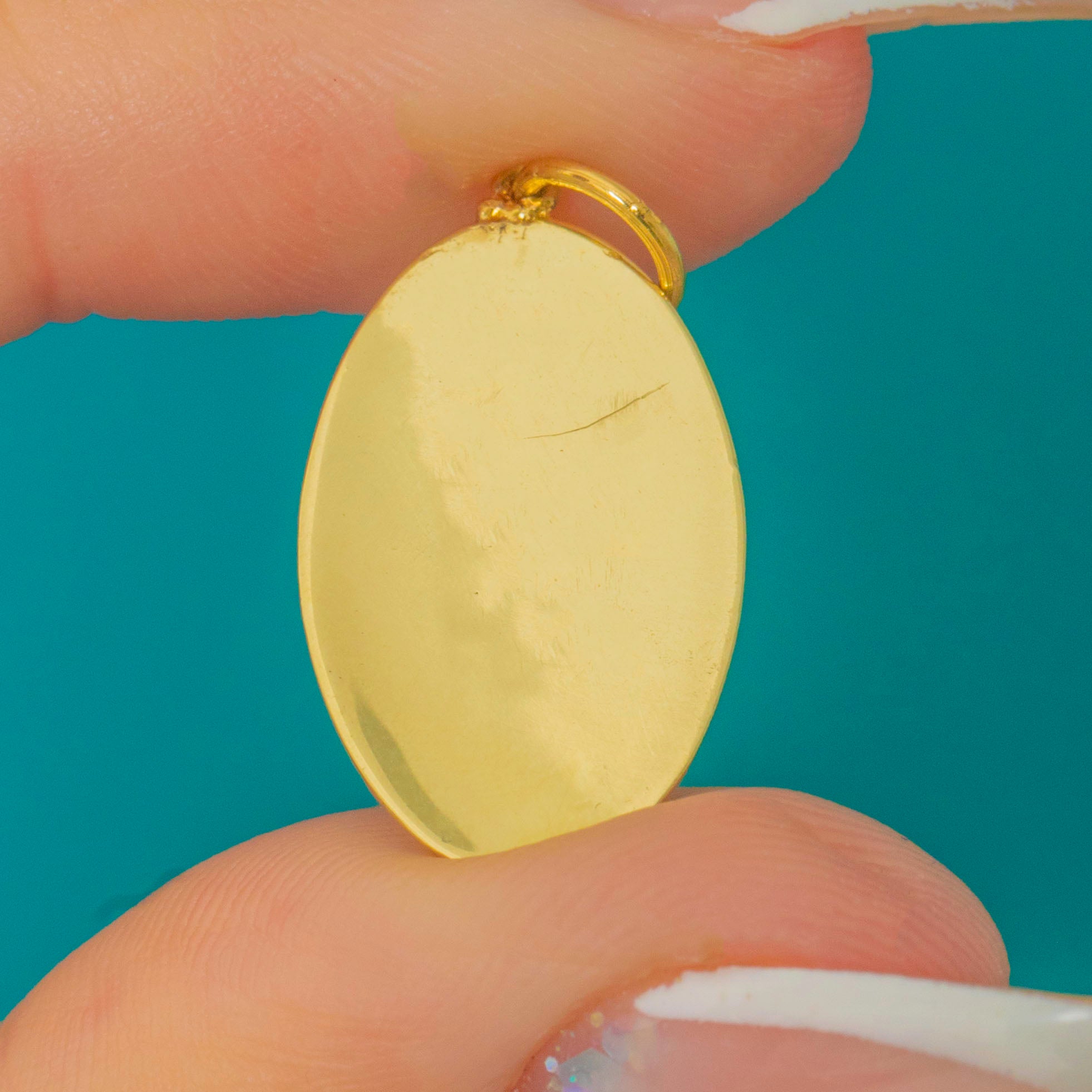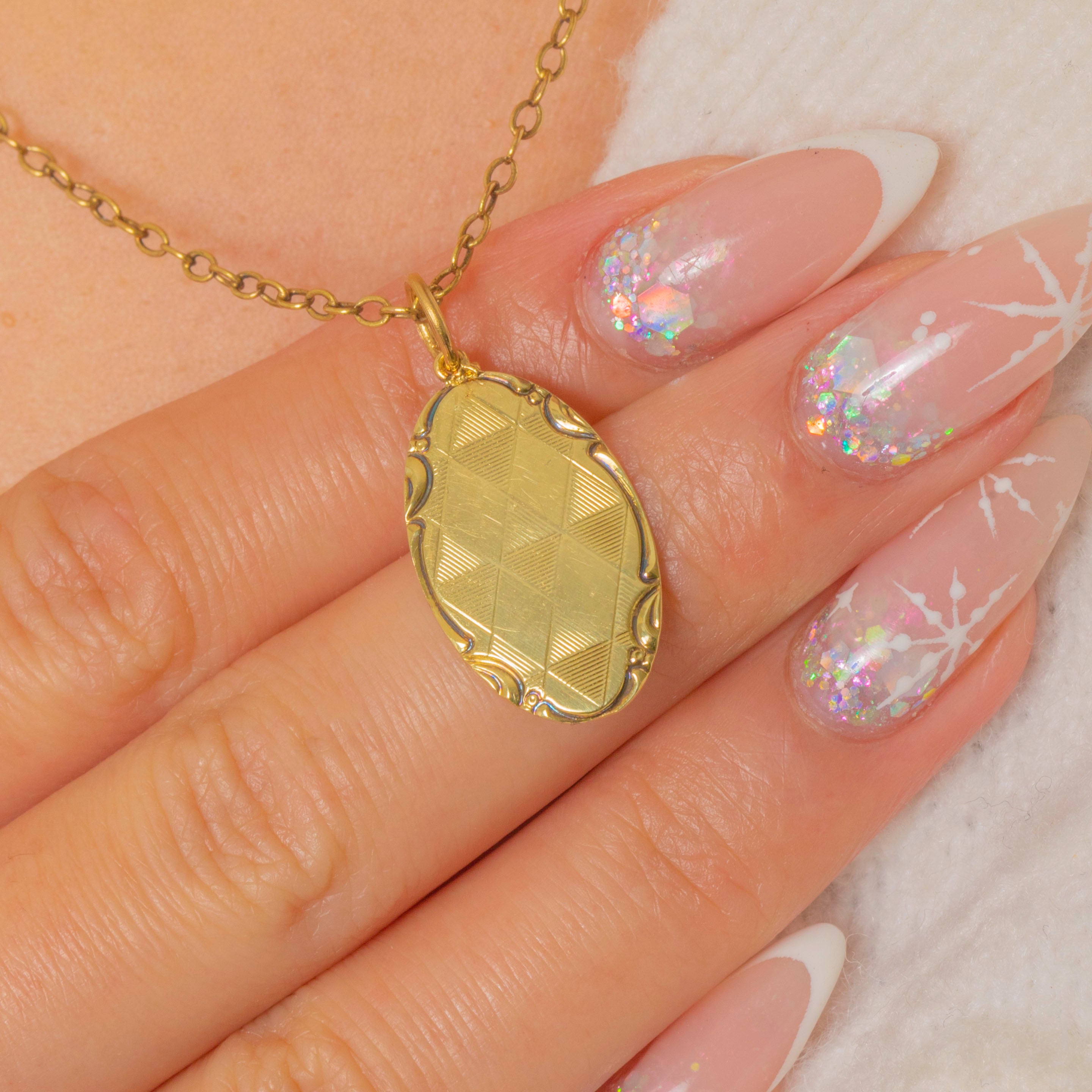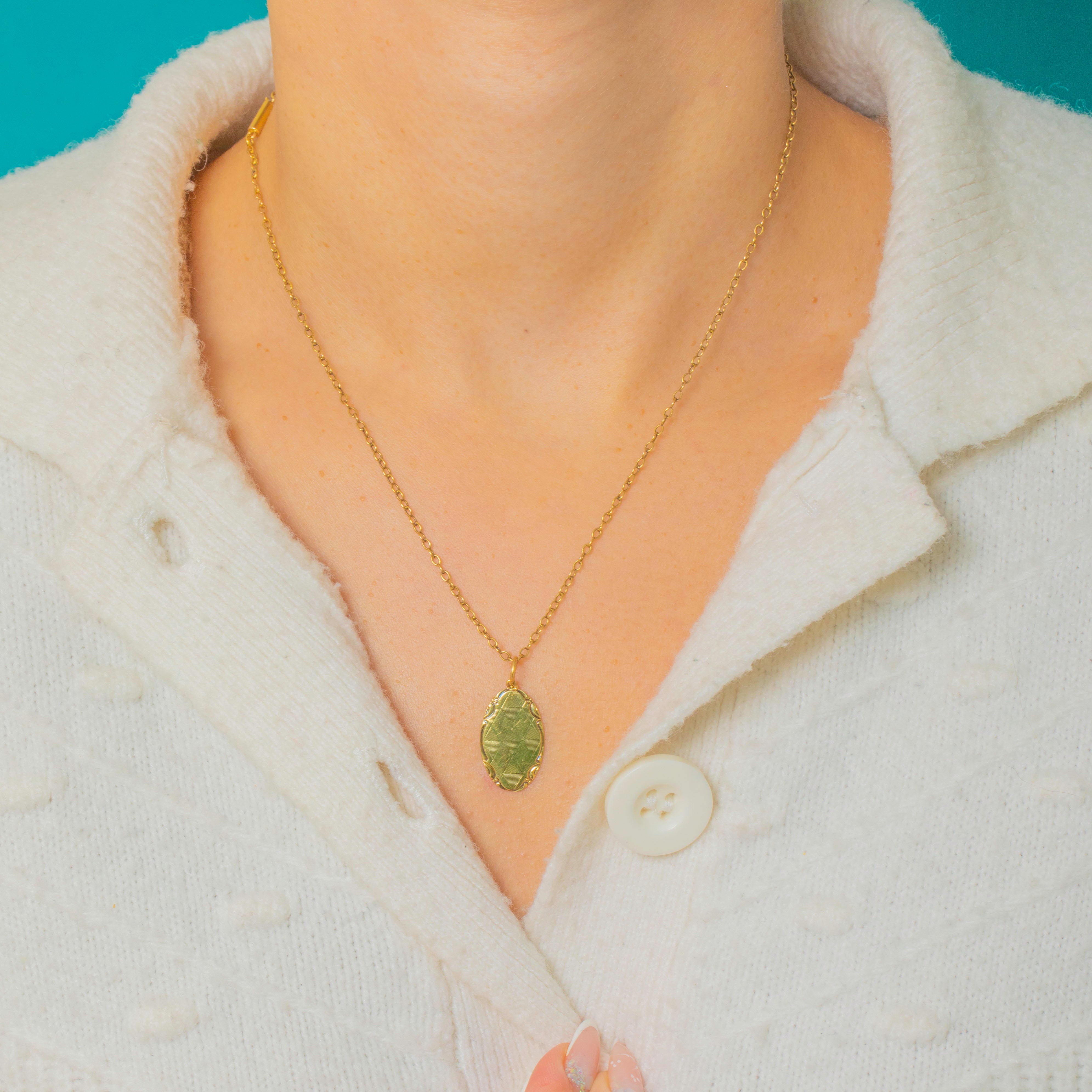 A stylish Late Art Deco pendant crafted in 14ct Gold and adorned with elegant geometric engravings. Its elongated oval silhouette and softly scrolled edges give it a refined, timeless look that layers beautifully with other Gold treasures.