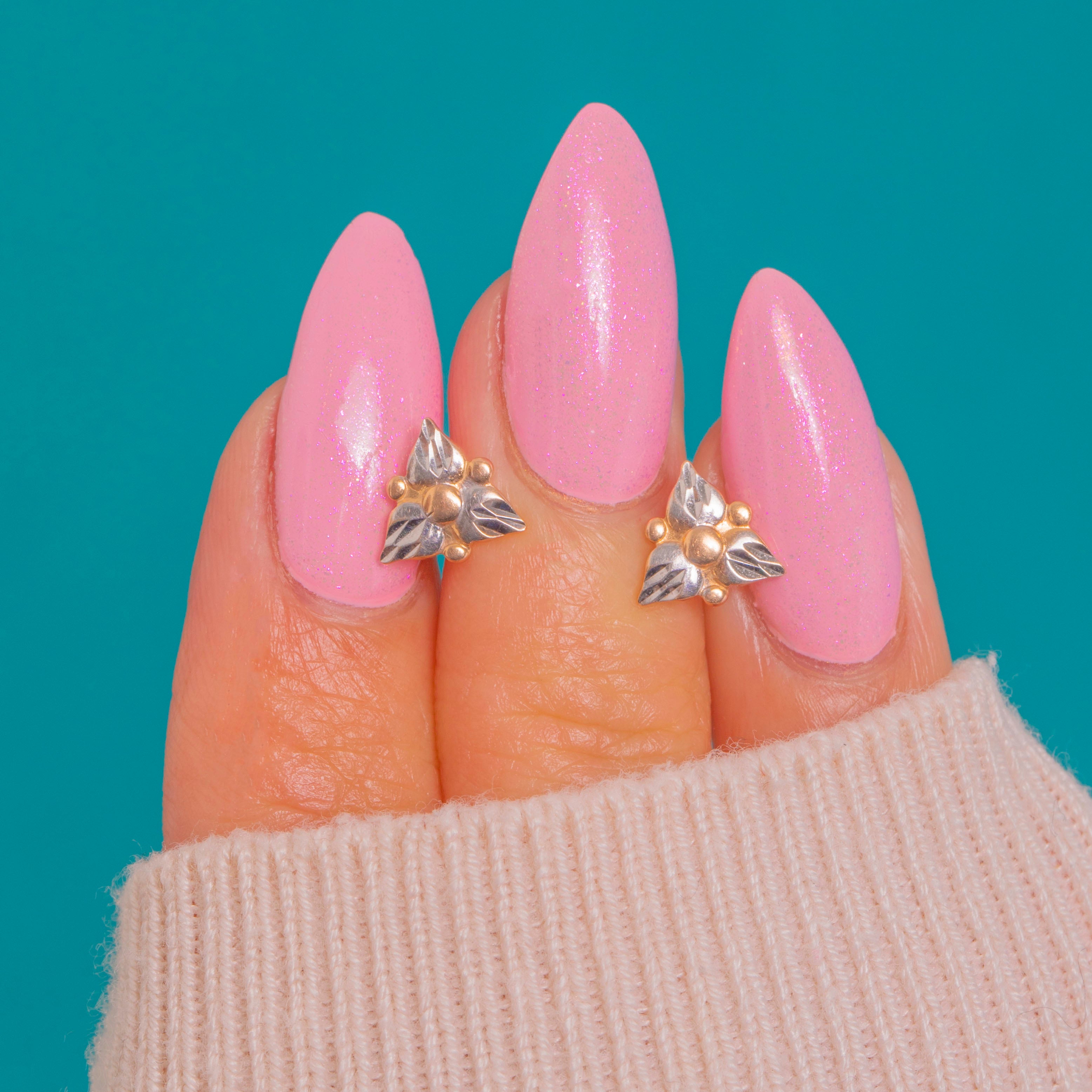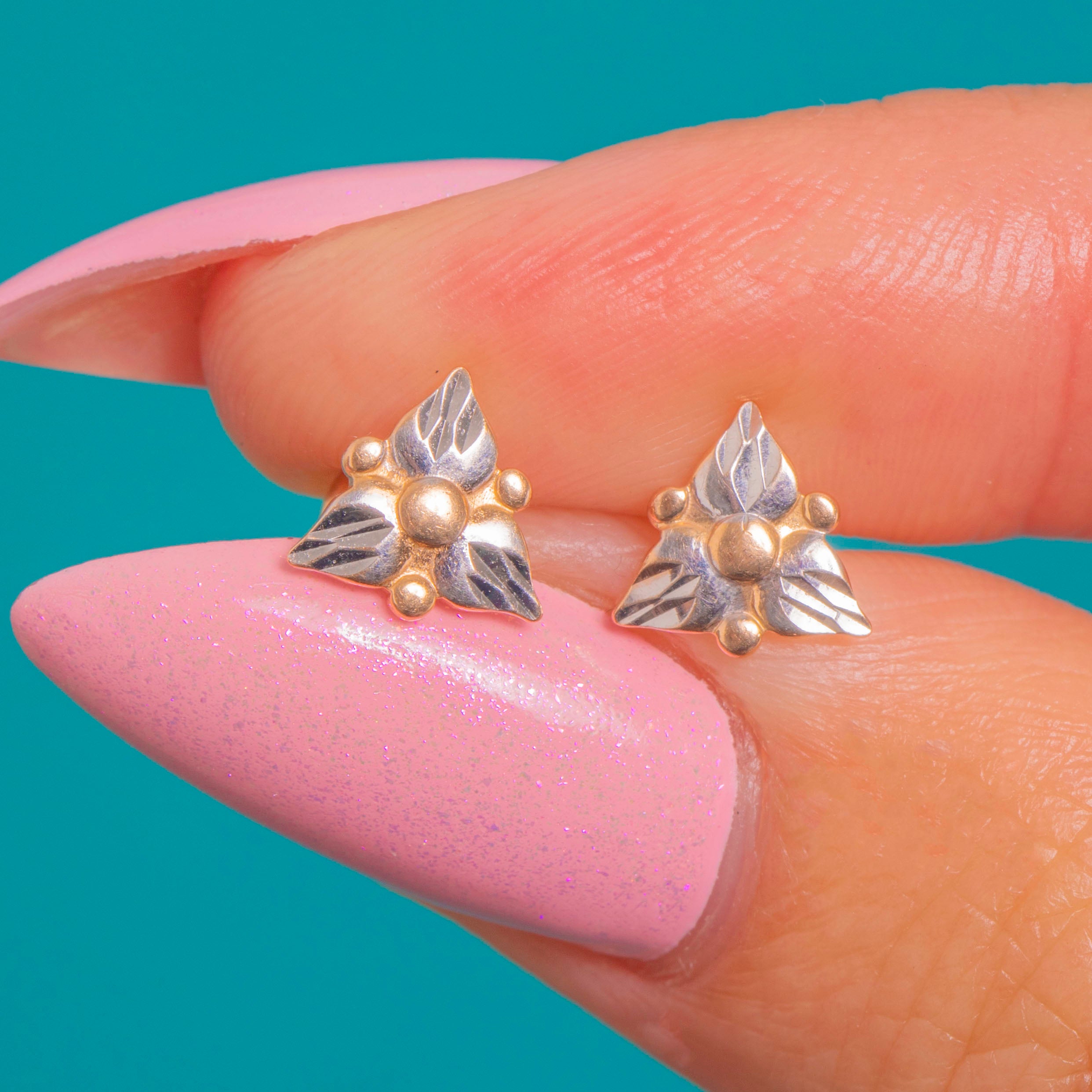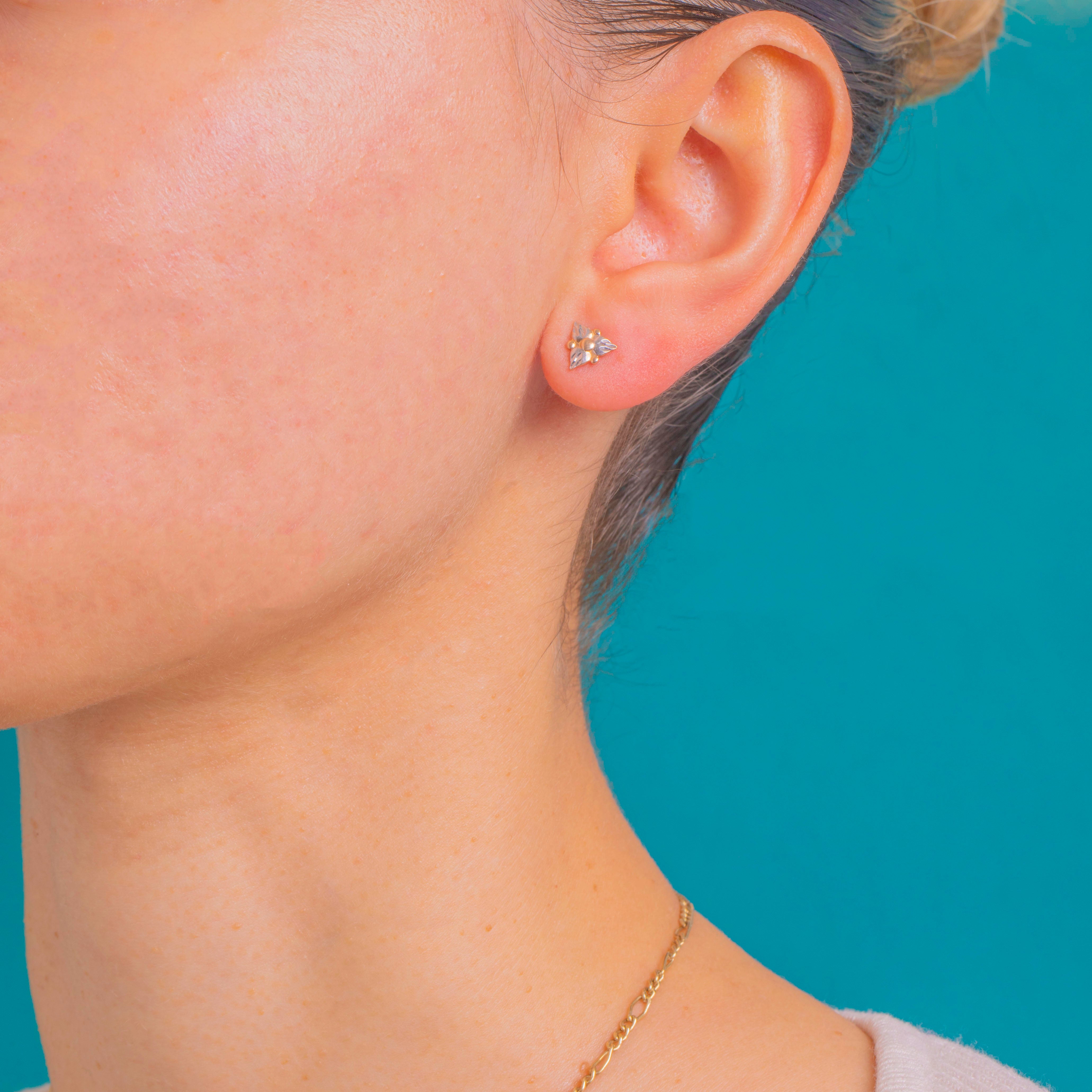 Klein, doch kunstvoll gearbeitet: Diese Vintage-Trefoil-Ohrstecker sind aus zweifarbigem 14ct Rosé- und Weißgold gefertigt. Drei sanft geschwungene, blattähnliche Blütenblätter umrahmen ein erhöhtes, gewölbtes Zentrum, feine Granulat-Akzente verleihen Struktur und dezenten Glanz. Präzise gravierte Blattadern unterstreichen die anmutige, botanische Ausstrahlung dieses raffinierten Miniatur-Designs.