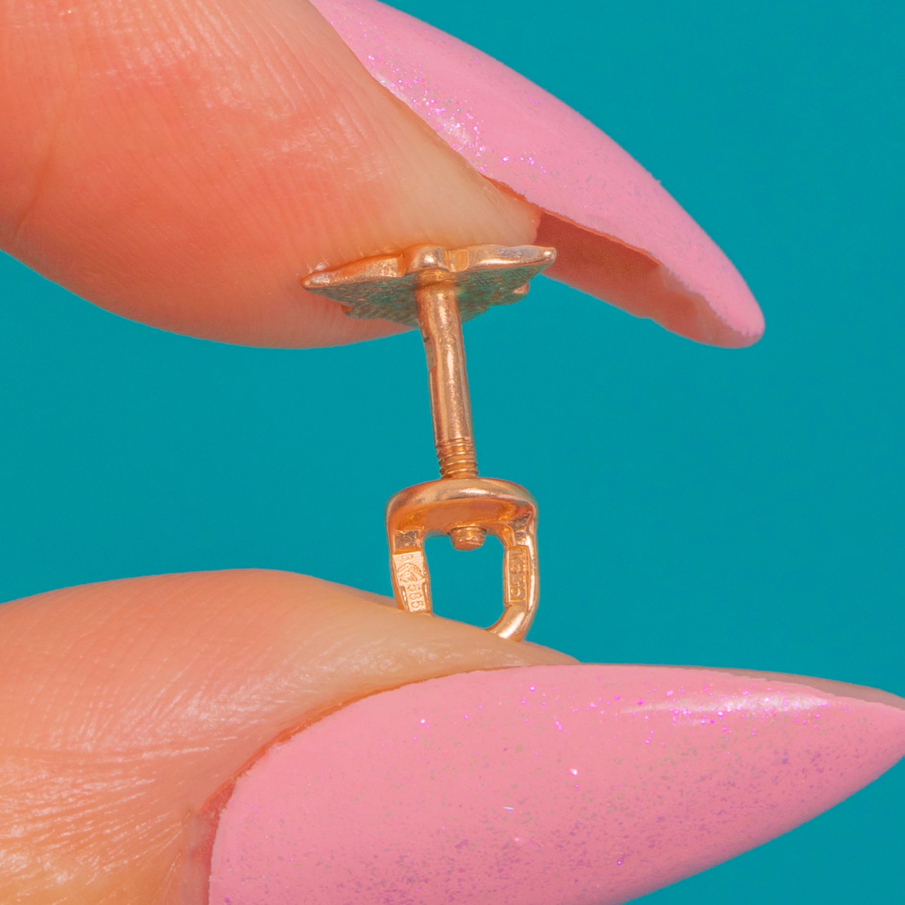 Der Kontrast von Rosé- und Weißgold verleiht dem Schmuckstück subtile Tiefe und zeitlose Eleganz – ideal, um Alltagslooks stilvoll zu veredeln. Die sicheren Schraubverschlüsse sorgen für ein beruhigendes Tragegefühl und unterstreichen die charmante Vintage-Handwerkskunst in kompakter Silhouette.