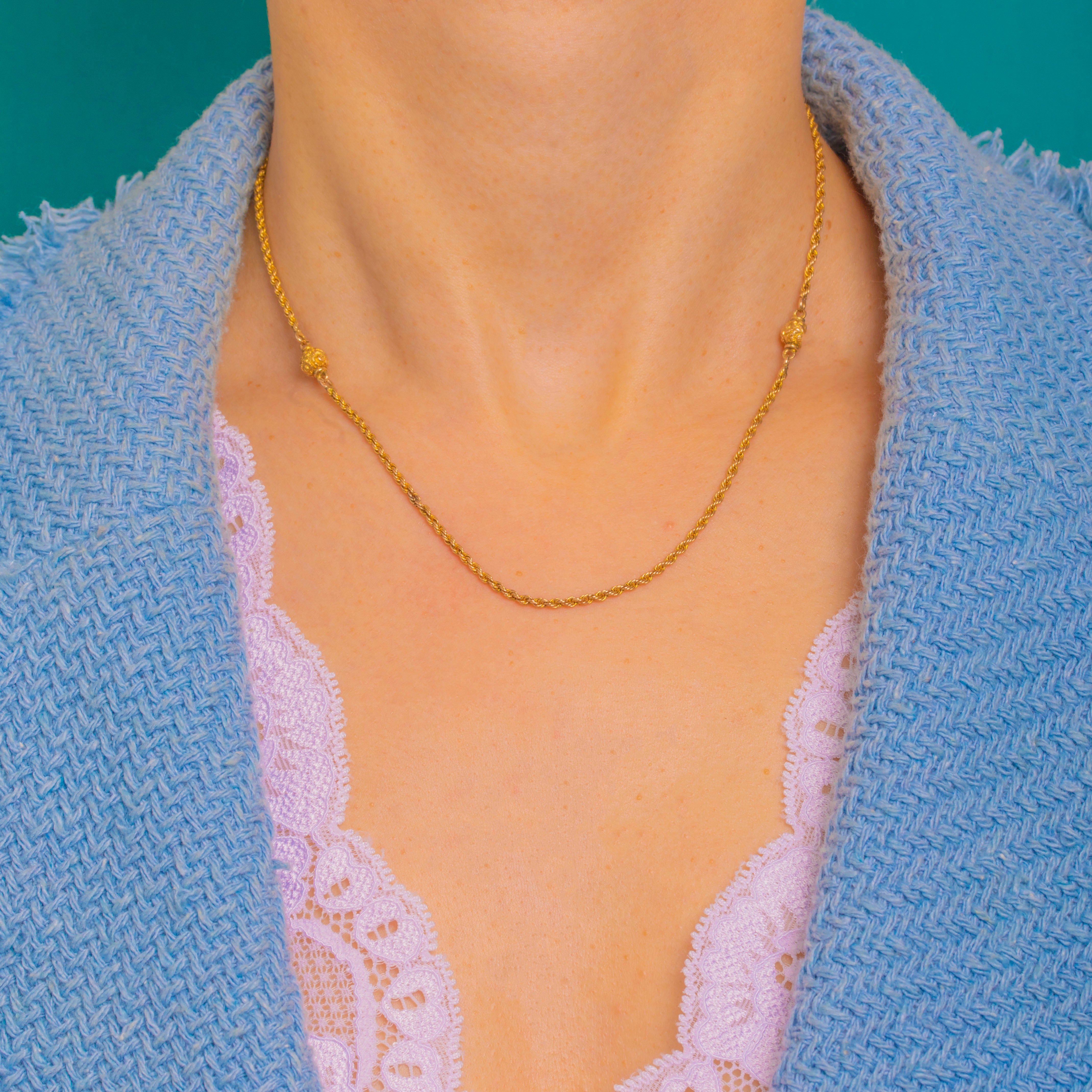 EXCELLENT: Bright Gold with minimal surface wear commensurate with age; the rope links and decorative orbs are crisp with lovely definition and a gentle, even patina in the recesses. The chain is secure with no visible repairs or alterations, and the bolt ring clasp is in fine working order.