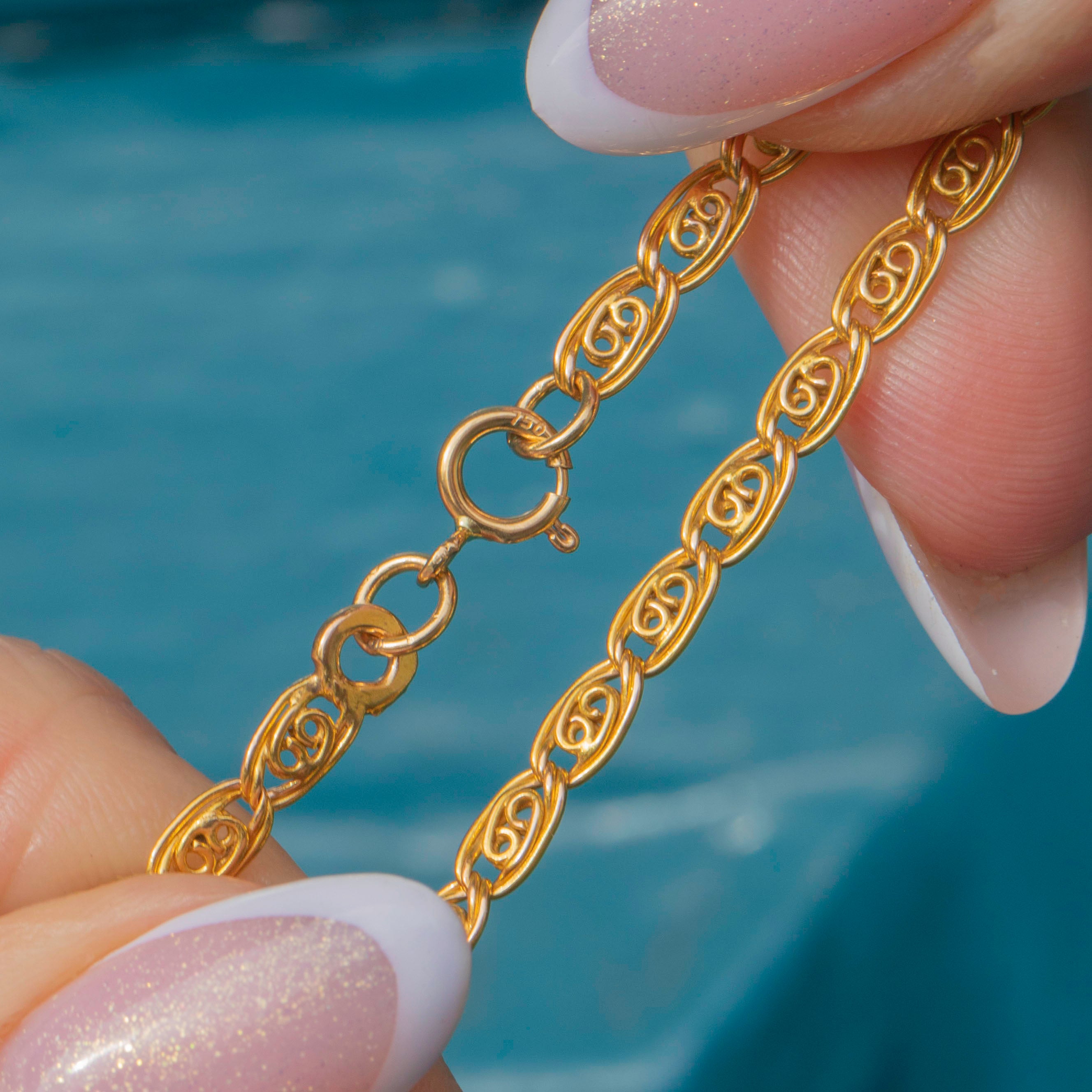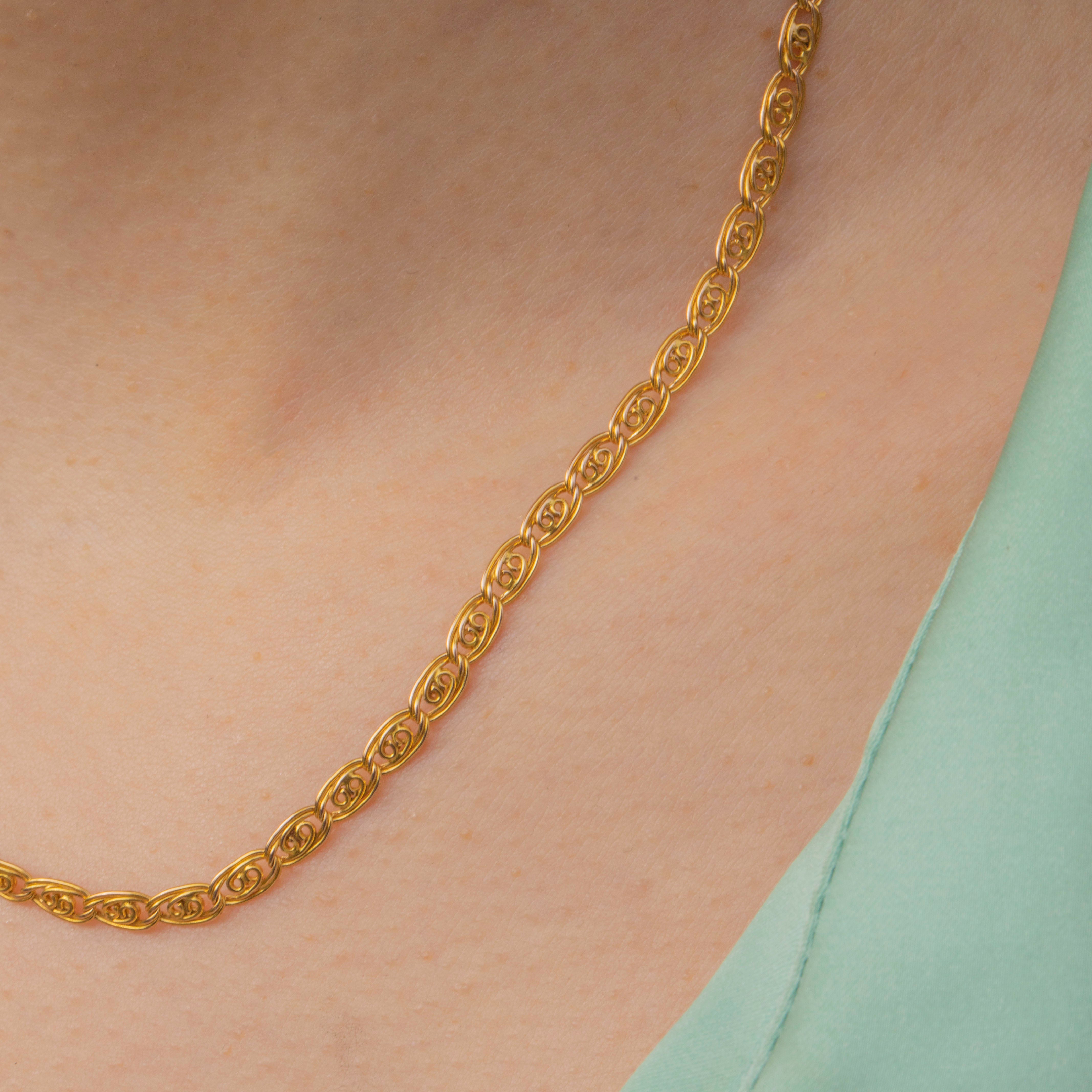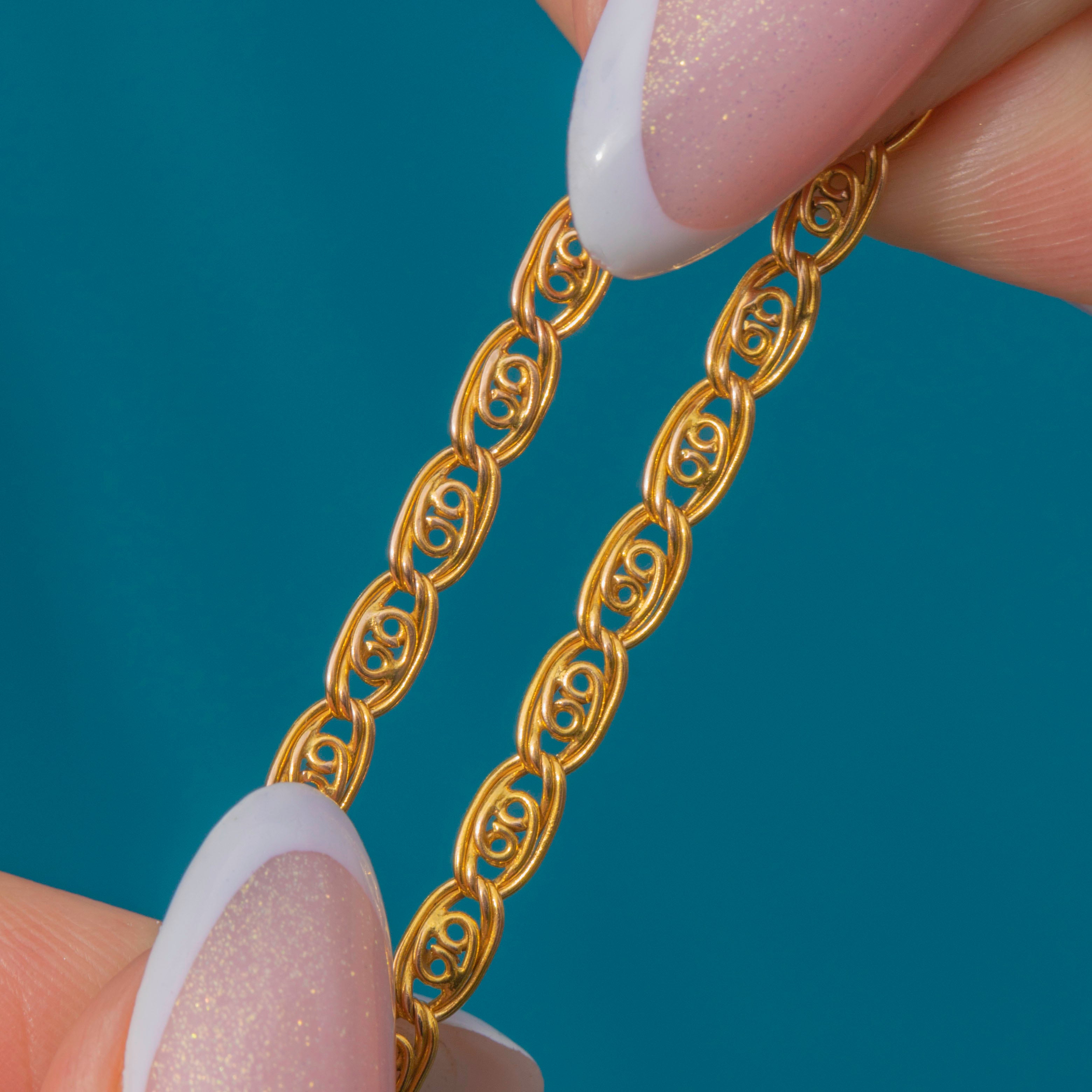 EXCELLENT: This antique 15ct Gold fancy link chain is in excellent condition. Her links are well formed and uniform, with a lovely glossy lustre. With a secure bolt ring, you can wear her with the utmost confidence.