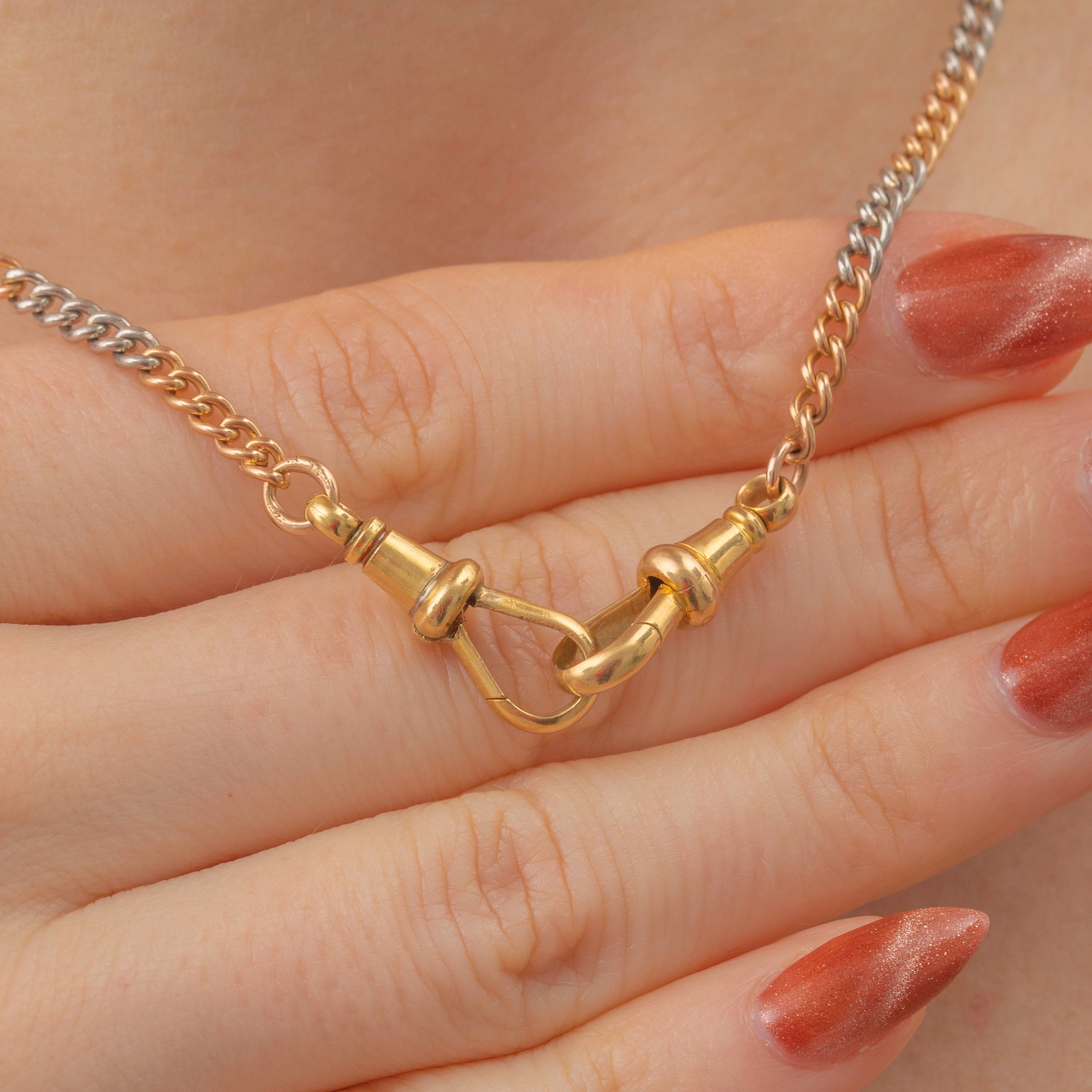 EXCELLENT: This antique 18ct Gold Platinum bi-coloured chain is in excellent condition! The links are perfectly interlinked and the combination of metals creates a striking contrast. Both the dog-clips are in superb working condition. She is just waiting to adorn your neck!