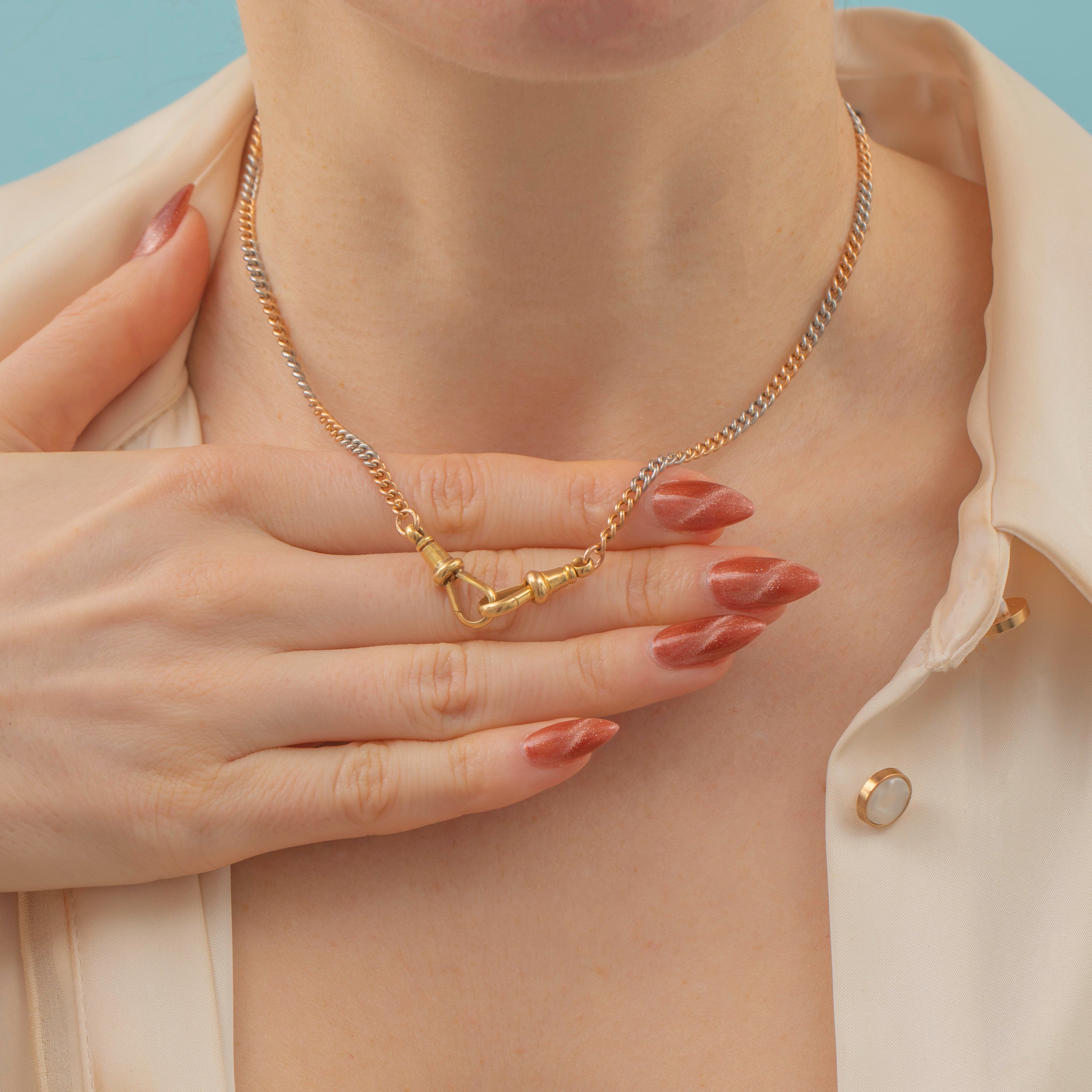 This striking antique 18ct Gold and Platinum bi-coloured chain is sure to turn heads as it graces your neckline. Featuring an elegant mix of Platinum and Gold curb links in varying sizes, its unique contrast of metals sets it apart as a standout piece in any collection.