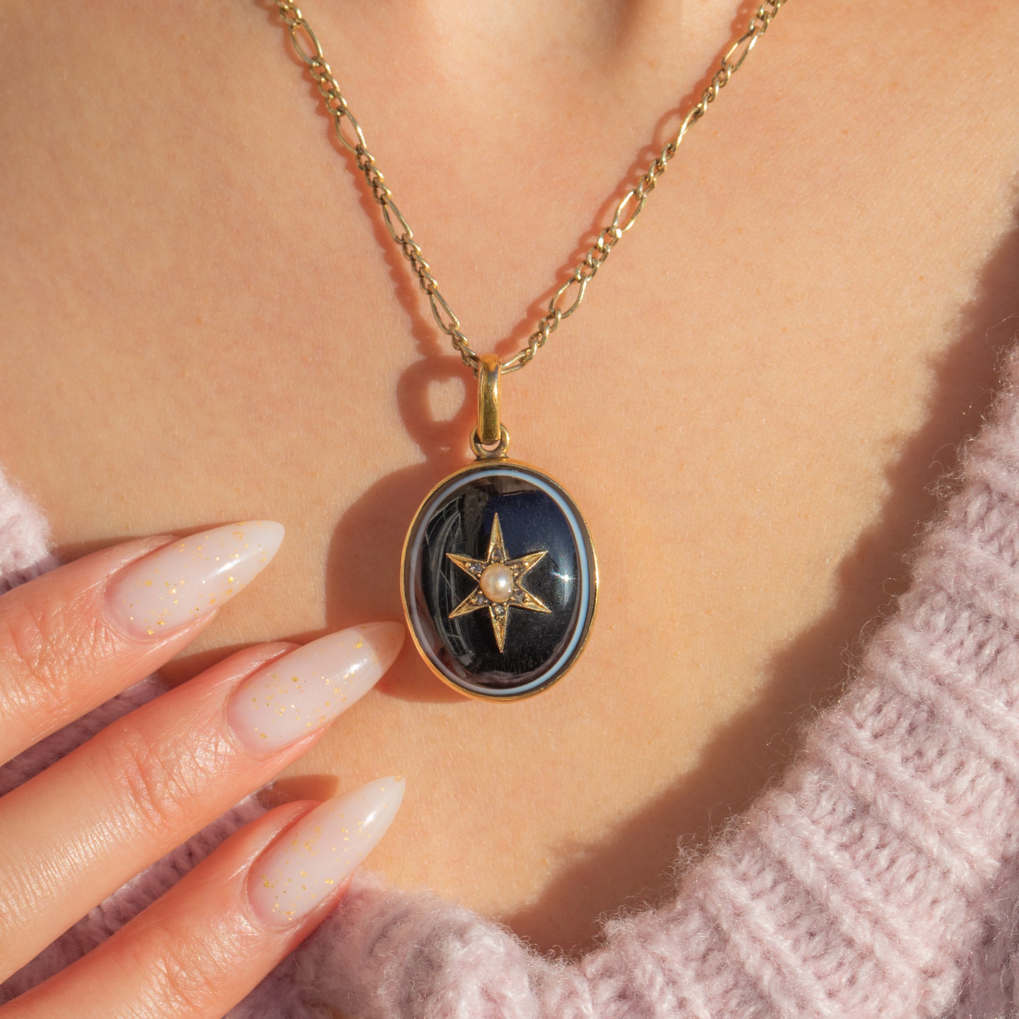 A celestial Victorian treasure in buttery 15ct Gold, this oval pendant pairs an inky black Agate with a domed glazed locket back. At its heart sits a luminous Pearl with twinkling Diamond highlights, the high-contrast palette giving that refined, keepsake allure we adore from the era.