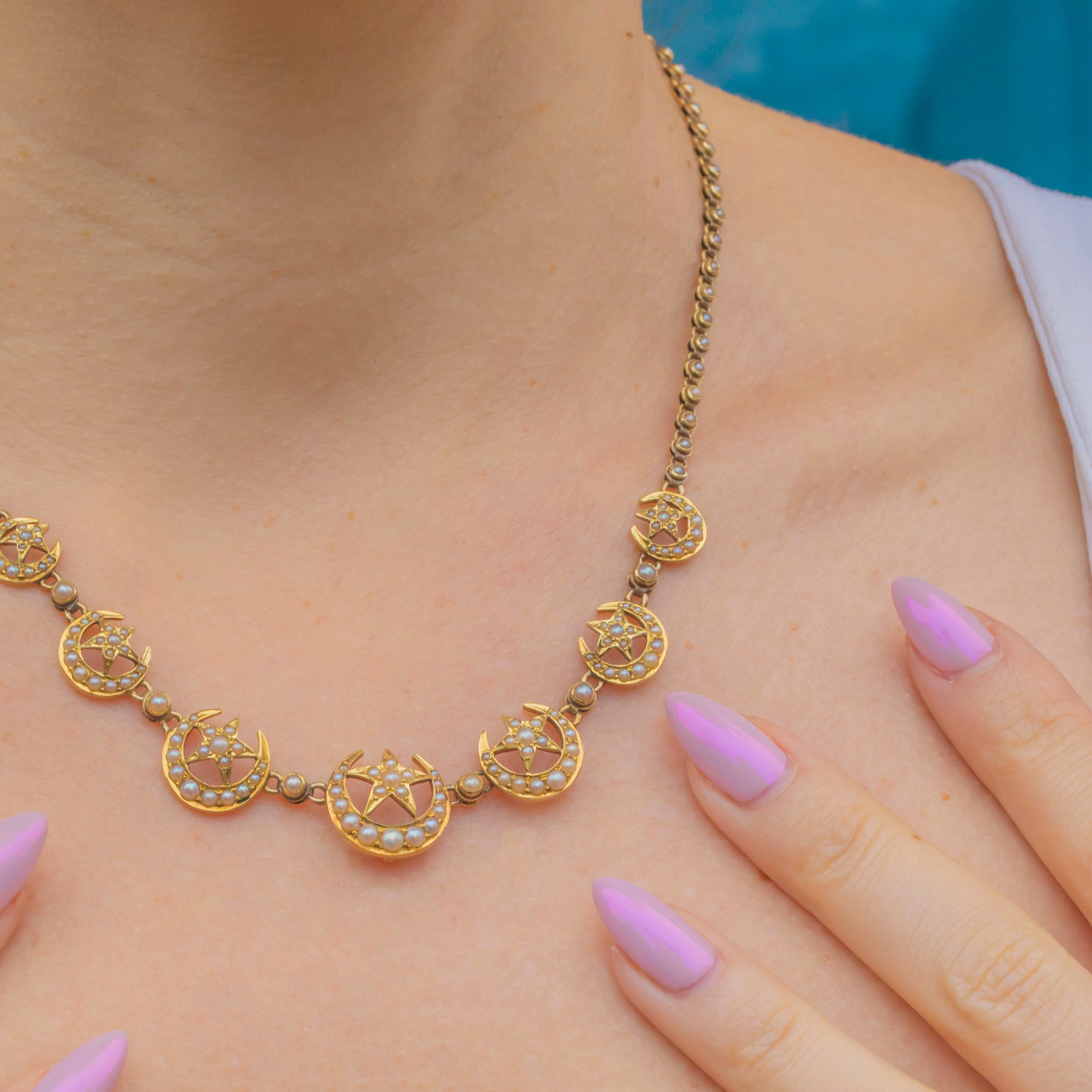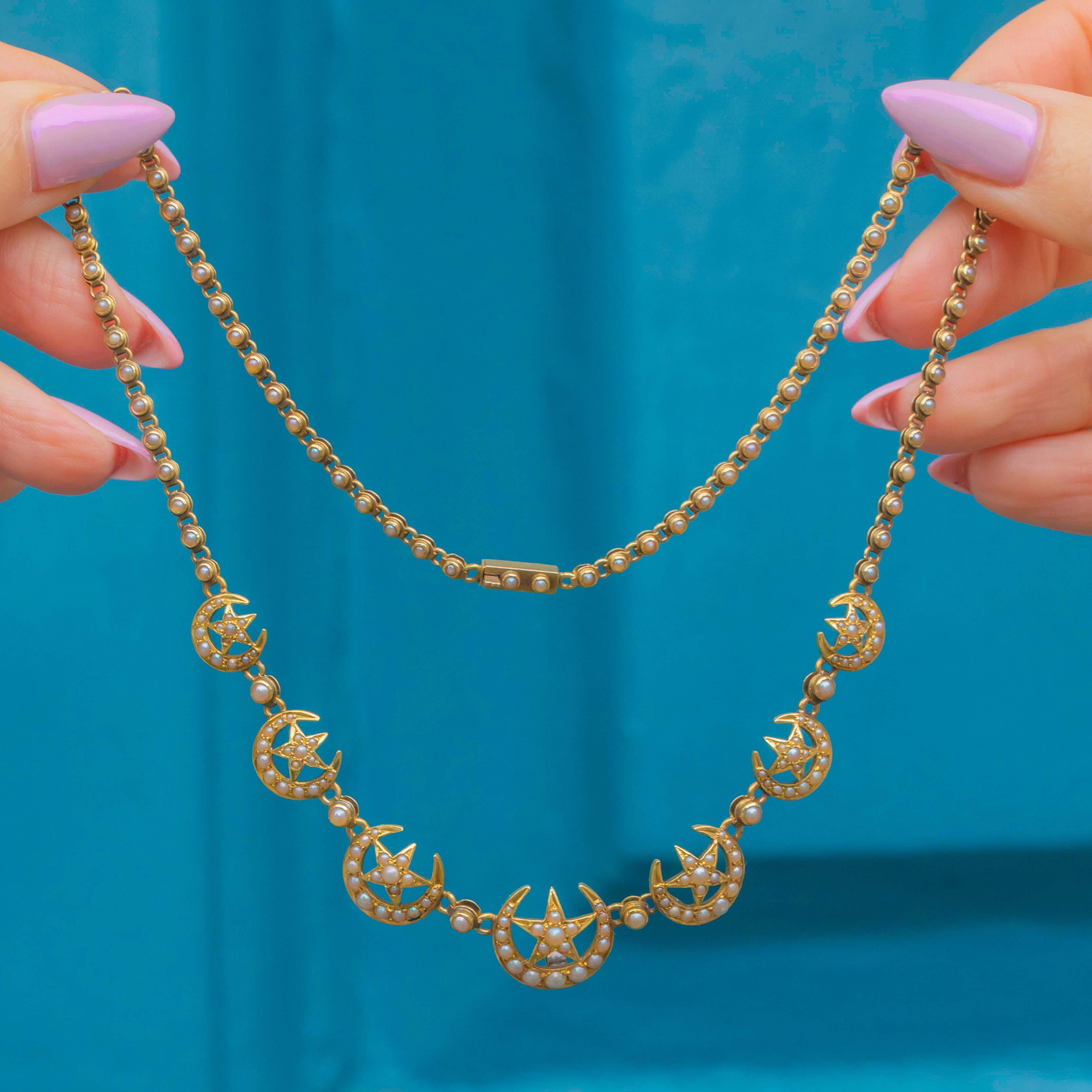 A magnificent Edwardian necklace showcasing one of the era’s most beloved celestial motifs, a glowing Pearl-set crescent moon flanked by tiny twinkling stars. Each Pearl is luminous and well-matched, giving the design an ethereal, romantic quality.