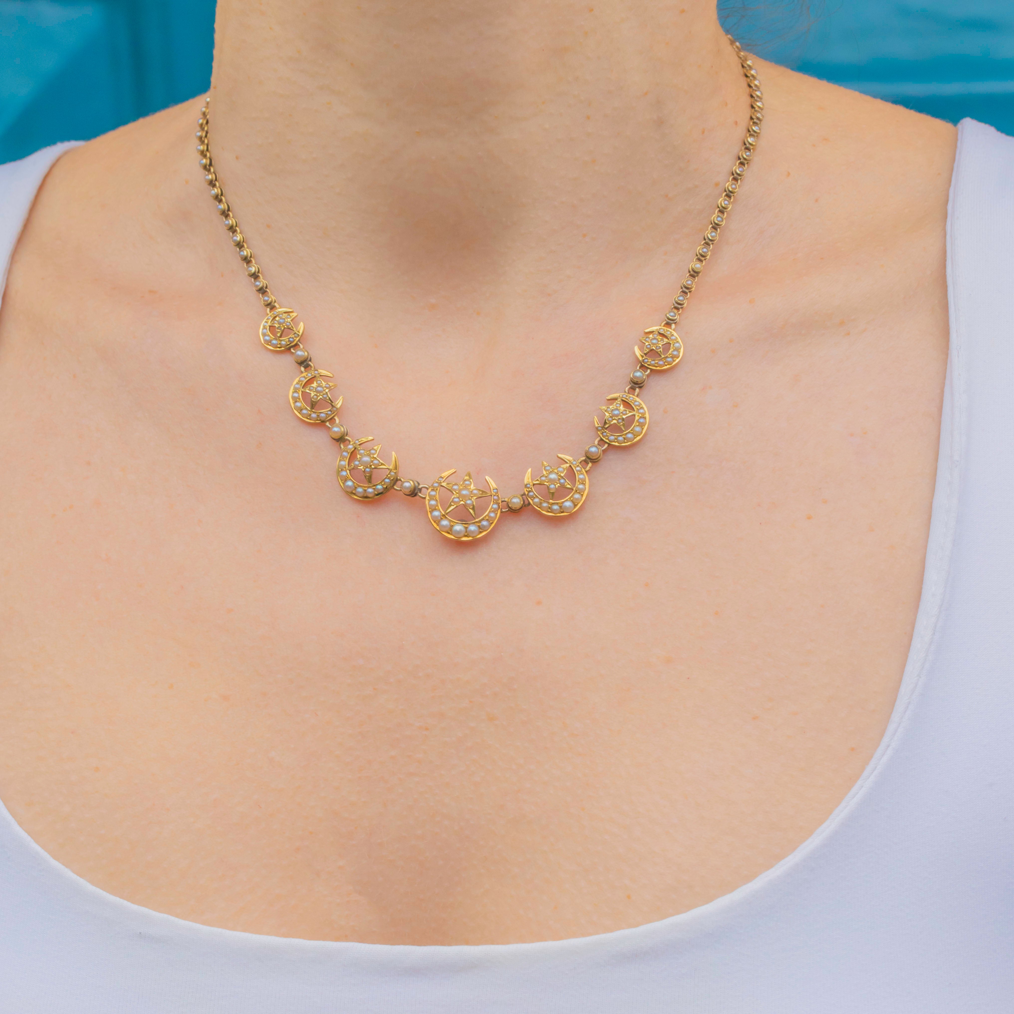 15ct Gold Edwardian Pearl Crescent Moon & Stars Necklace