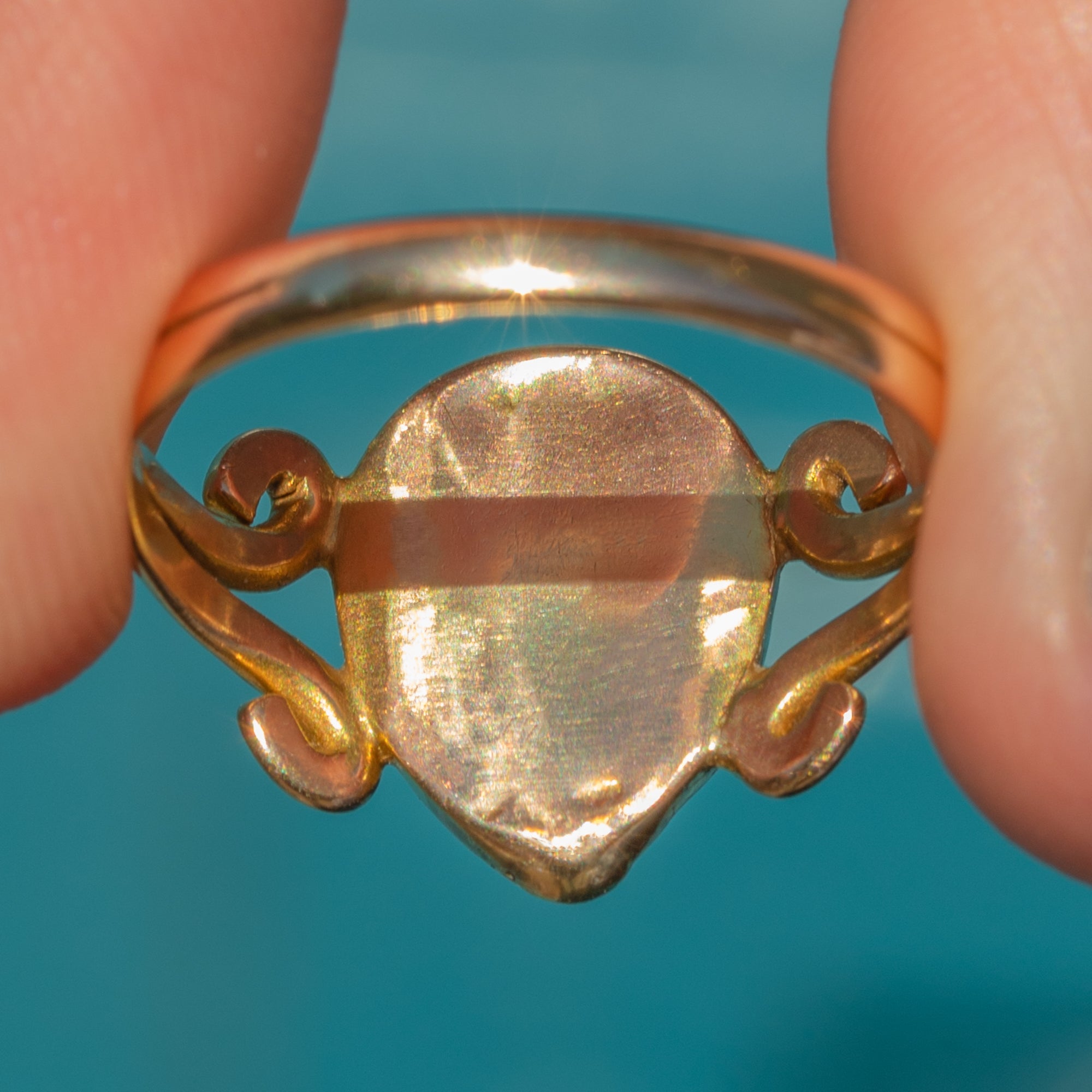 VERY GOOD: The Gold is buttery and glossy, and besides a a resize mark, is in wonderful condition for its age. The Garnet is gorgeous and smoothly domed, under close inspctecion there are a couple of nibbles around the edge, but these are difficult to spot. The band is robust, allowing you to wear this antique Garnet ring with confidence!