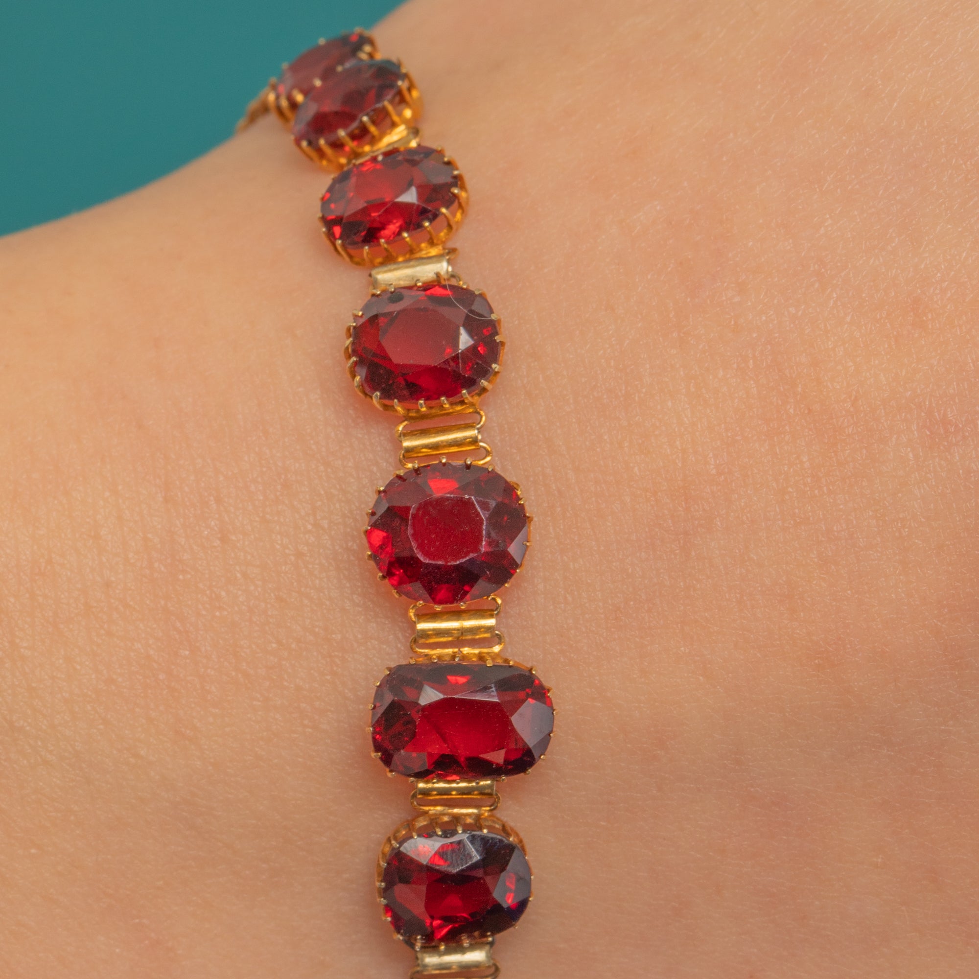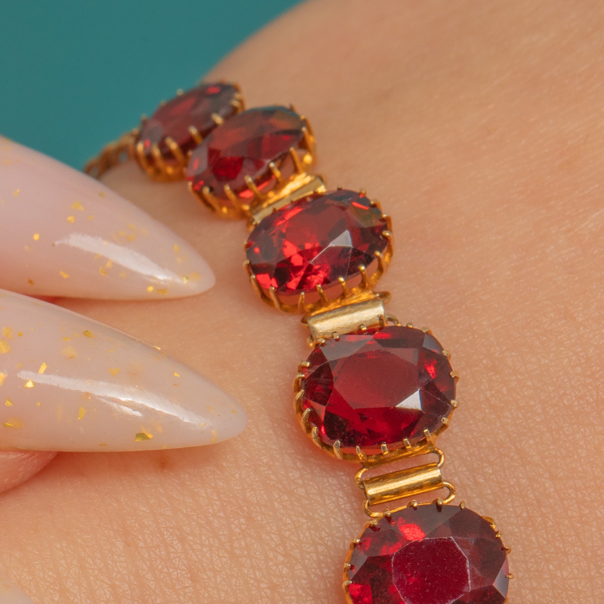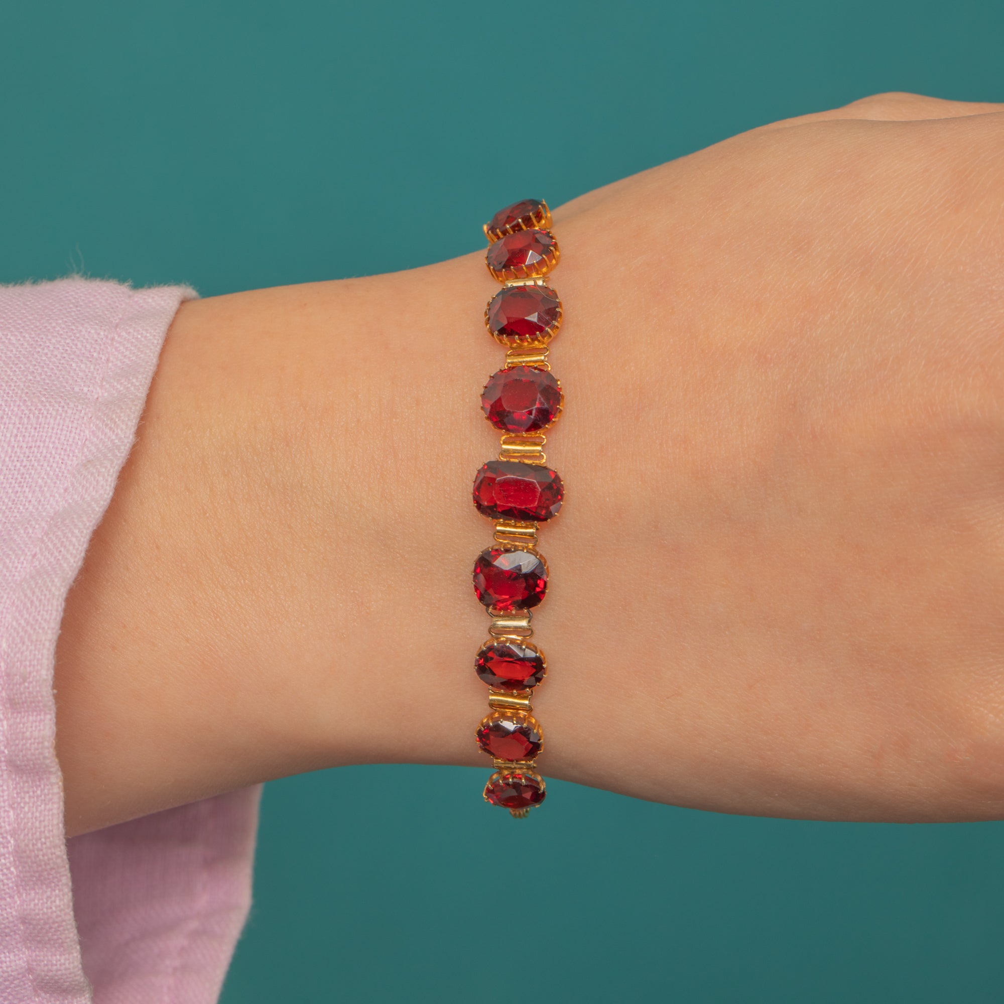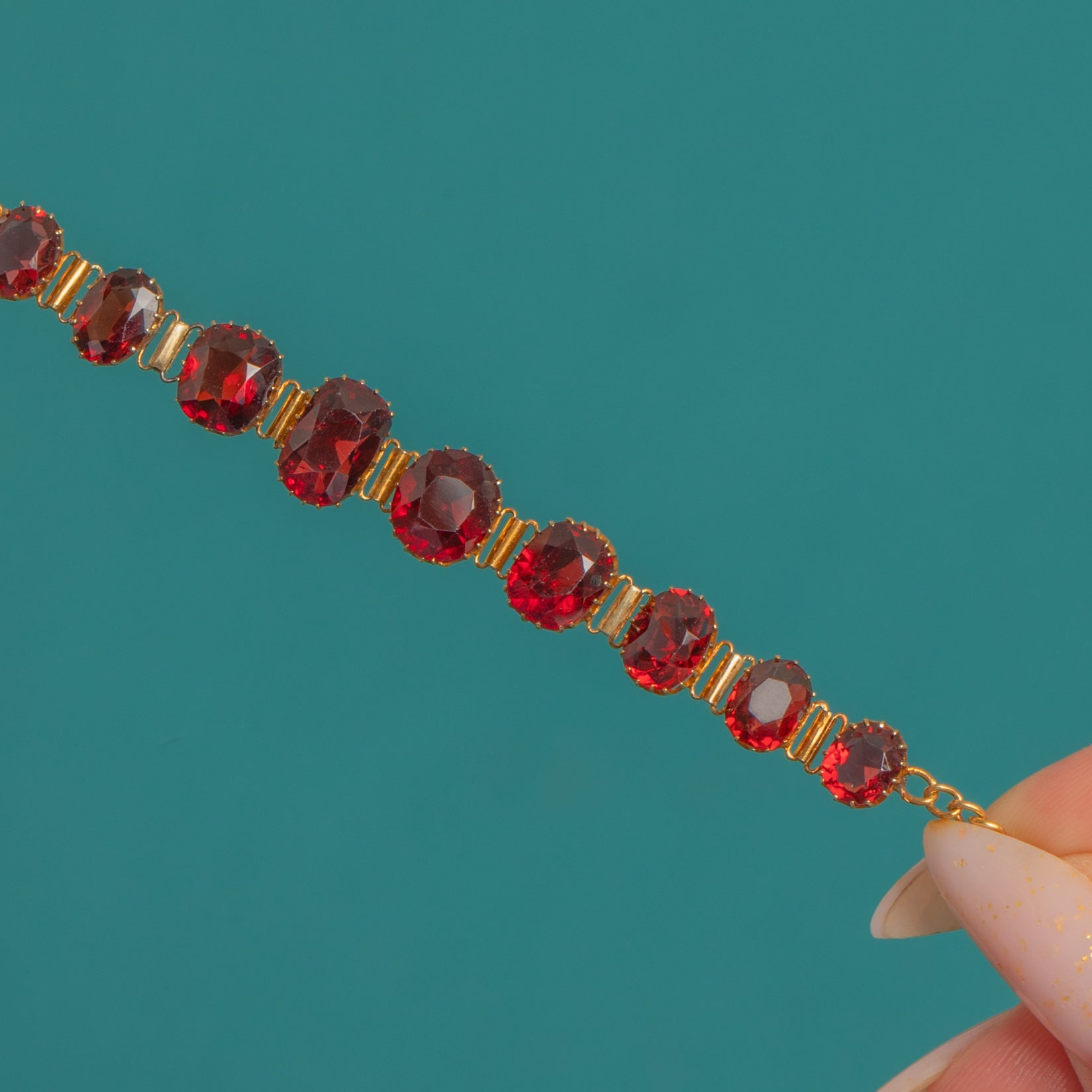 A refined Edwardian rivière, this articulated line bracelet showcases a glowing suite of deep red Hessonite Garnets in 15ct Gold. The gently graduated ovals are linked by neat ribbed bars, creating a delicate, low-profile silhouette that moves fluidly on the wrist.