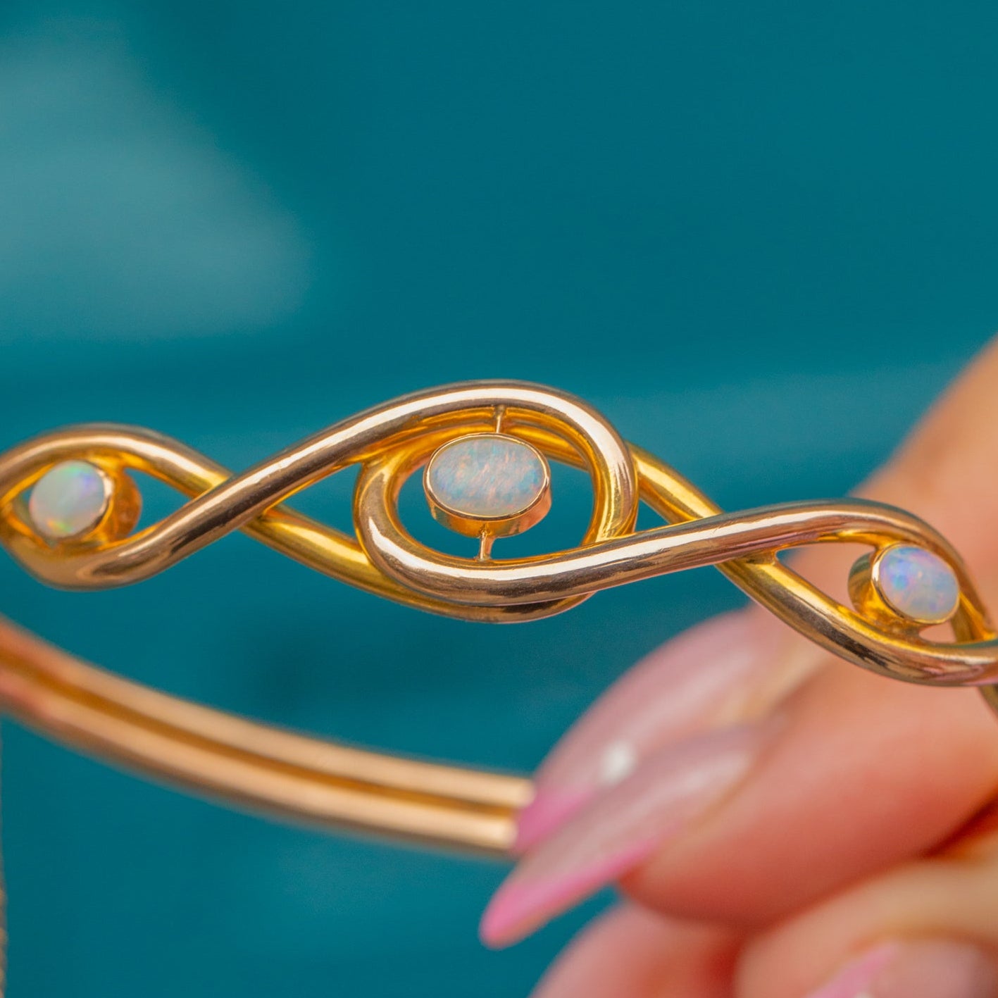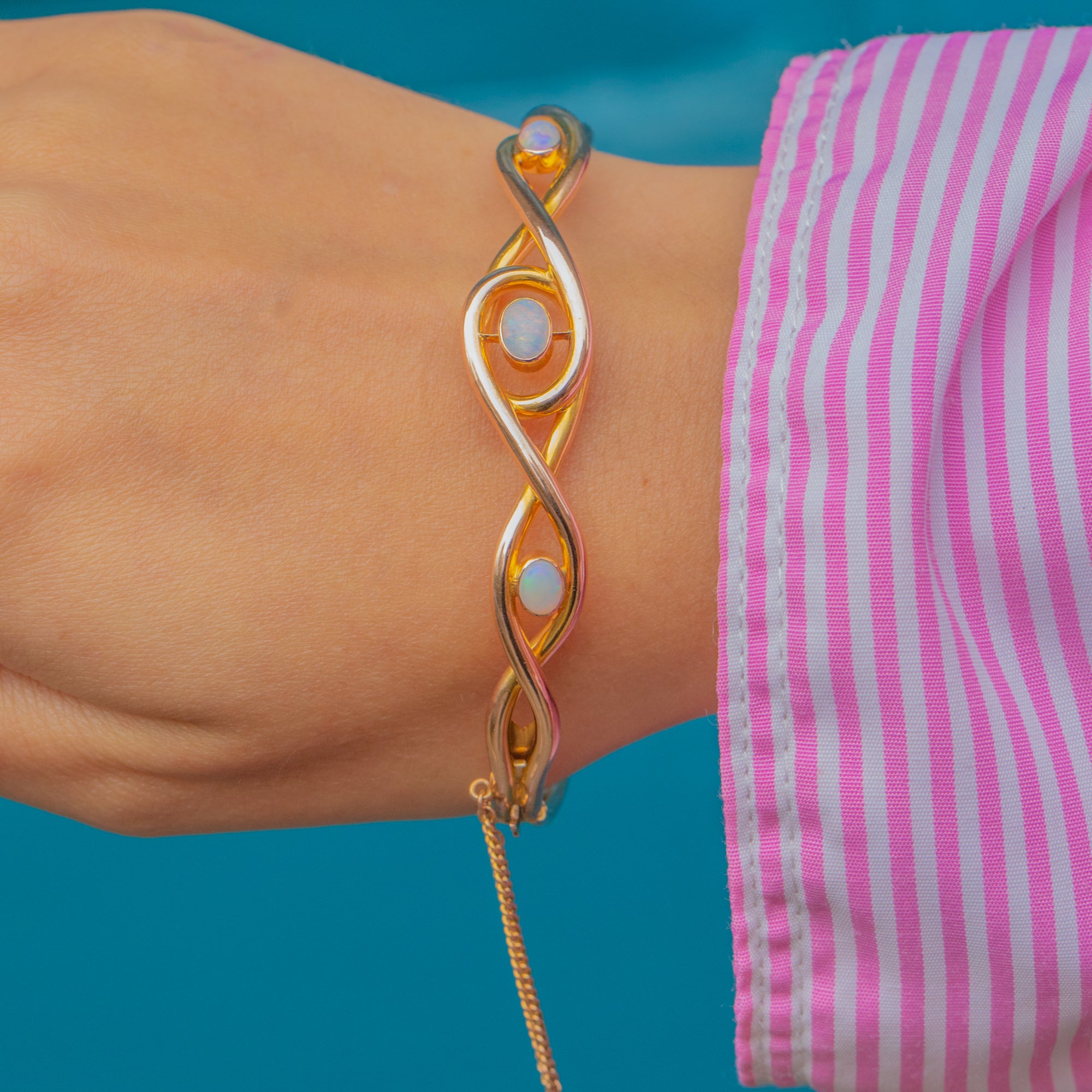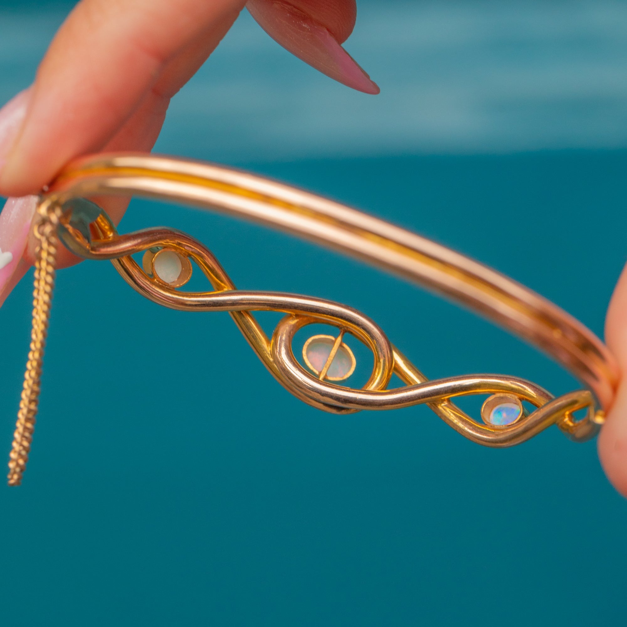 This exquisite Mid-Century bangle captures timeless elegance with its sculptural knot motif and luminous Opal cabochons. Each Opal shimmers with a kaleidoscope of blues, greens and fiery flashes, beautifully highlighted by the warm 15ct Gold setting. The addition of a 9ct Gold safety chain ensures both comfort and security while wearing.