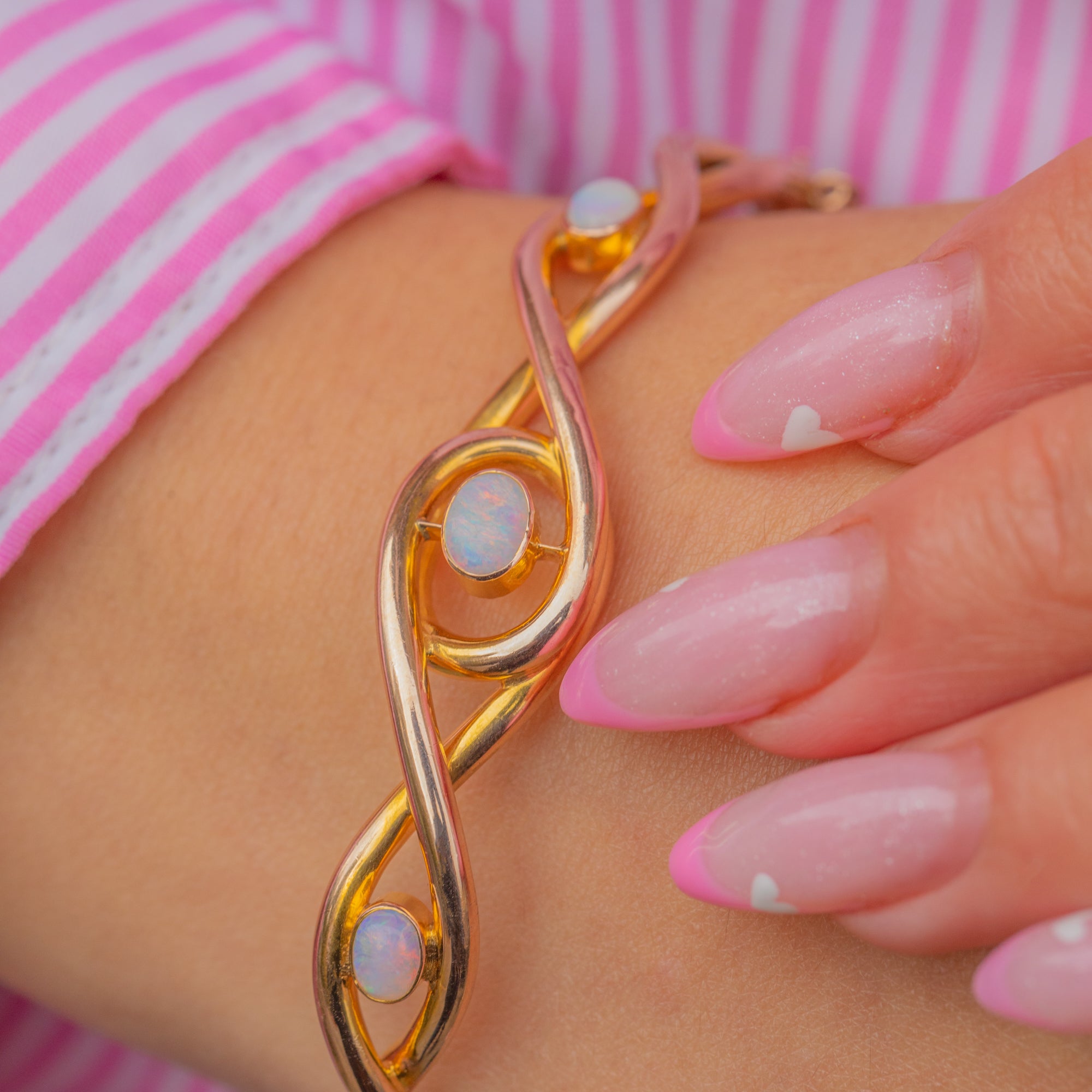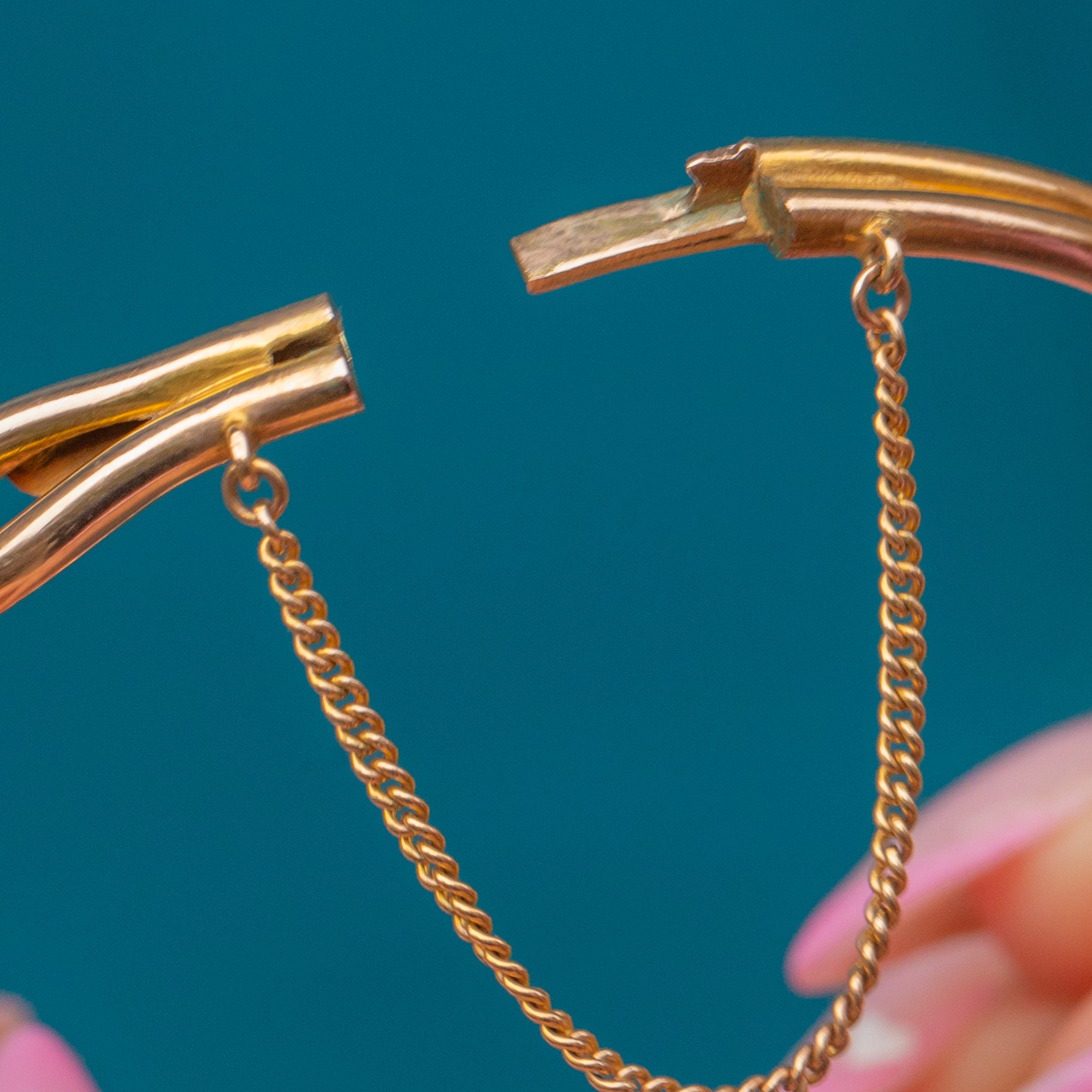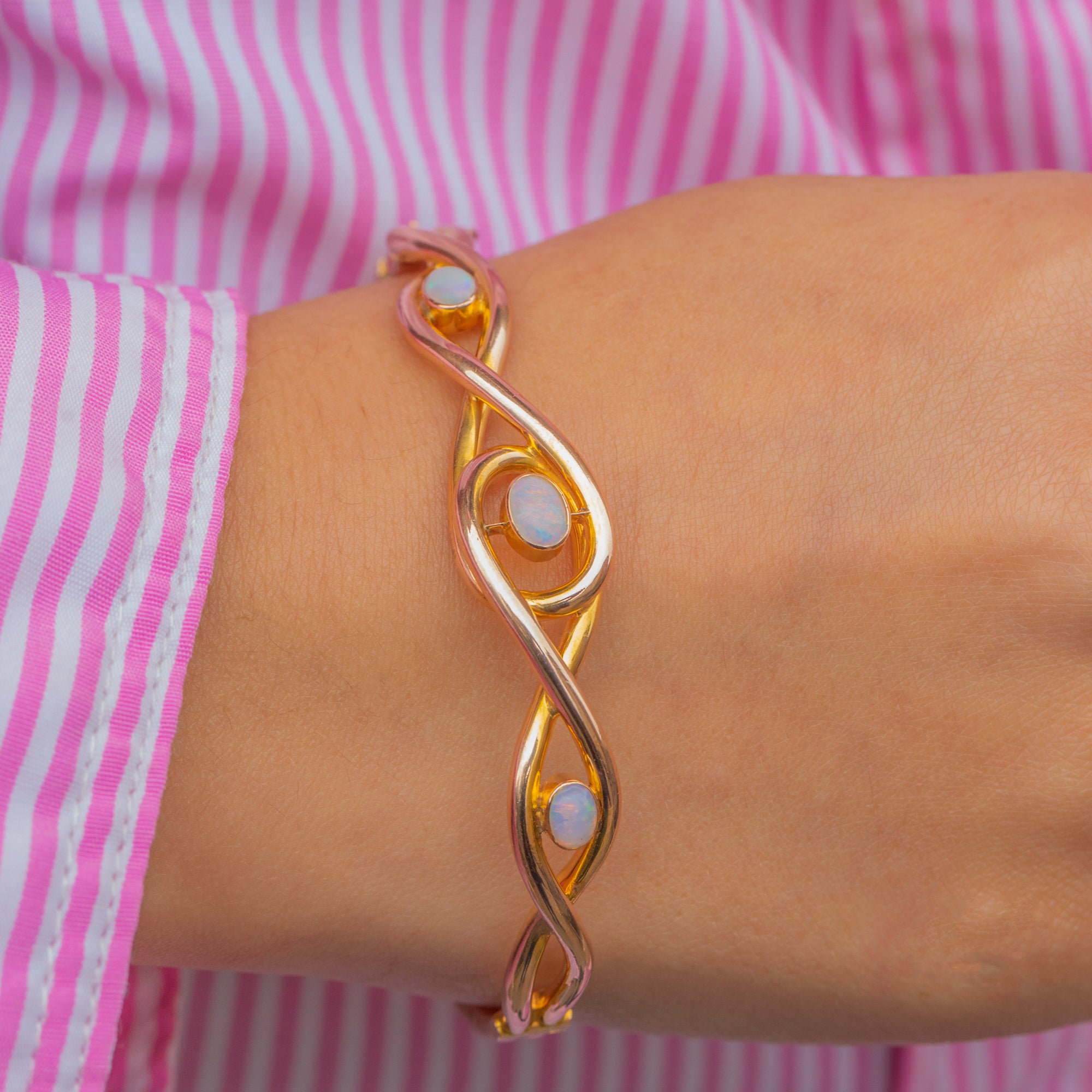 This exquisite Mid-Century bangle captures timeless elegance with its sculptural knot motif and luminous Opal cabochons. Each Opal shimmers with a kaleidoscope of blues, greens and fiery flashes, beautifully highlighted by the warm 15ct Gold setting. The addition of a 9ct Gold safety chain ensures both comfort and security while wearing.