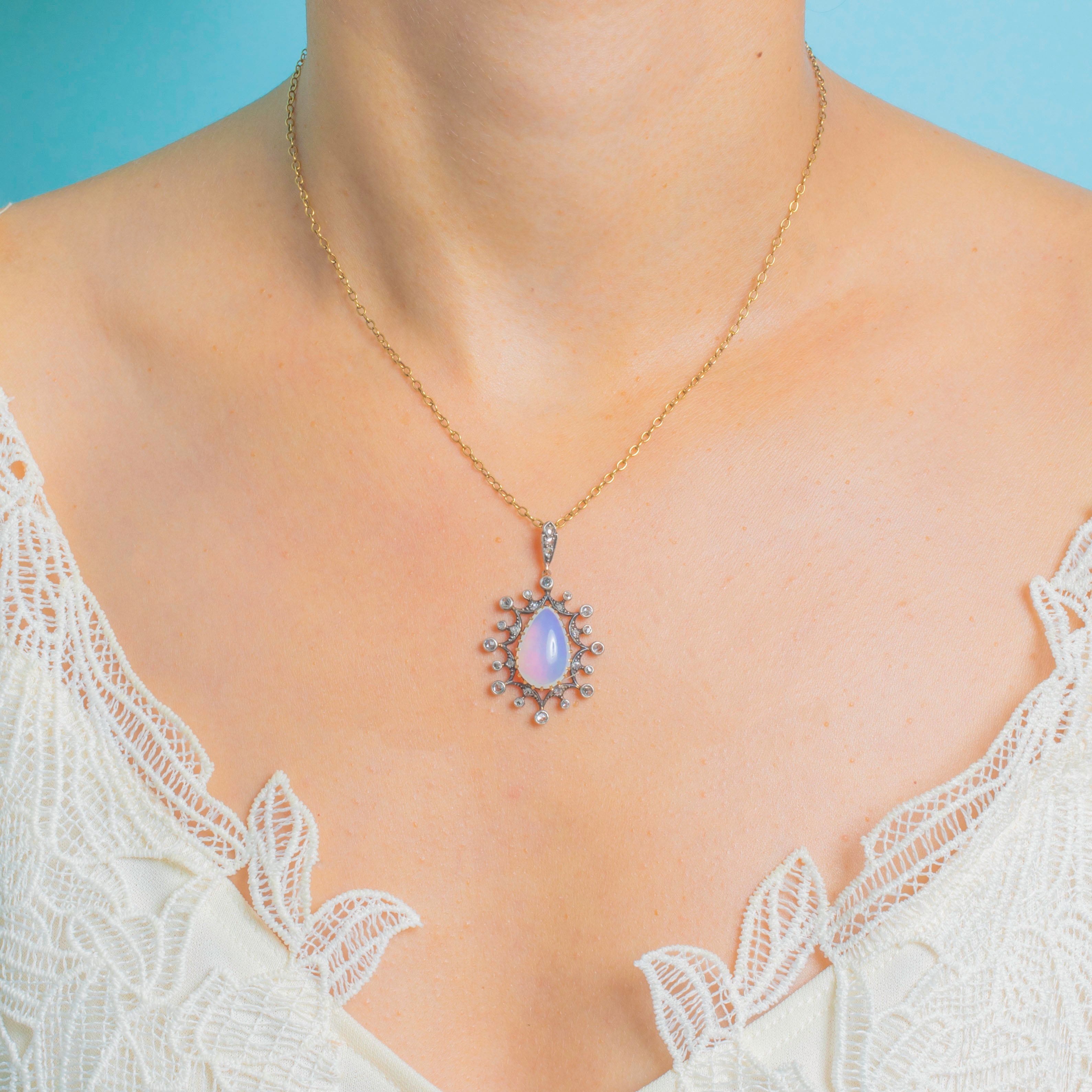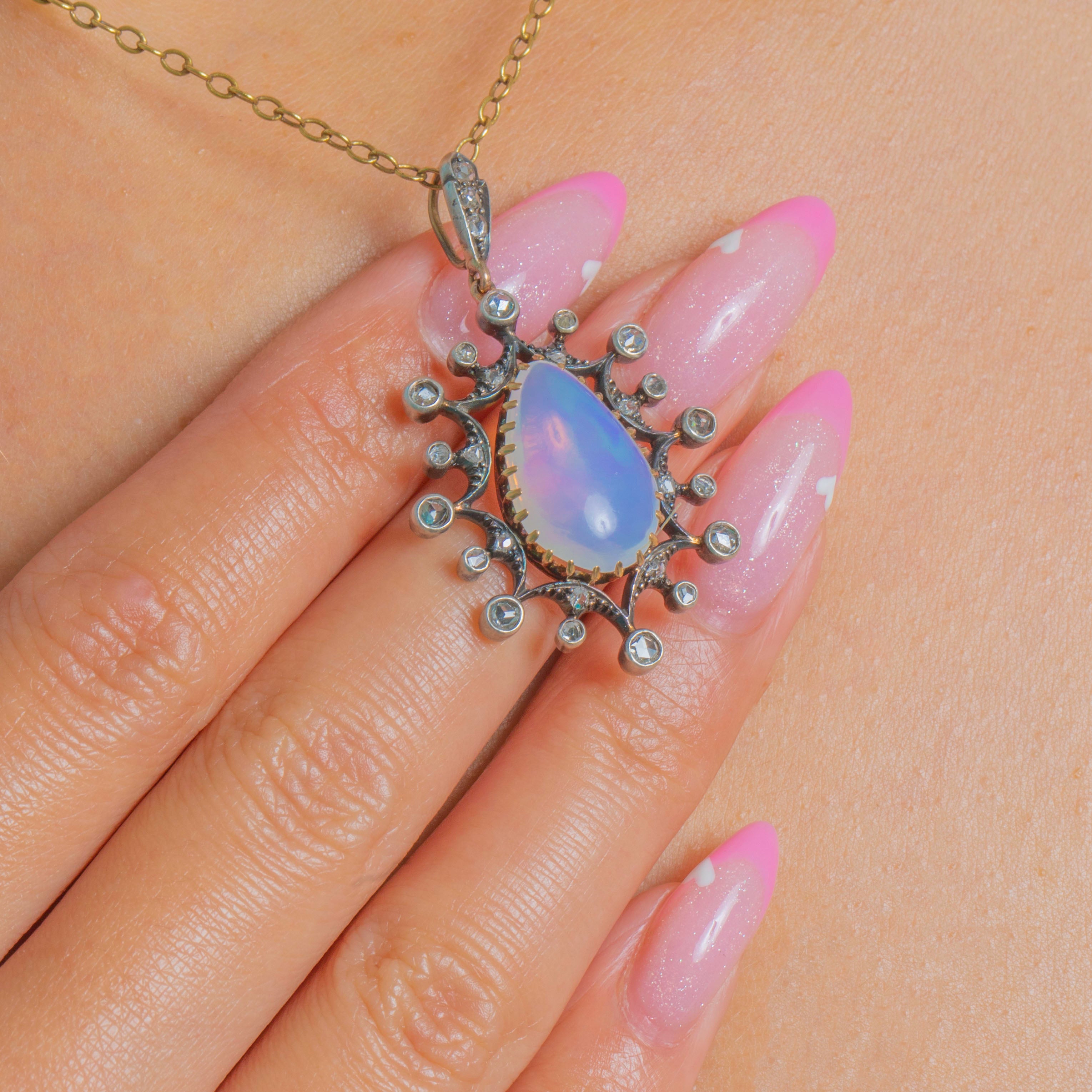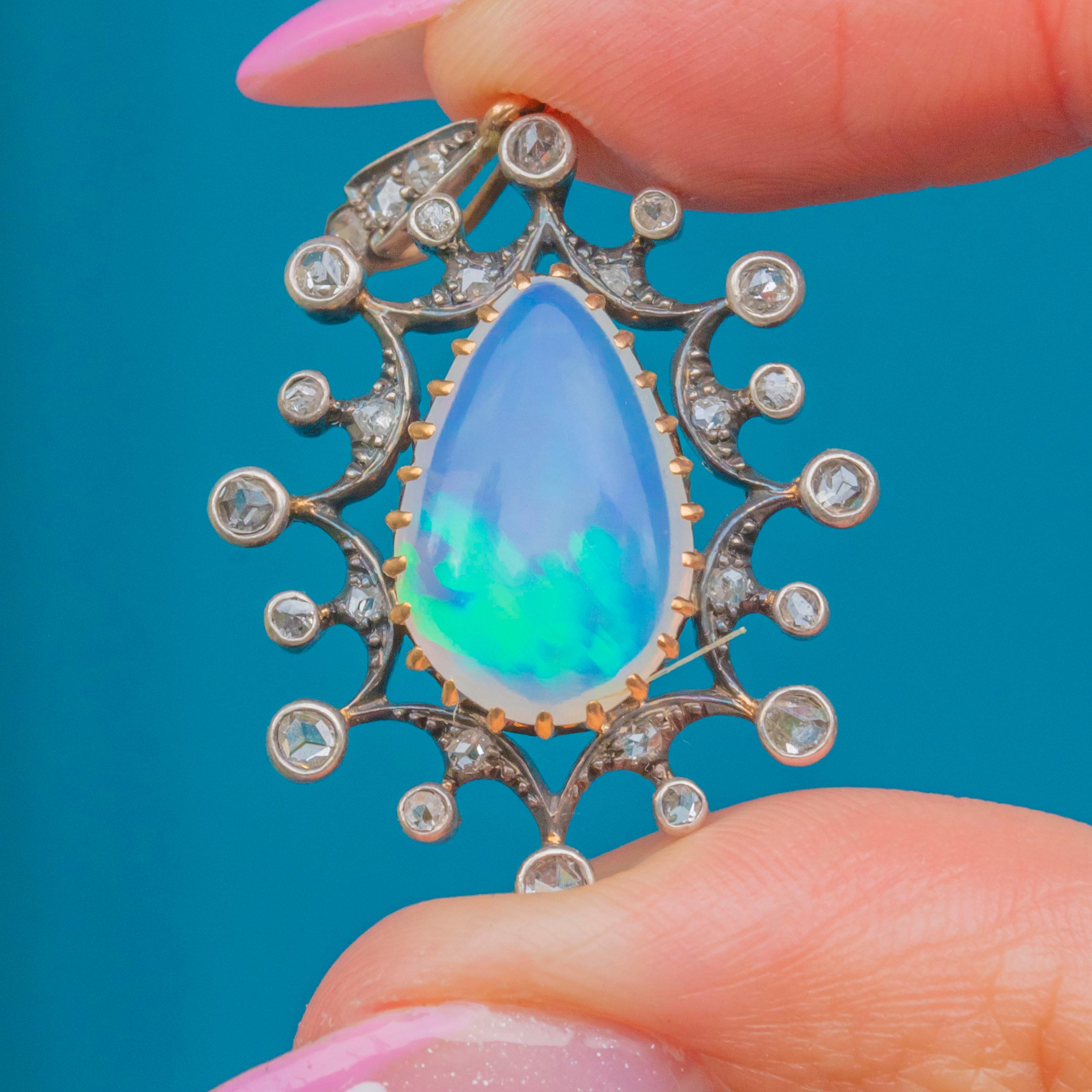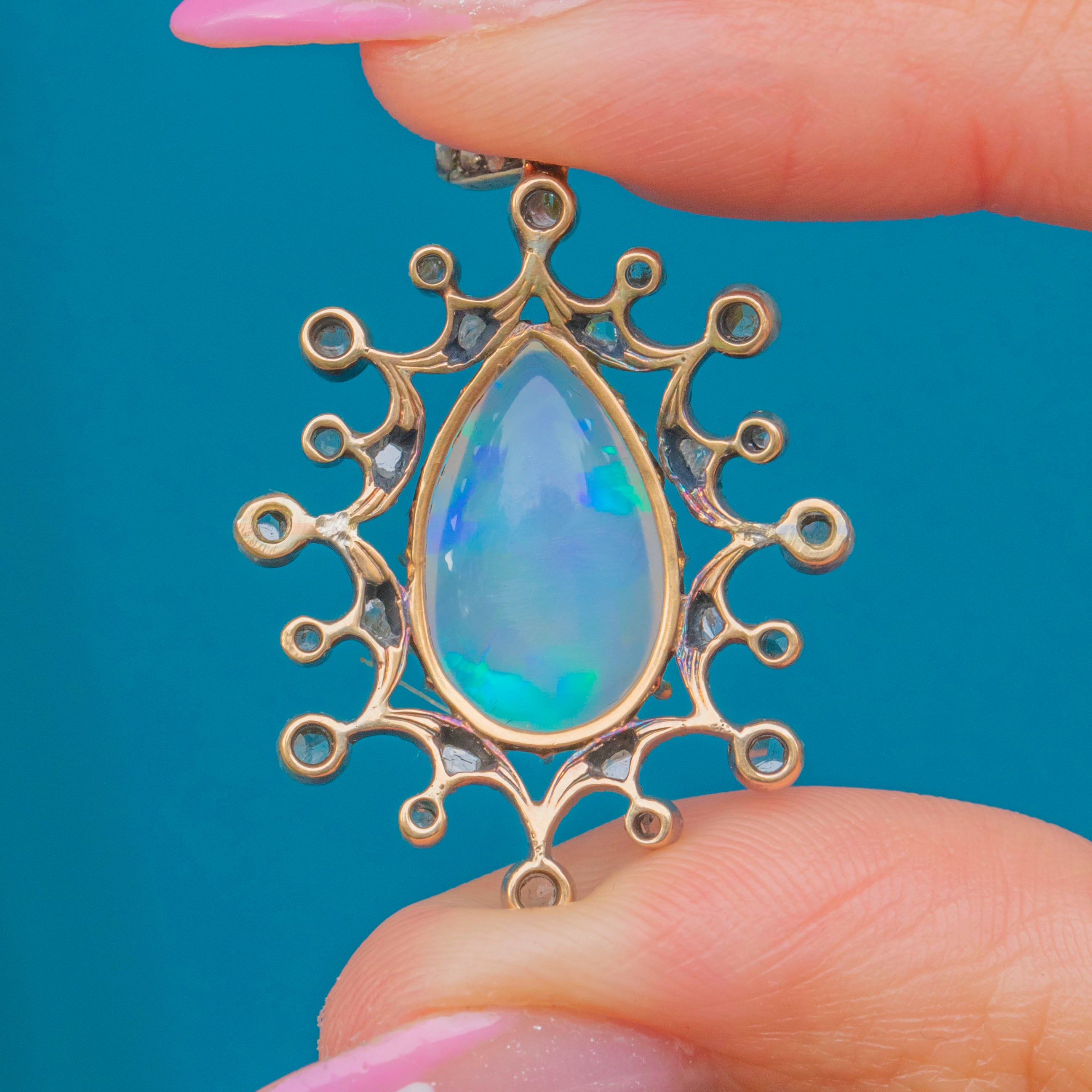 An exquisite Victorian Opal and Diamond pendant, delicately crafted in 15ct Gold and Silver. The vibrant natural Opal, estimated at 1.70cts, shimmers with a kaleidoscope of colour, displaying striking flashes of green, blue and orange.