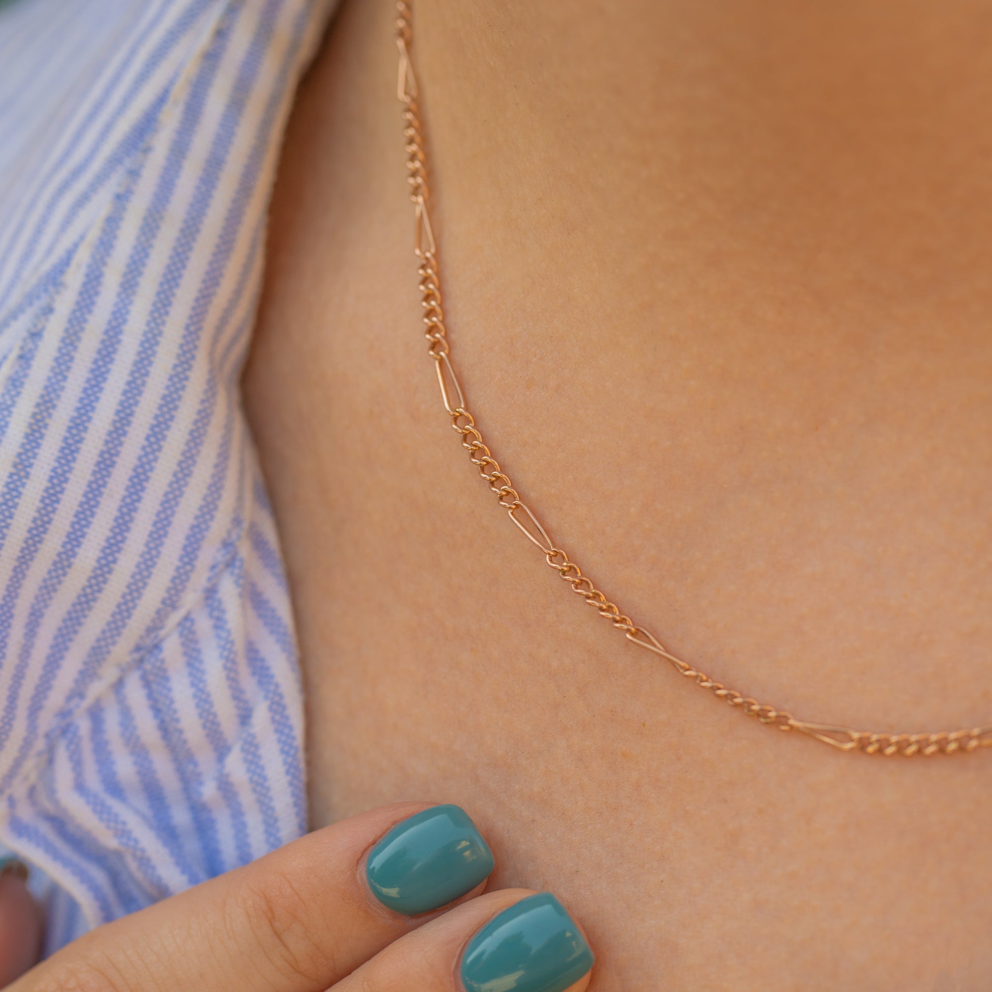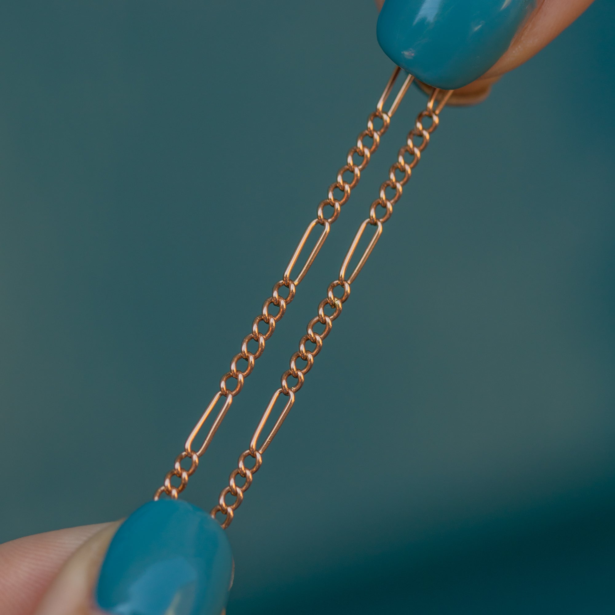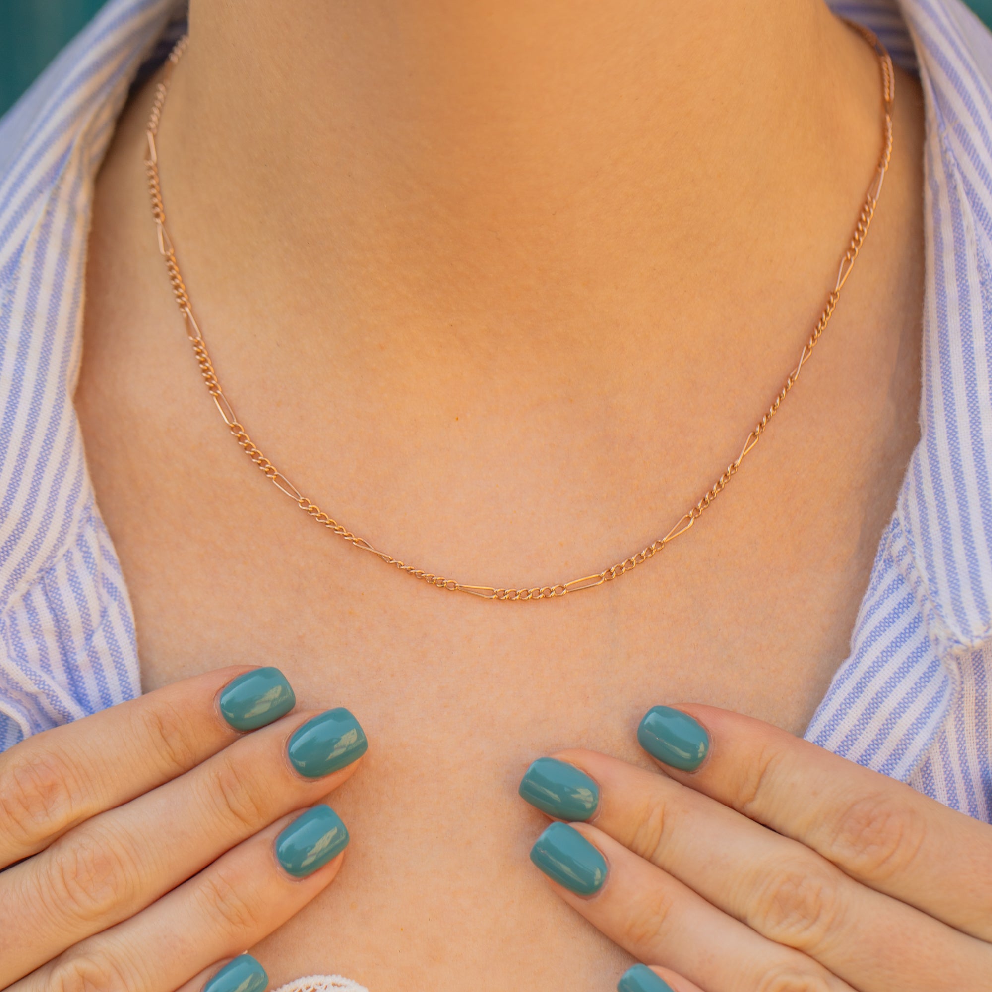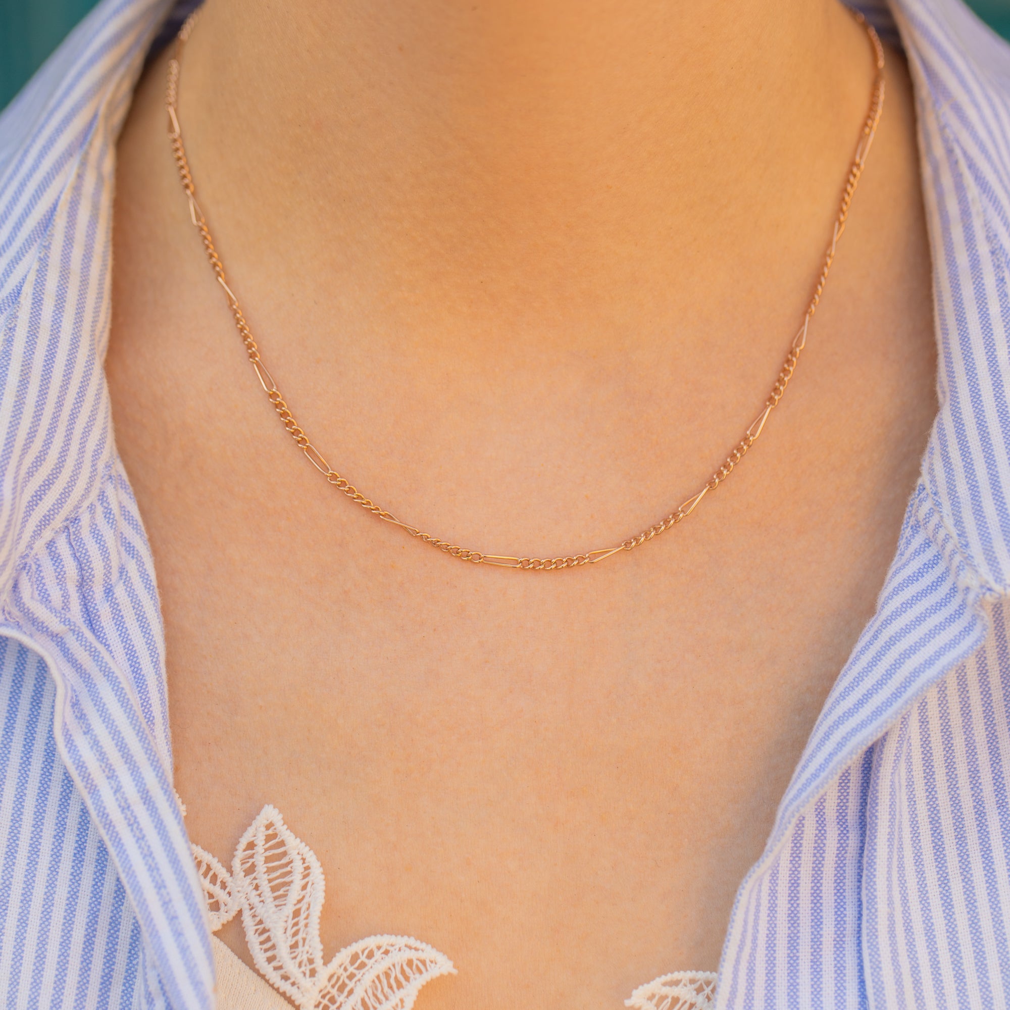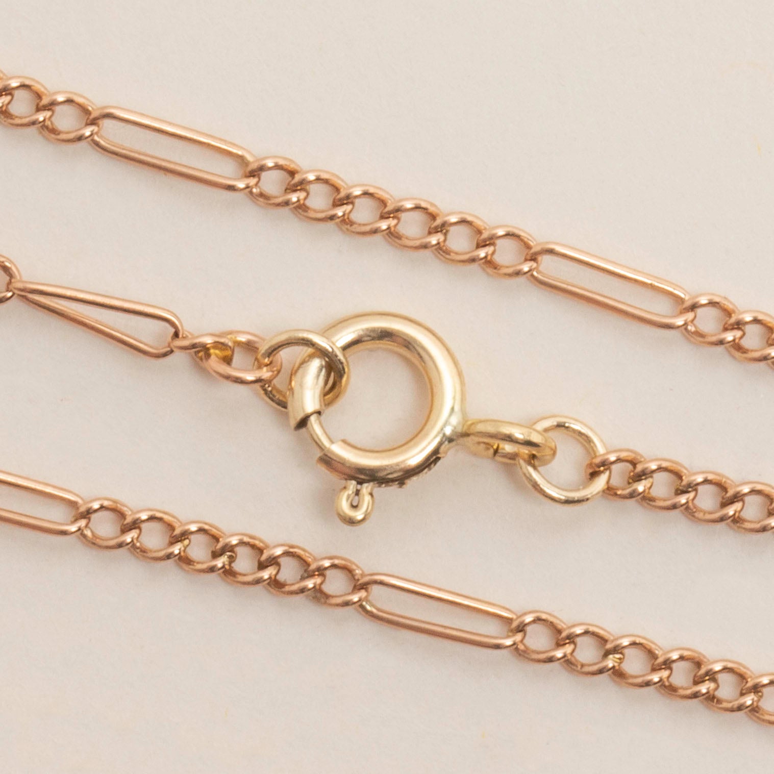A splendorous 16.5" antique 9ct Gold Figaro chain to add to your repertoire! Crafted from sun-kissed and saturated 9ct rosey Gold, she features alternating longer and shorter curb links making her that highly desirable Figaro chain.